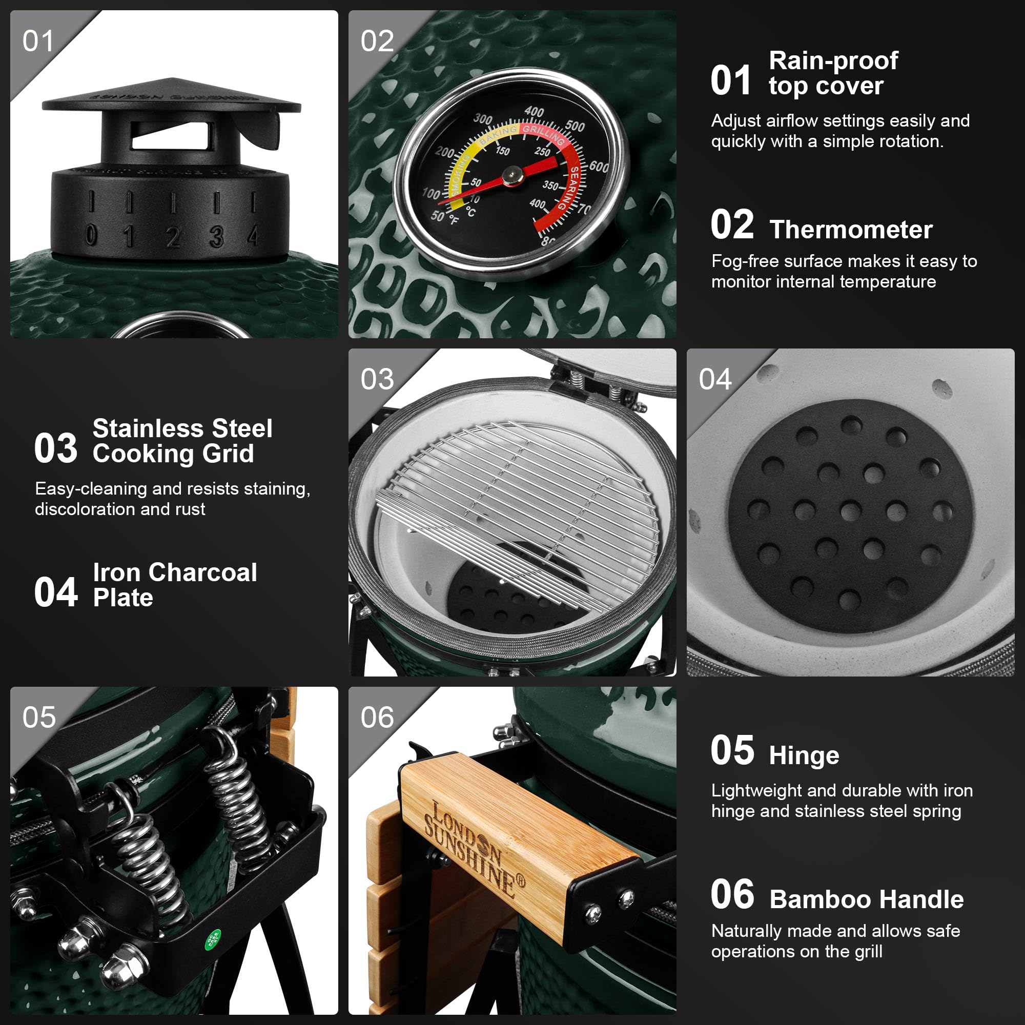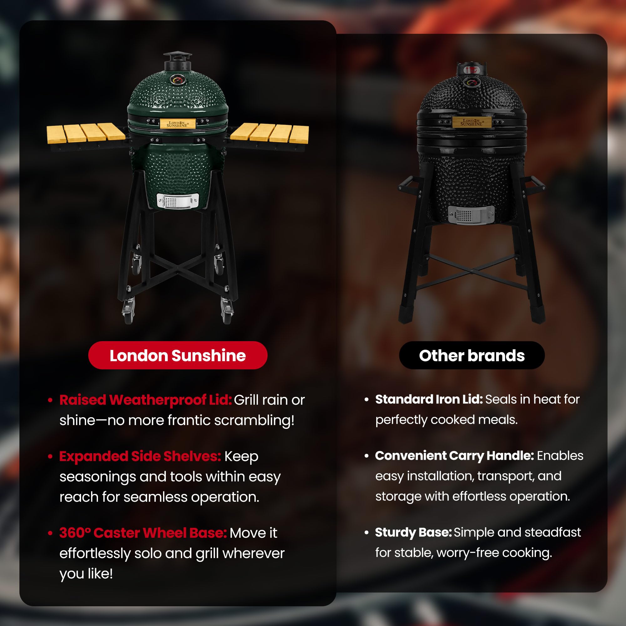 LONDON SUNSHINE CERAMIC KAMADO CHARCOAL BBQ GRILL - The Junior Pro Series 15.4" Ceramic Body with 13.2" Stainless Steel Grill, Locking Casters & Foldable Side Shelves Discover the perfect compact Kamado grill, now upgraded to the Junior Pro Series for unparalleled convenience and versatility. Featuring a robust 15.4-inch ceramic body and a precise 13.2-inch cooking surface, this grill is ideal for small families or intimate gatherings. The latest enhancements—locking casters for effortless mobility and stability, and foldable side shelves for added prep space—make it the ultimate all-in-one outdoor cooking solution. A high-quality glass fiber gasket ensures a perfect seal, locking in smoke and flavor for truly authentic BBQ results. Freestanding and classically designed with a brilliantly glazed colorful body, this grill is more than just a tool—it's the centerpiece of your backyard paradise. The Origin Of Kamado The name KAMADO originates from an ancient cooking tradition dating back over 3,000 years. “KAMADO” is the Japanese word for “stove,” literally meaning “place for the cauldron.” It represents a simple yet incredibly efficient method of cooking food to perfection. Advantage of Our Ceramic Kamado Grill Superior Heat Management: The unique egg shape promotes excellent heat circulation, ensuring food is cooked evenly. The thick ceramic walls retain moisture for juicier results. Exceptional Heat Retention: The massive heat storage capacity allows for consistent low-and-slow smoking or high-heat searing. The built-in thermometer lets you monitor the temperature with ease. Unmatched Versatility: Master every cooking method—Grilling, Searing, Baking, and Smoking—in any season. New Premium Features: Locking casters make moving your grill safe and simple, while the foldable side shelves provide essential workspace that stows away neatly. SPECIFICATIONS Ceramic Body Diameter: 39 cm / 15.4 inch Cooking Grid Diameter: 33.5 cm / 13.2 inch Assembled Dimension (LWH): Approx. 50 * 53 * 85 cm Package Dimension (LWH): 71 * 49 * 65.5 cm Net Weight: 46 kg Gross Weight: 50 kg PREMIUM MATERIALS & CONSTRUCTION Top Vent: Heavy-Duty Cast Iron for precise airflow control. Handles & Hardware: Heavy Iron construction for durability and safety. Stand & Band: Heavy-Duty Iron stand with integrated Locking Casters for stability and mobility. Cooking Grates: 13.2" Stainless Steel (6mm Wire), foldable on one side for easy charcoal addition. Fire Box & Ceramic Body: High-grade ceramic resistant to 1000° Celsius. Gasket: High-Temperature Glass Fiber for an superior seal. New Additions: Integrated Foldable Side Shelves.