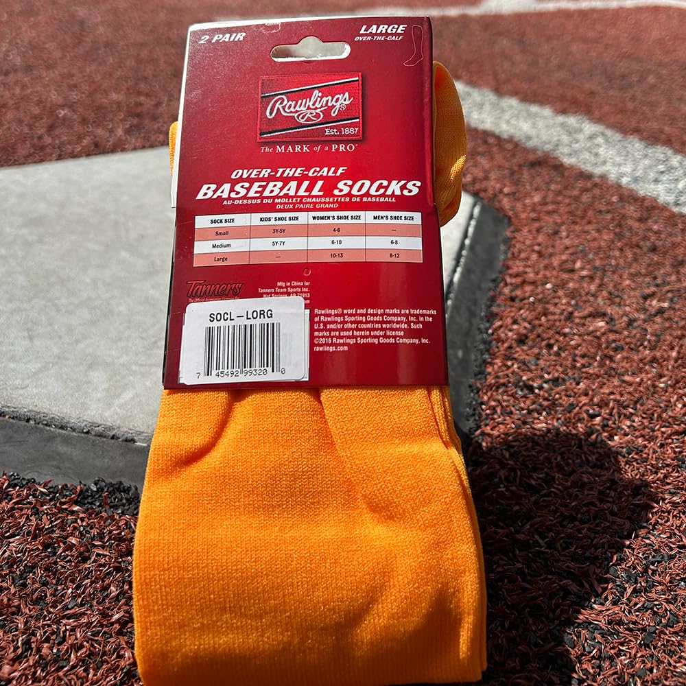 Description Rawlings Over-The-Calf socks.Available in three sizesSock SizeKids Shoe SizeWomens Shoe SizeMens Shoe SizeSmallY-5Y4-6--Medium5Y-7Y6-106-8Large--10-138-12