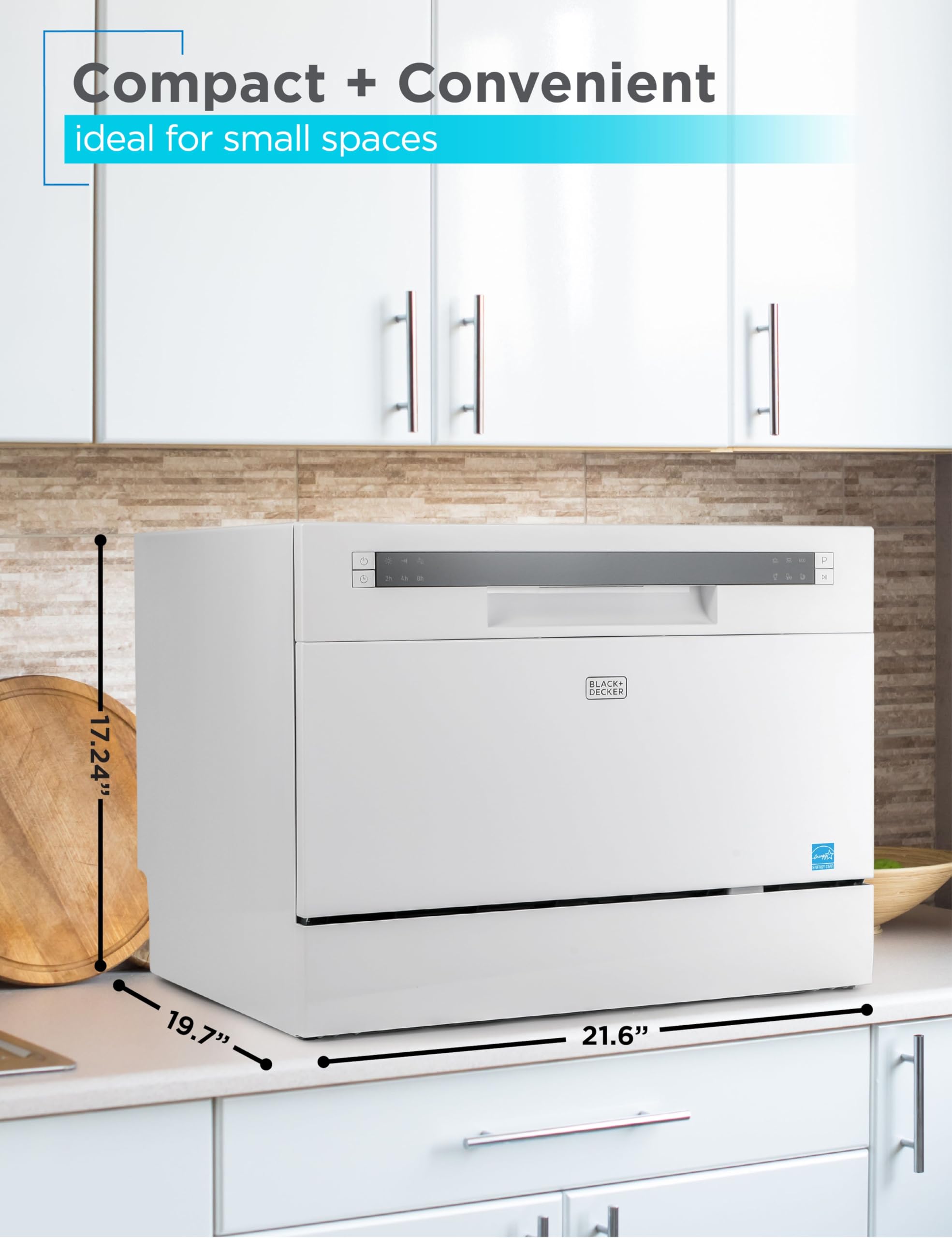 Six Place Setting Capacity: Our counter top dishwasher can fit 6-place settings and more at once including dinner plates up to 10", bowls, glasses, cups, cutlery and serving platters.