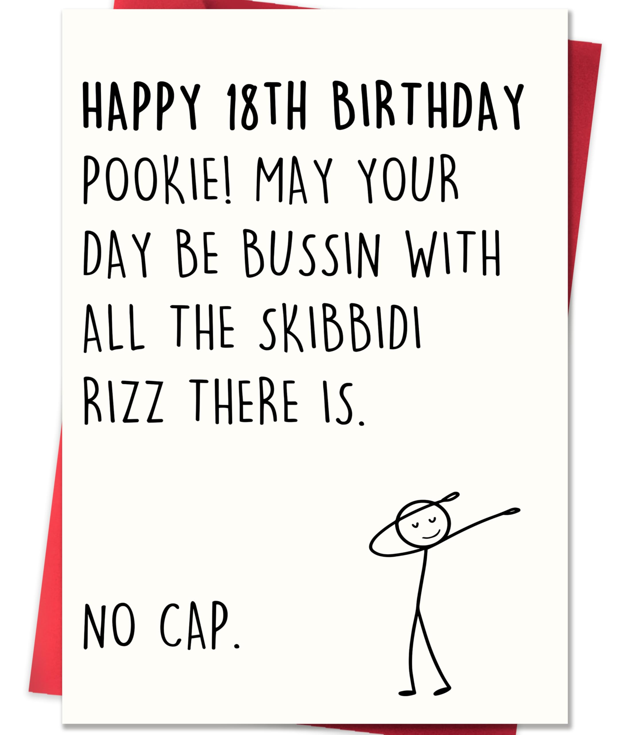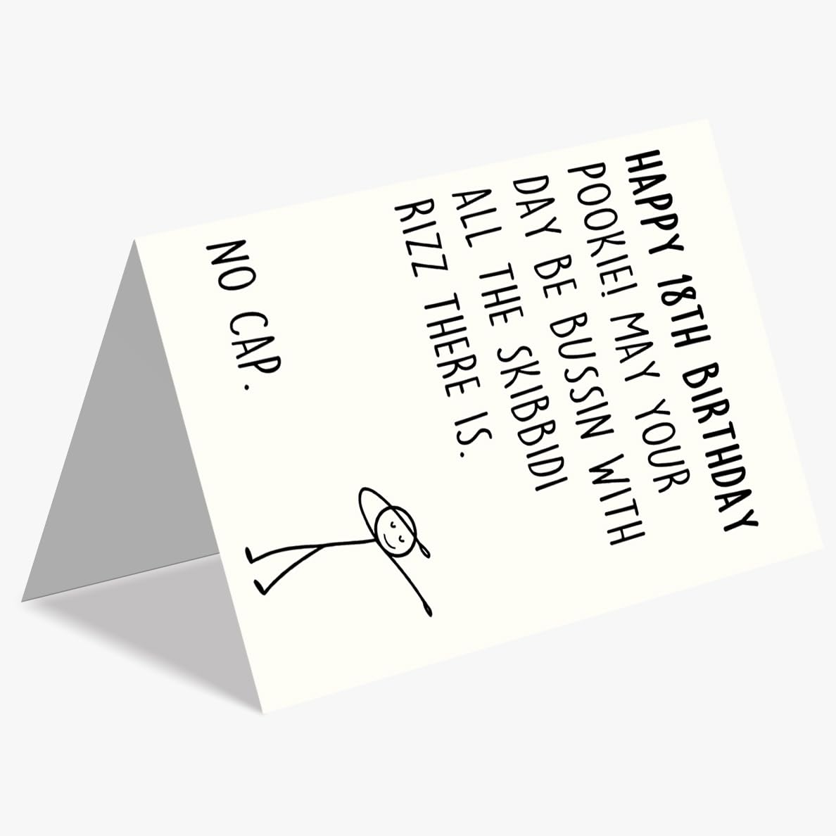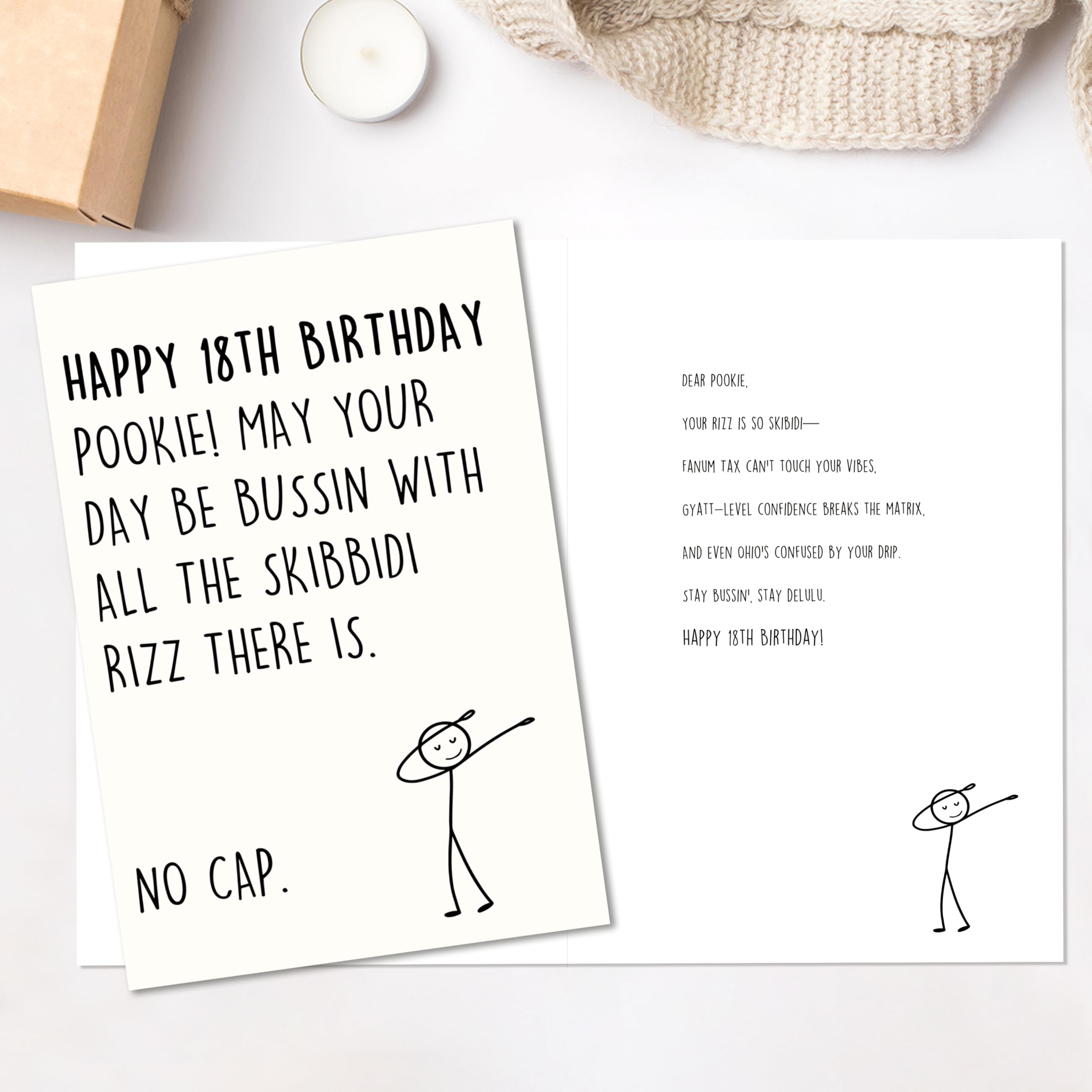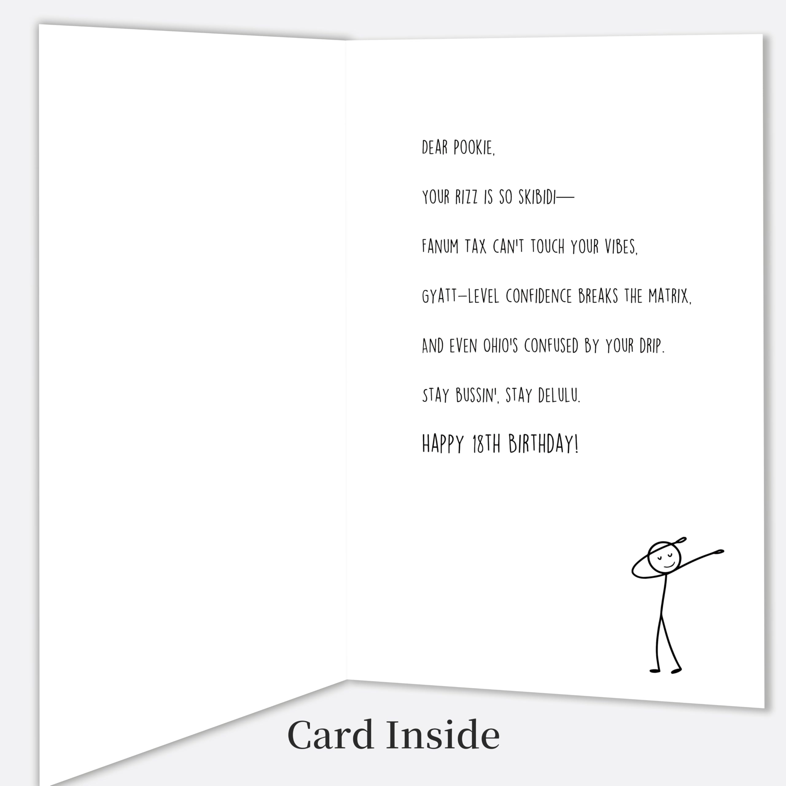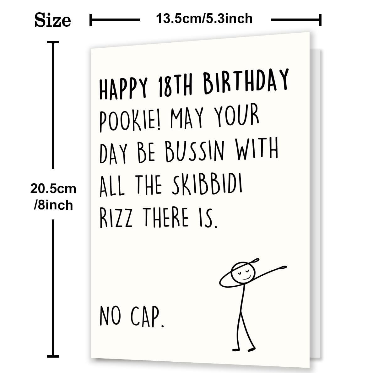 Funny 18th Birthday Card:Celebrate their Gen Z vibe: Packed with trending slang like “Pookie,” “Bussin,” and “Skibbidy Rizz,”instantly recognized by Gen Z! This 18th birthday card speaks directly to teenagers, blending hilarious meme humor with heartfelt birthday wishes. Perfect for making 18th feel seen and hyped on their big day!