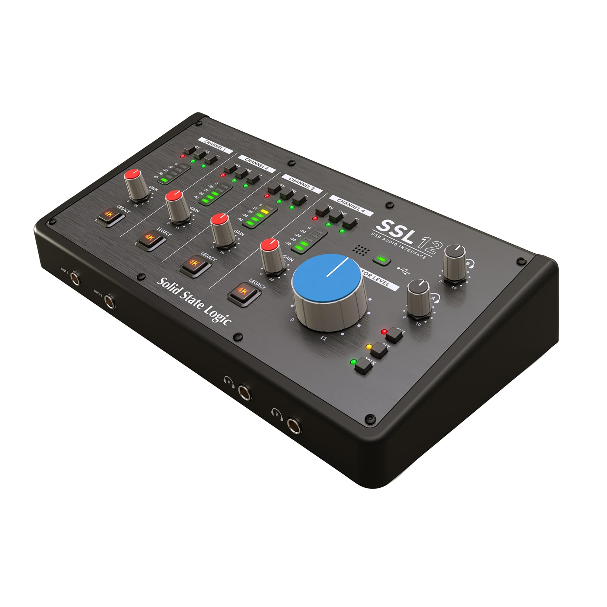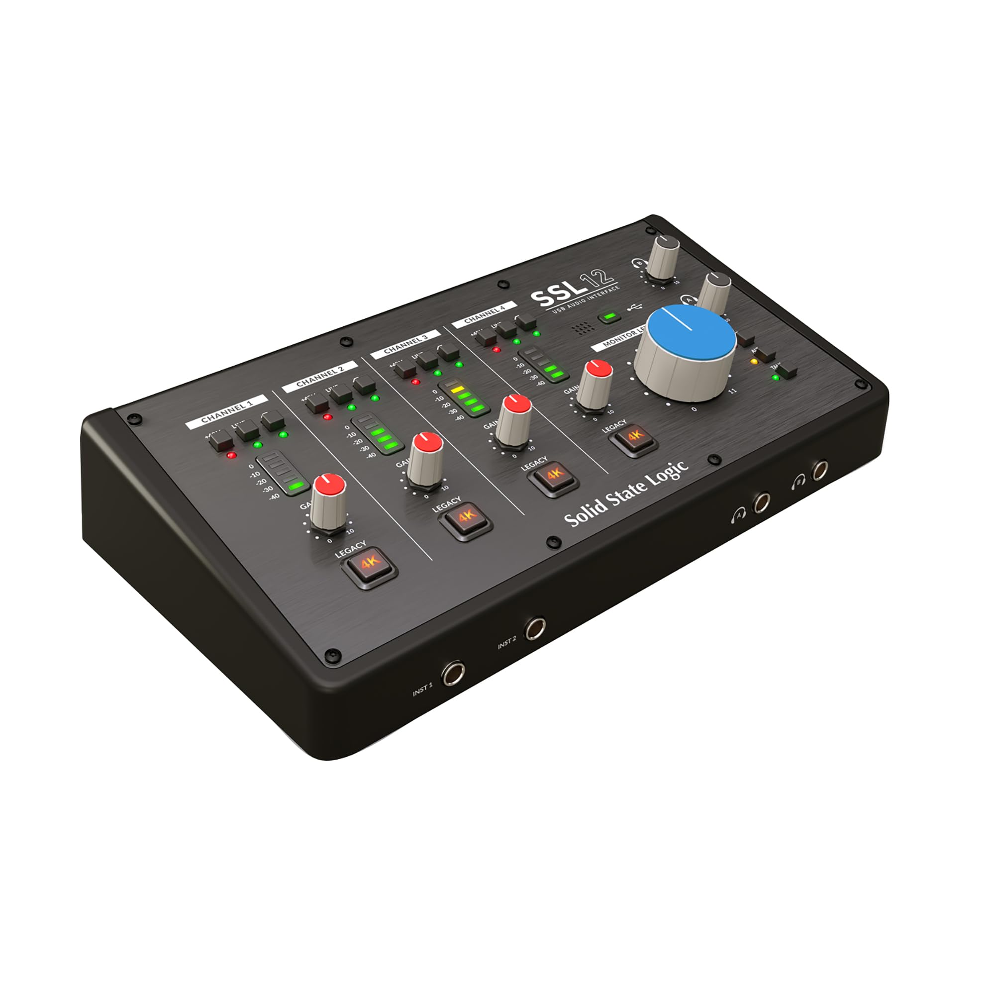 The SSL 12 is a 12-in/8-out USB bus-powered audio interface that enables you to get studio-quality audio into and out of your computer with minimal fuss and maximum creativity. Building upon the success of SSL 2 and SSL 2+, SSL 12 gives you more. More I/O, more performance and more versatility. SSL 12 is fully integrated with SSL 360° software: Your SSL Control Room. Here you can assign monitor controls, create multiple independent headphone mixes, choose your Loopback source, customize the 3 front panel user-buttons and much more. SSL 12 presents a combination of professional features and workflow never seen before in a portable desktop interface. With a feature set to rival many larger devices, the SSL 12 is desktop in size but rackmount by nature.