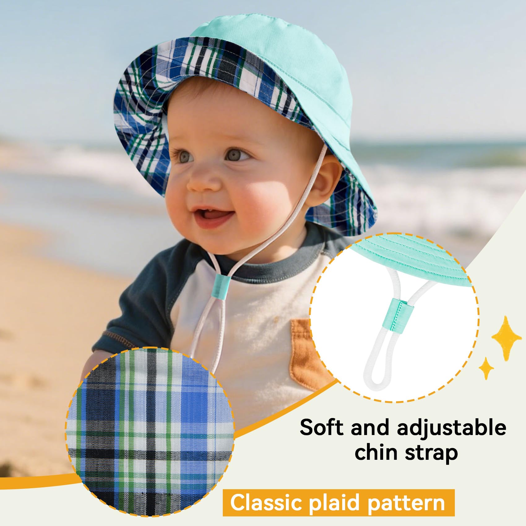 Stylish & Practical:This baby hat blends practicality with fashionable elements. The cute pattern on the top and the brim flipped up to reveal classic plaid elements make your baby's summer ensemble stand out. The lightweight and foldable feature is perfect for parents to take their baby out for swimming, beach play, traveling, camping and picnicking