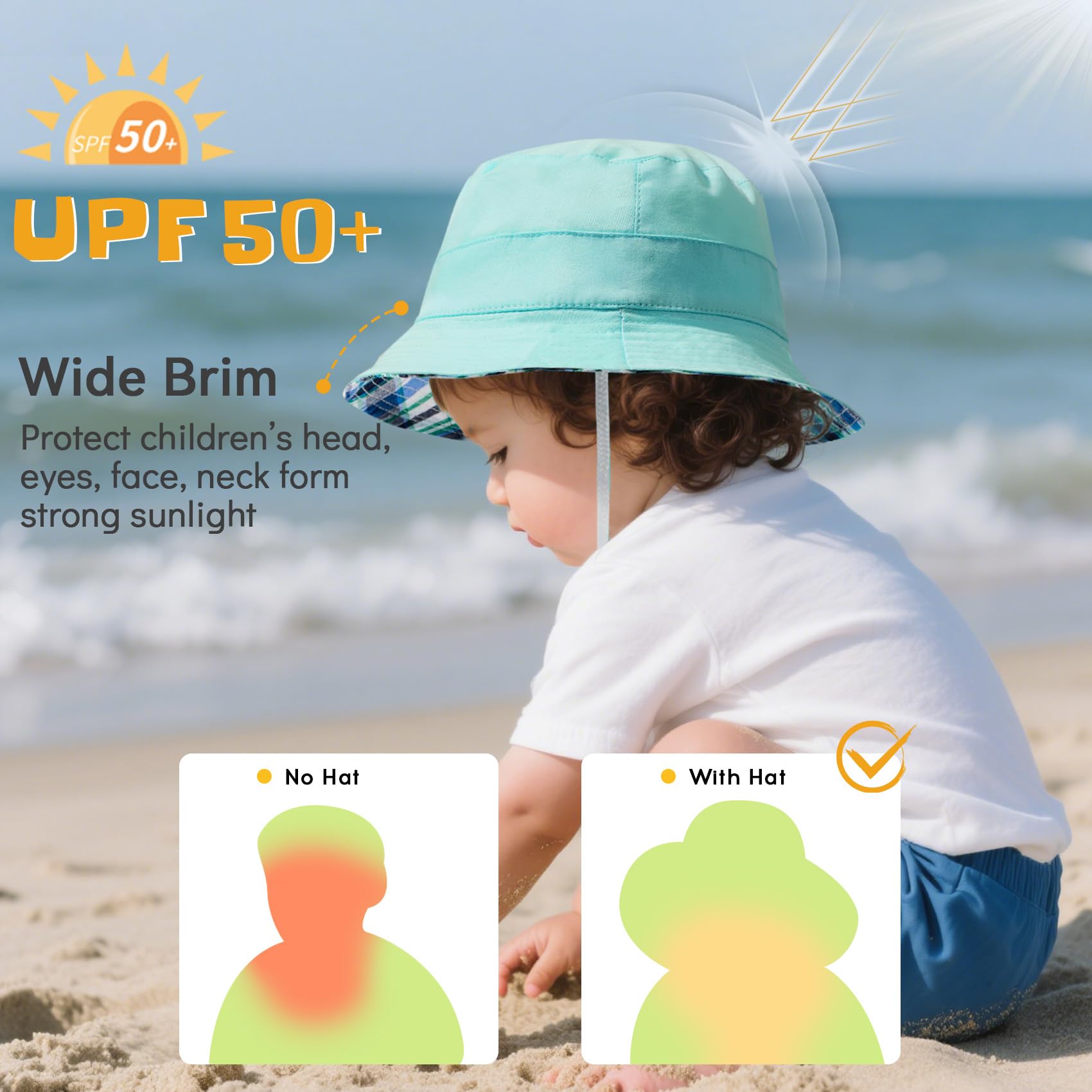 Sun Protection:Its wide brim can easily cover toddler's head, eyes, face and neck and even shoulders, whether it's at the beach, park, outdoor pool, fully meet your baby's sun protection needs in the outdoors, all-weather UPF 50+ protection for children, blocking up to 95% of UVA and UVB ultraviolet rays