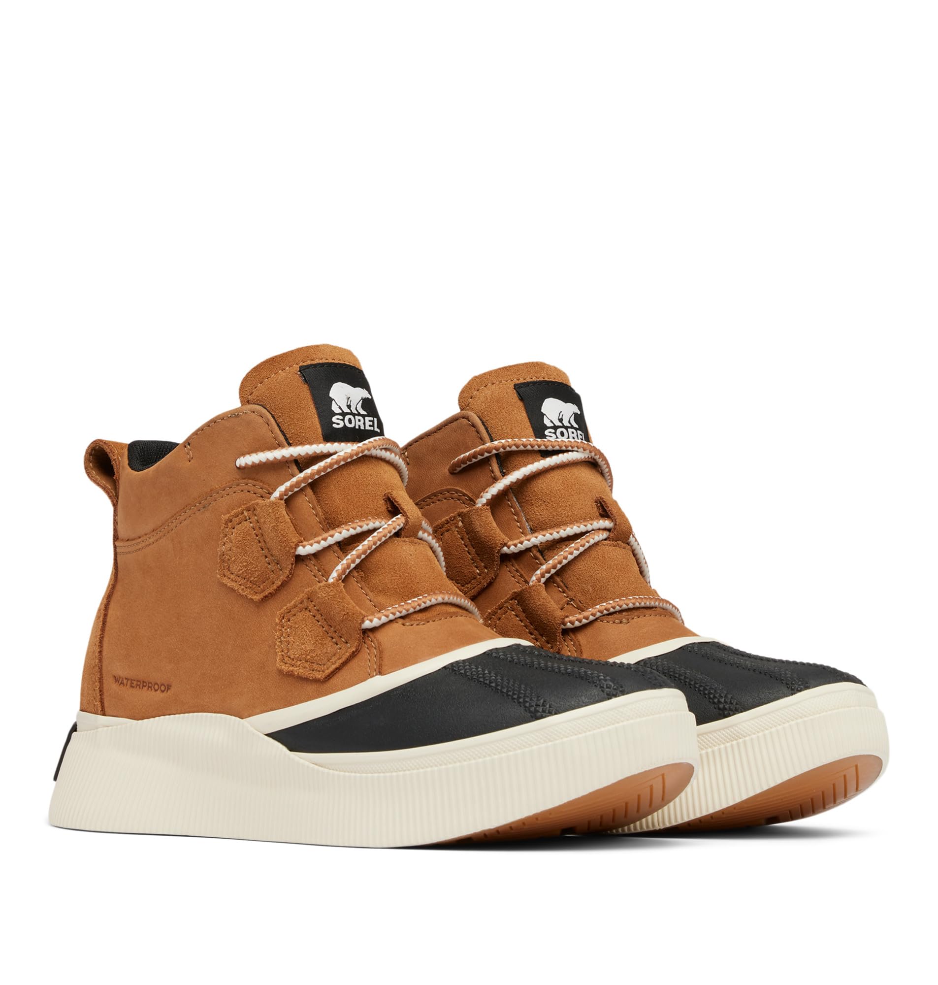 Full grain leather and suede upper. Heel pull tab. Lace closure. Textile lining. Waterproof bootie construction. Waterproof vulcanized rubber shell. Laces are not waterproof.