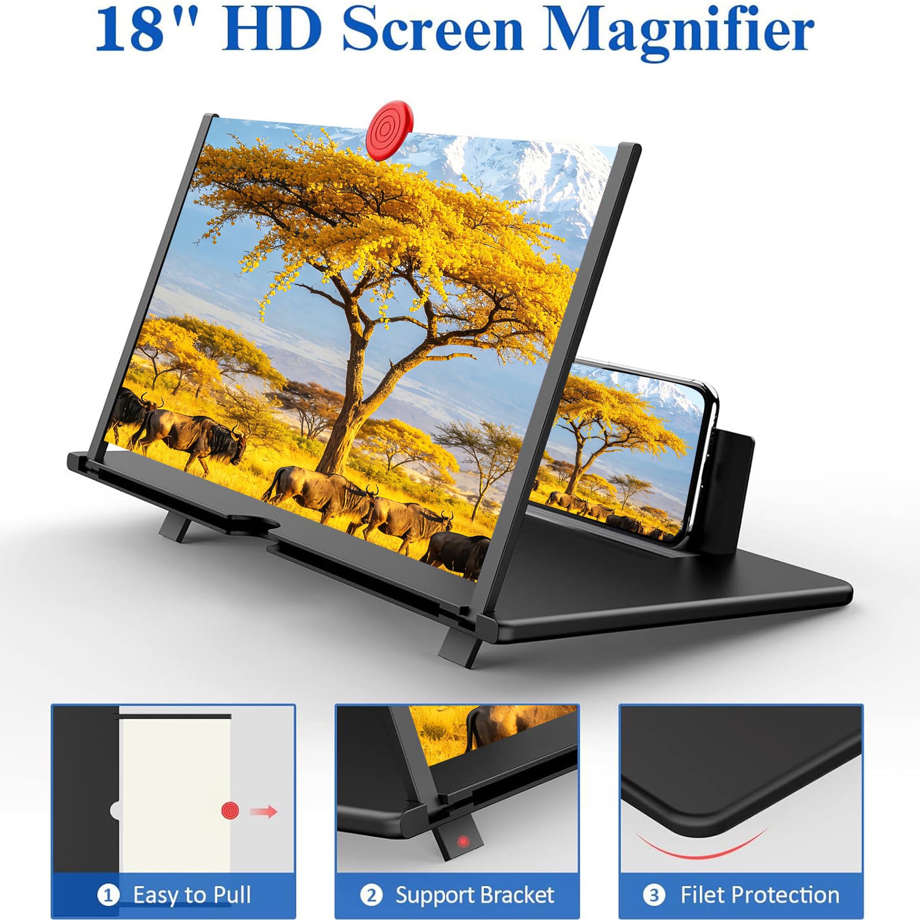 【18-Inch Phone Screen Magnifier】- 2022 new upgraded 18'' 3D screen amplifier with high-resolution optical technology.Can magnify your phone screen 4-6times to keep the distance from your smartphone and protect your eyes. No batteries needed, works with any smartphone. suitable for watching movies, videos, and more on your phone.NOTE:The viewing distance of the amplifier is 2-2.5 meters
