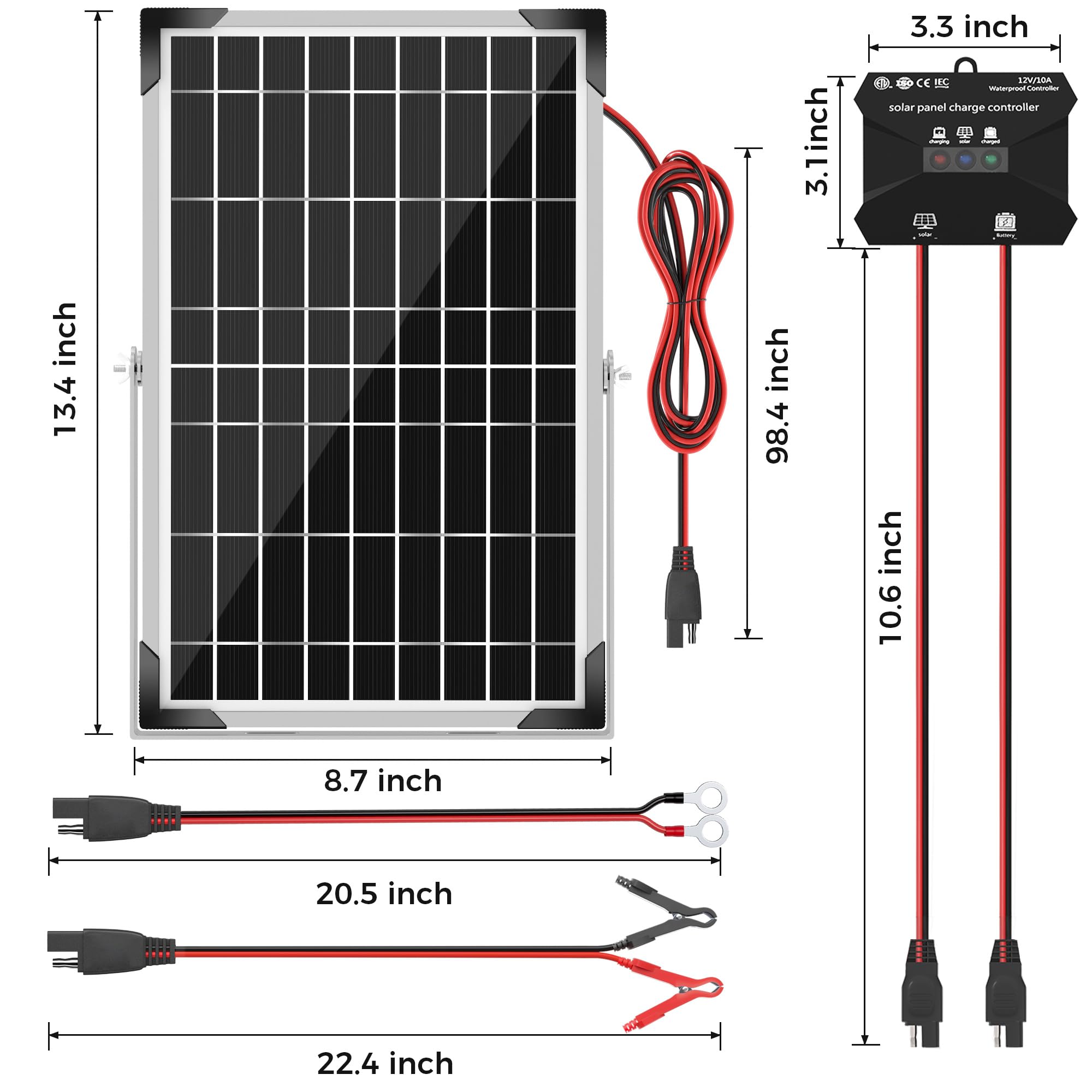 All-In-One Power Kit: This portable solar kit includes everything needed for immediate use: a solar panel, a charger controller, mounting brackets, and connectors (SAE alligator clips and O-rings). It's compatible with various 12V rechargeable batteries such as LiFePO₄, lithium, AGM, SLA, gel, flooded, and wet cell types