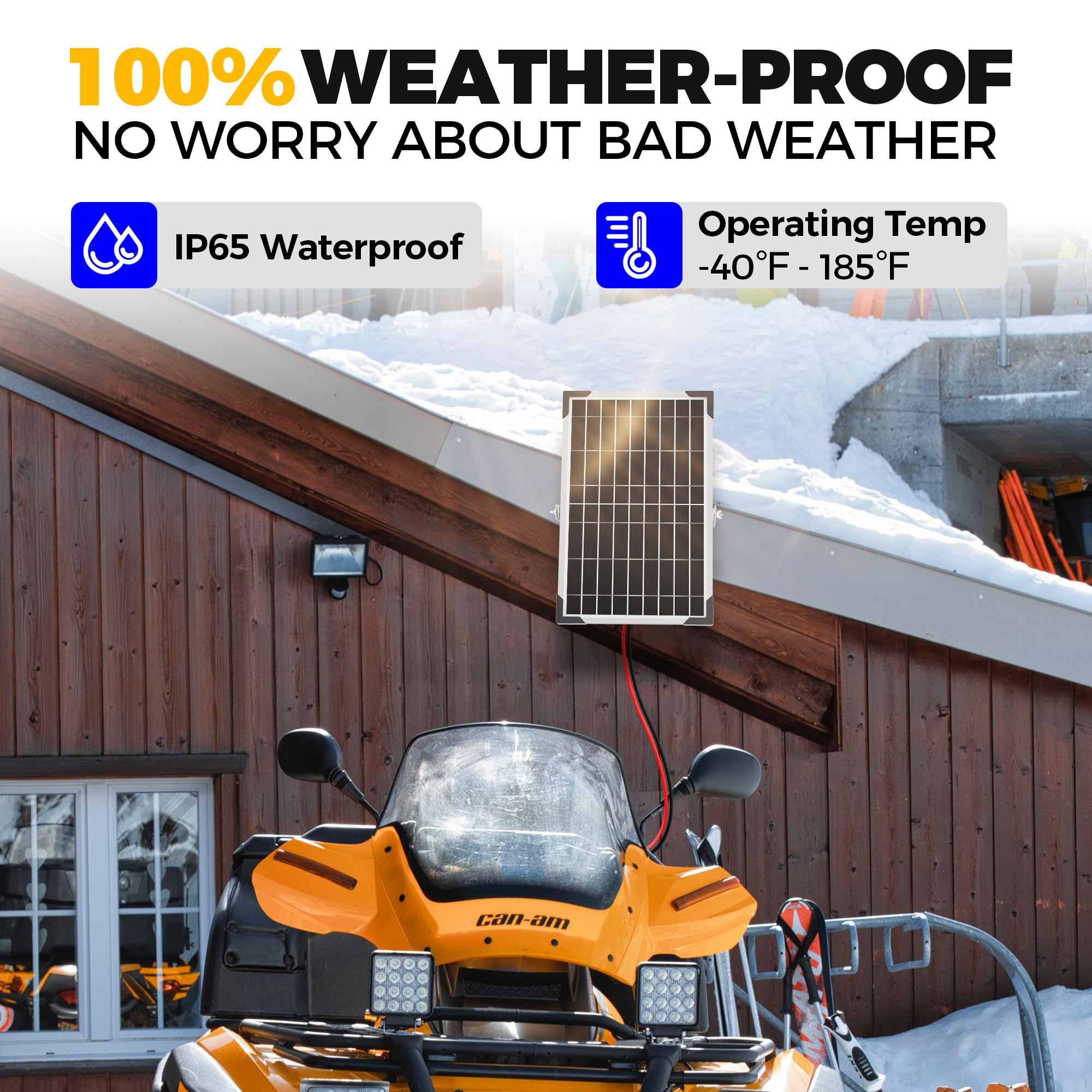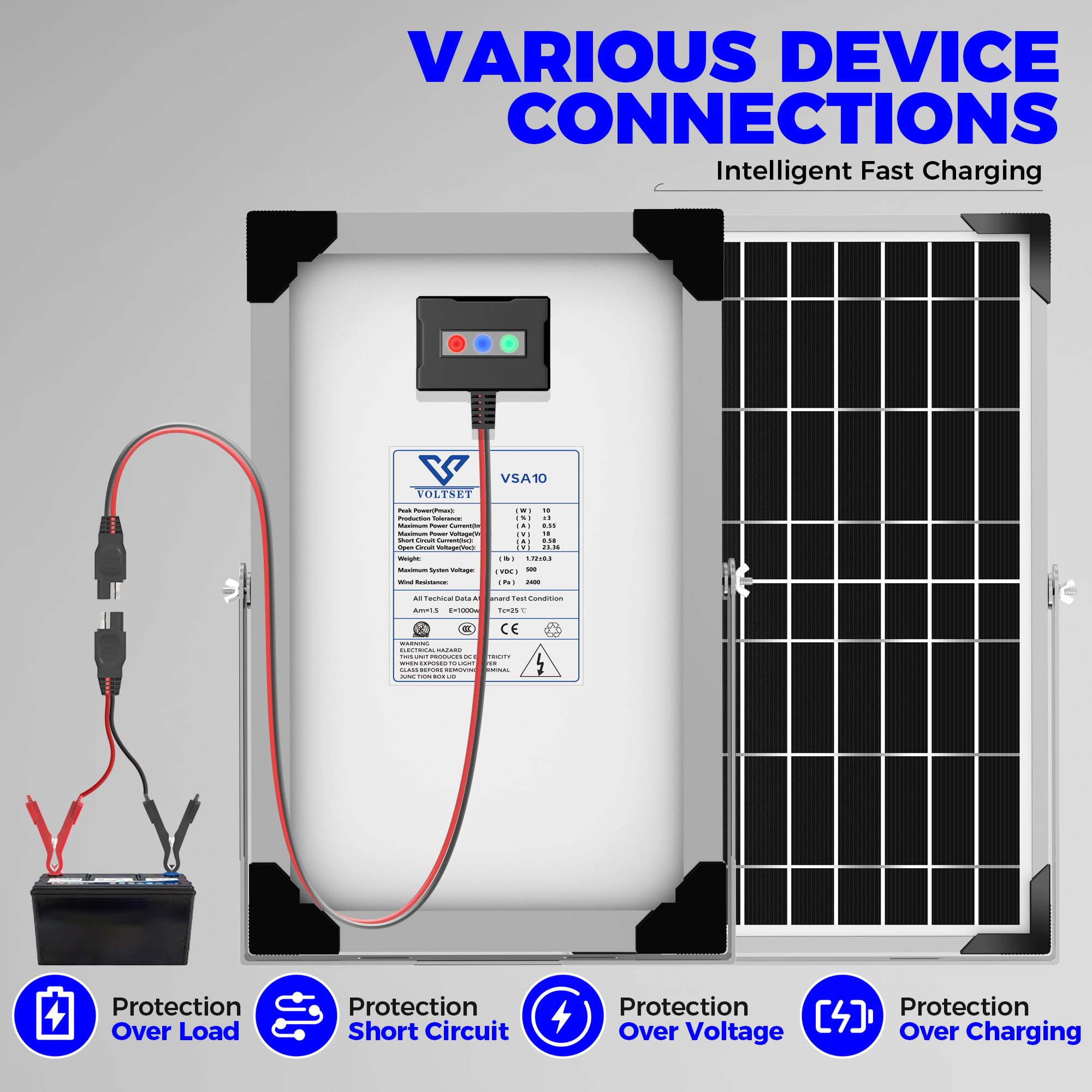 Superior Solar Efficiency: Our 10W solar panel offers a robust solution for outdoor power needs, providing higher conversion efficiency compared to similar-sized polycrystalline and amorphous panels. Ideal for maintaining a 12V battery in prime condition
