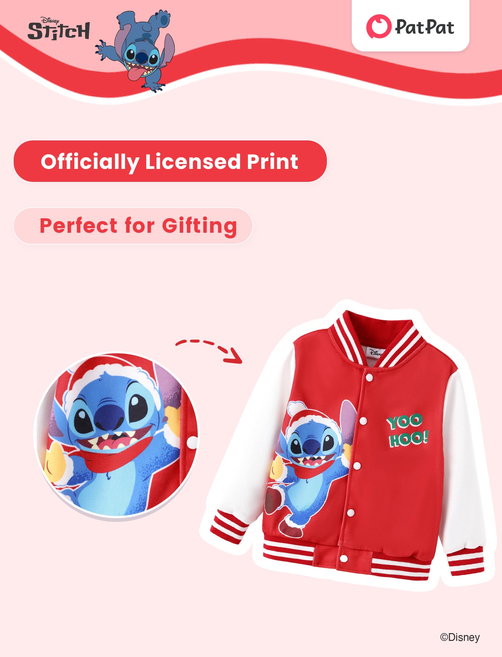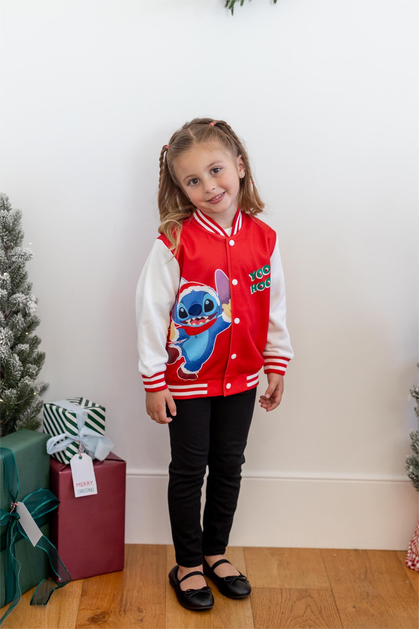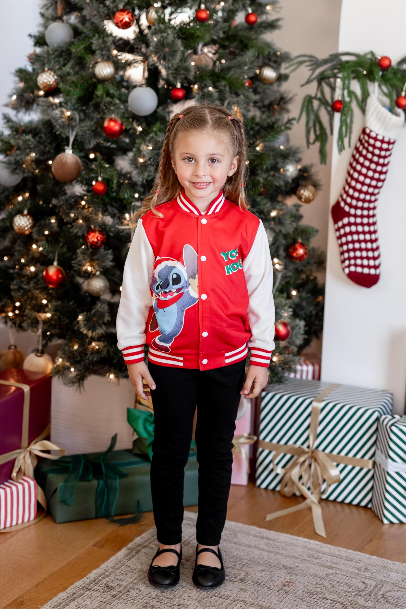 Christmas Cheer Design: Celebrate the season with this Disney Stitch Christmas varsity jacket! Featuring a playful Stitch graphic and a festive "Merry Christmas" message, this red fleece jacket with white sleeves and striped cuffs is perfect for kids aged 3-13. A cozy and fun way to get into the holiday spirit, ideal for Christmas parties, school, and outdoor play