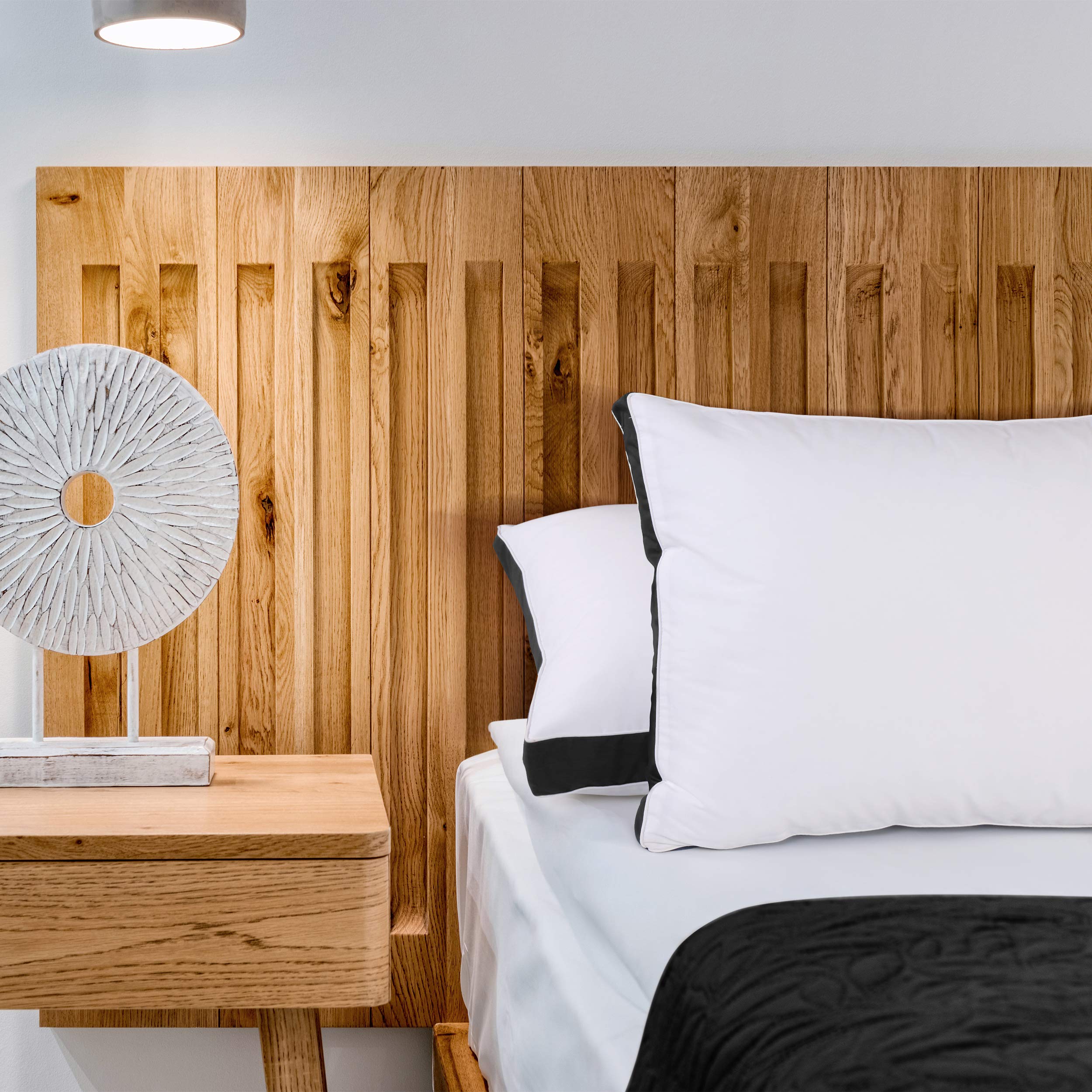 Gusset Bed Pillows – Set of 2 black gusset bed pillows with white piping and double stitching that gives a sophisticated look to the pillows and also improves durability