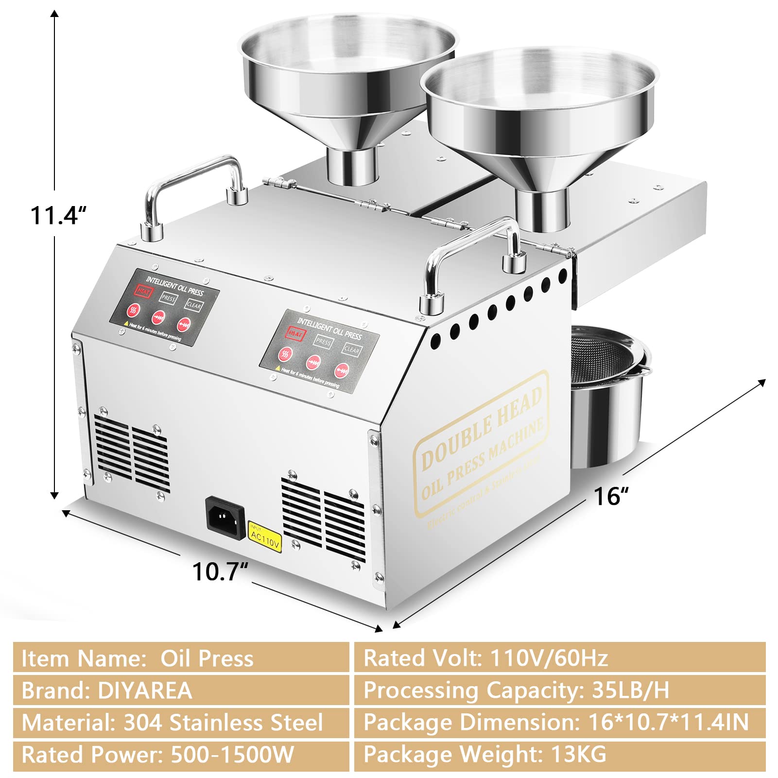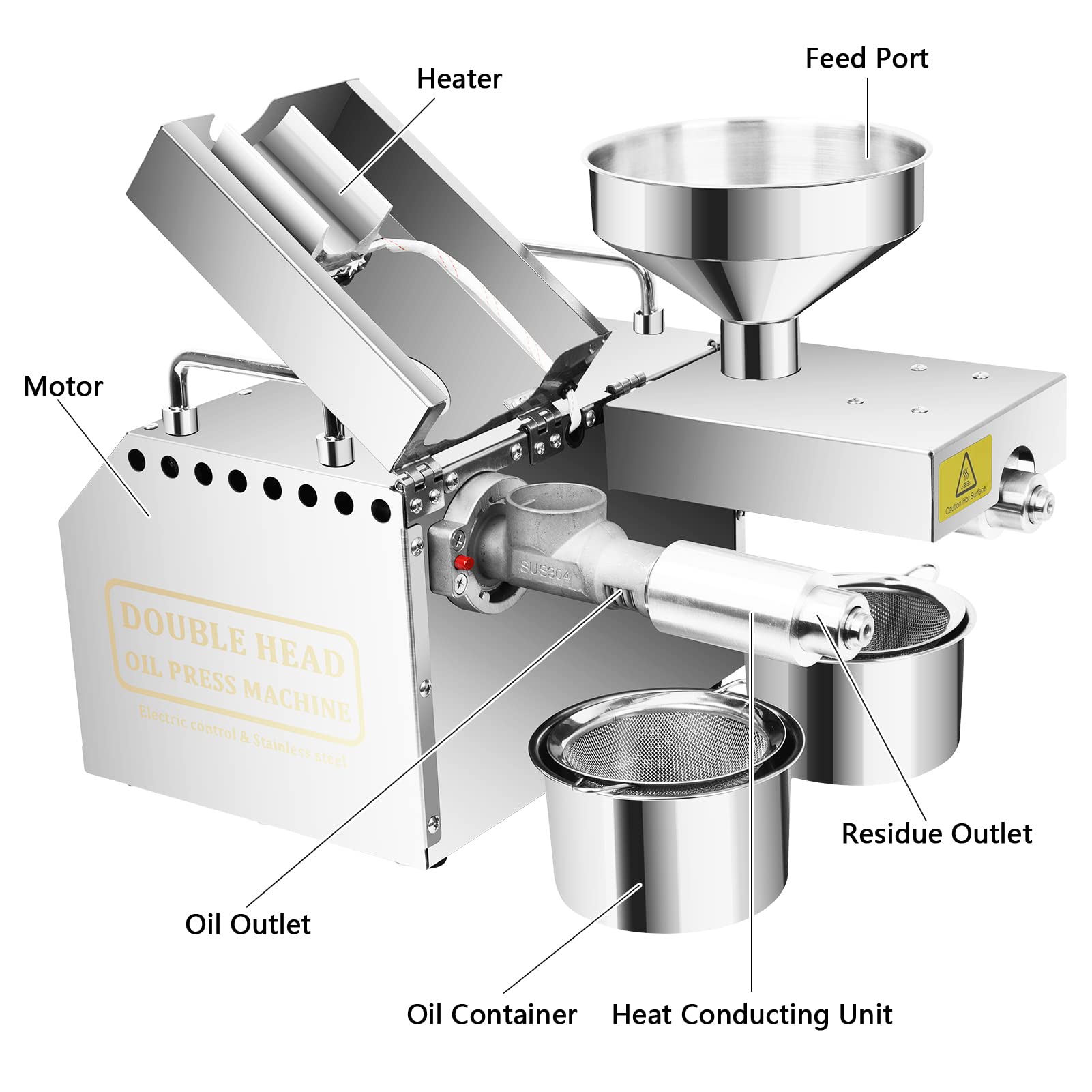 🥦【Double Motors & Double Oil Outlets】 - The SISAYWEY electric oil press machine is equipped with 2 independent powerful 1500W motors, which can not only press different materials at the same time without interfering with each other, but also work independently。