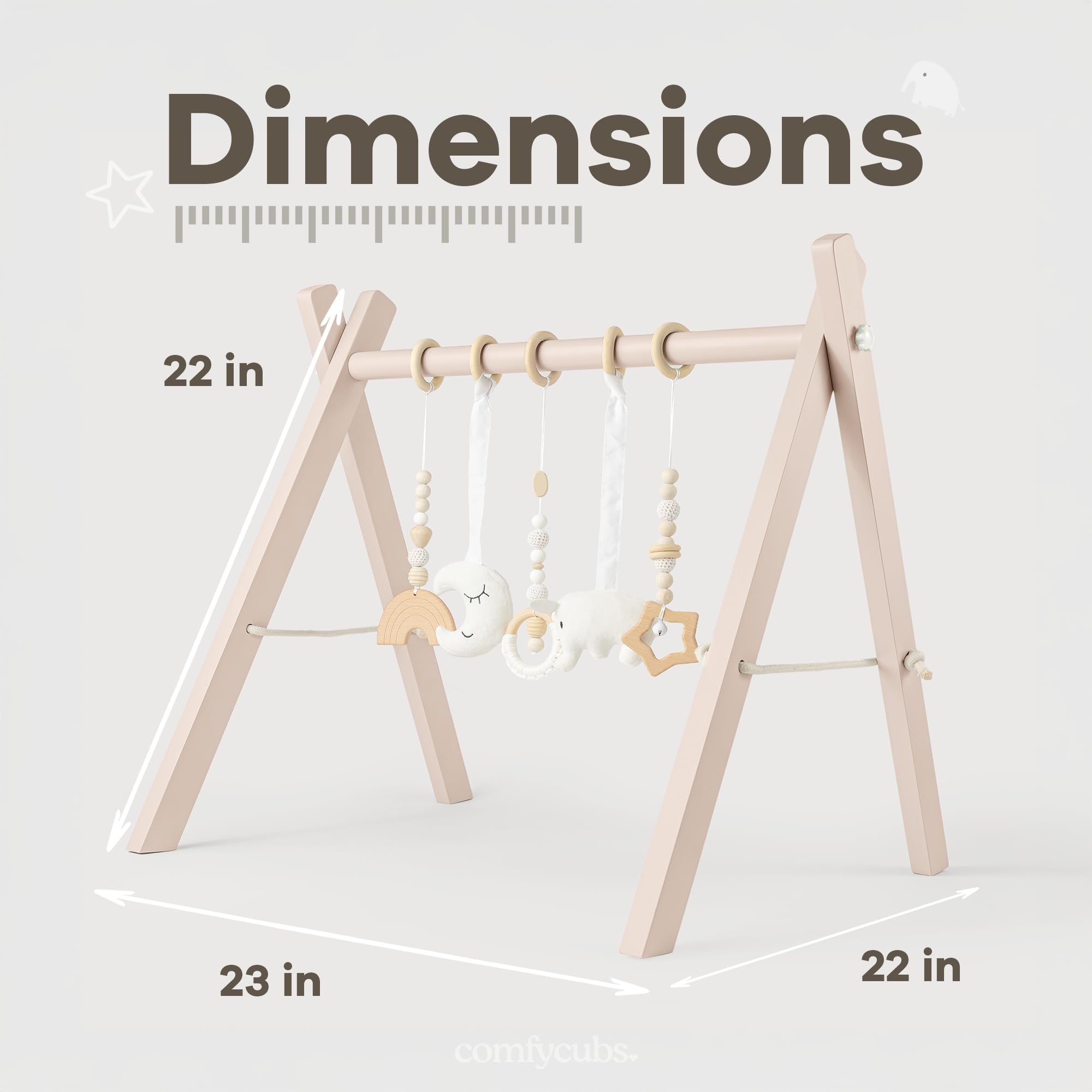 Montessori Play Gym for Toddlers: Comfy Cubs wooden baby gym includes 5 adorable hanging toys in white and wood tones, designed to stimulate your baby’s visual and tactile senses. Helps develop hand-eye coordination and strengthens fine motor skills from an early age.