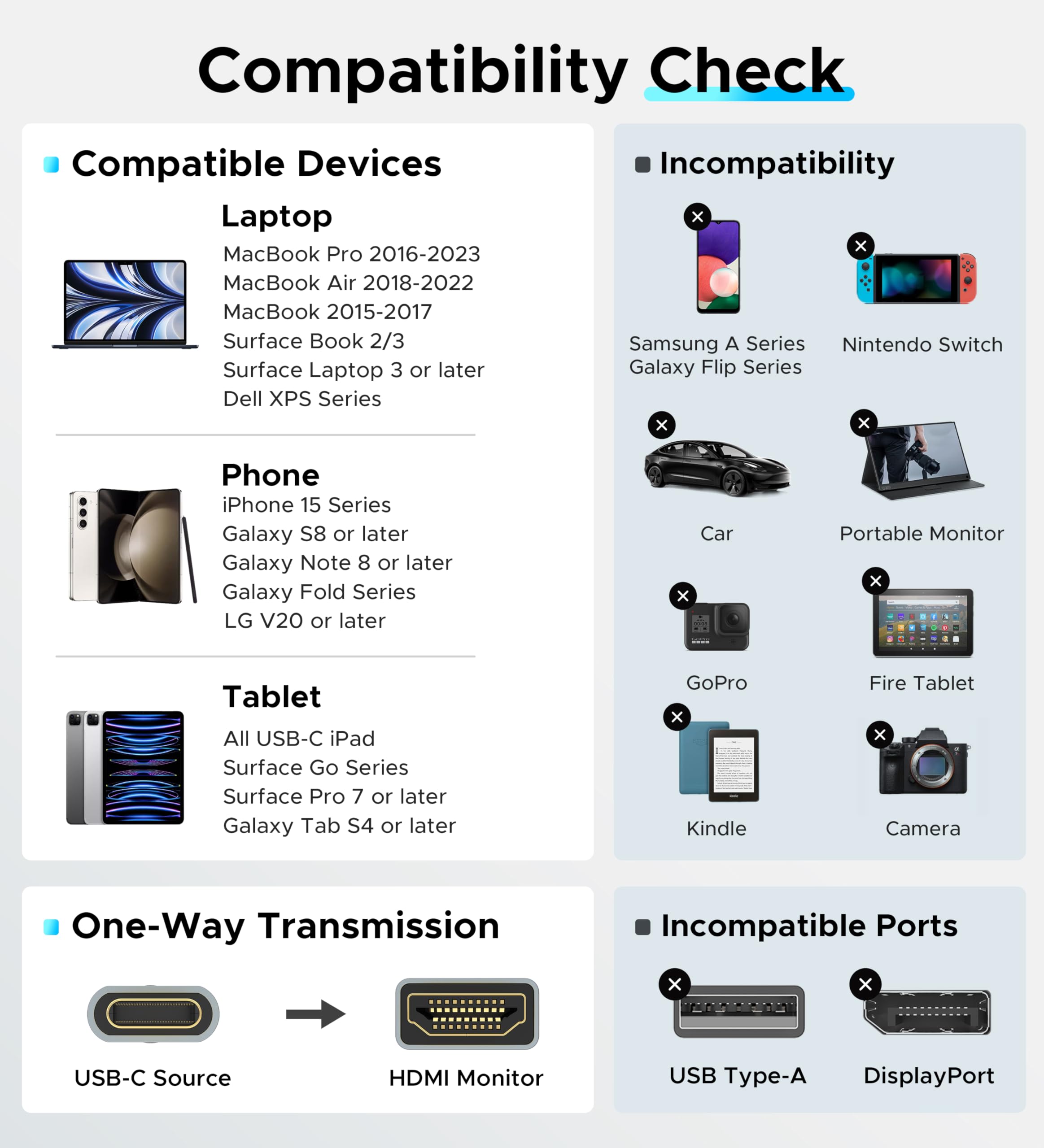 [Extensive Compatibility] Designed for Type C ports with video output capability (DP Alt Mode) and Thunderbolt 3 & 4. Enjoy compatibility with a wide range of devices, including iPhone 15/16 Series, Apple MacBook Pro (2016 and later), iMac (2017 and later), MacBook Air (2018 and later), iPad Pro (2021 and later), Mac Studio, Mac Pro, Surface Book 2/3, Surface Laptop 3, Dell XPS 15/13, HP Chromebook x360, Samsung Galaxy S25/S24/S23/S22/S21/S20, Note 20/10/9/8, LG V40, Steam Deck, and more.