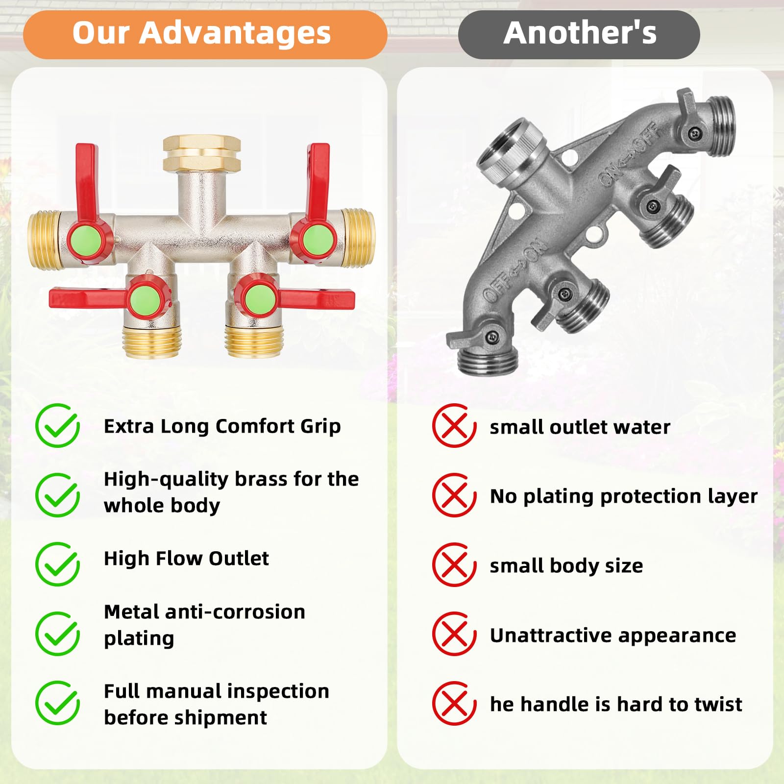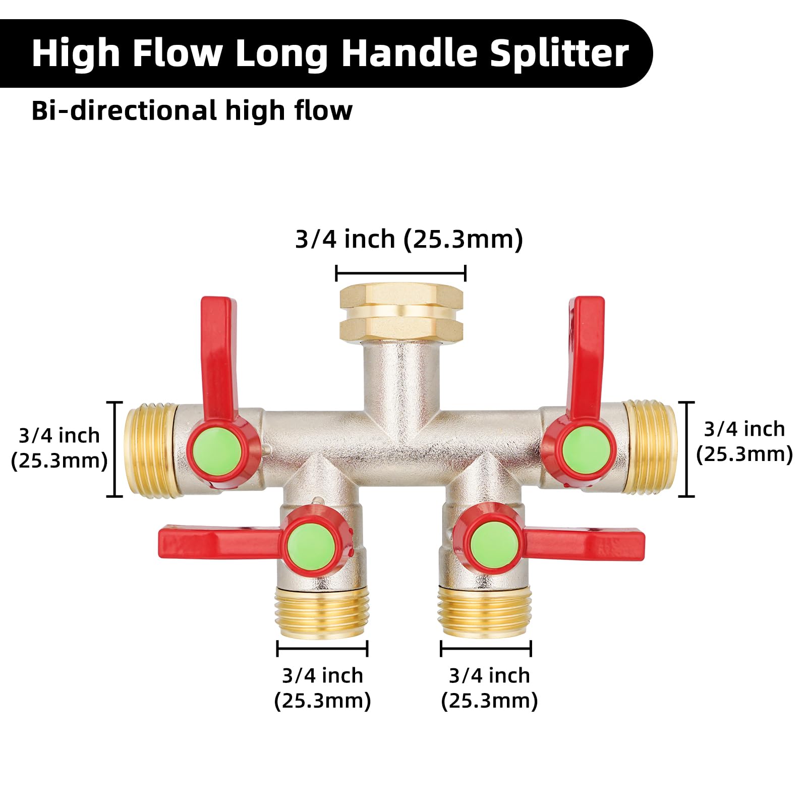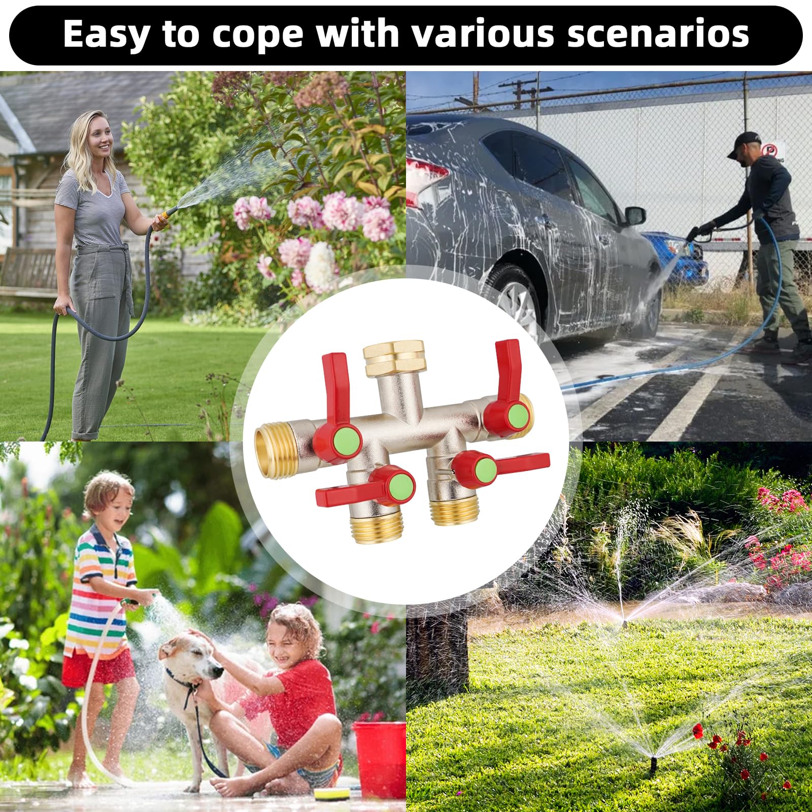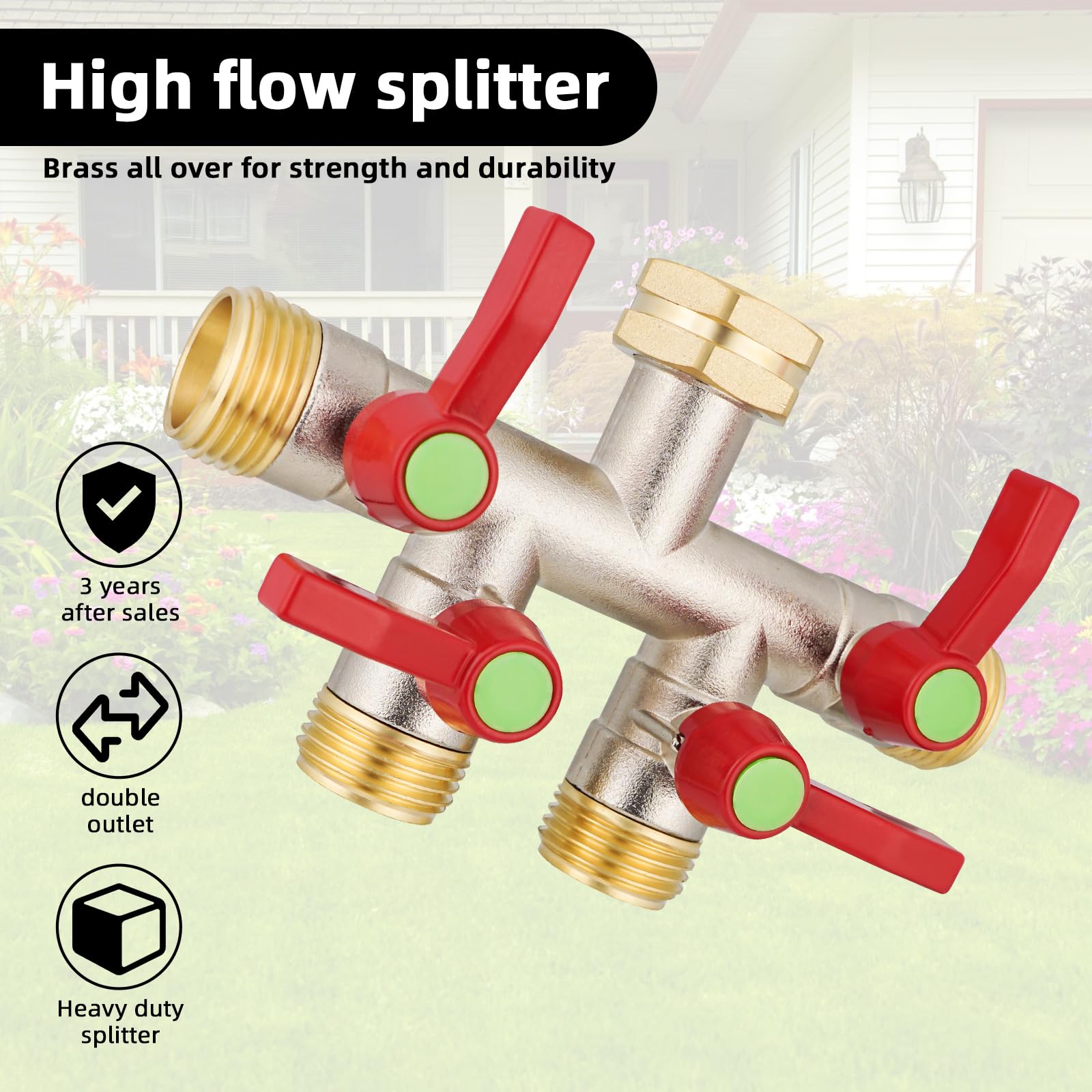 [Versatile] The 4 outlets of the brass hose splitter can be connected to multiple hoses for a multi-process water supply. You can use the high flow splitter to water plants and flowers at the same time, as well as to bathe pets and supply water for outdoor swimming laps.
