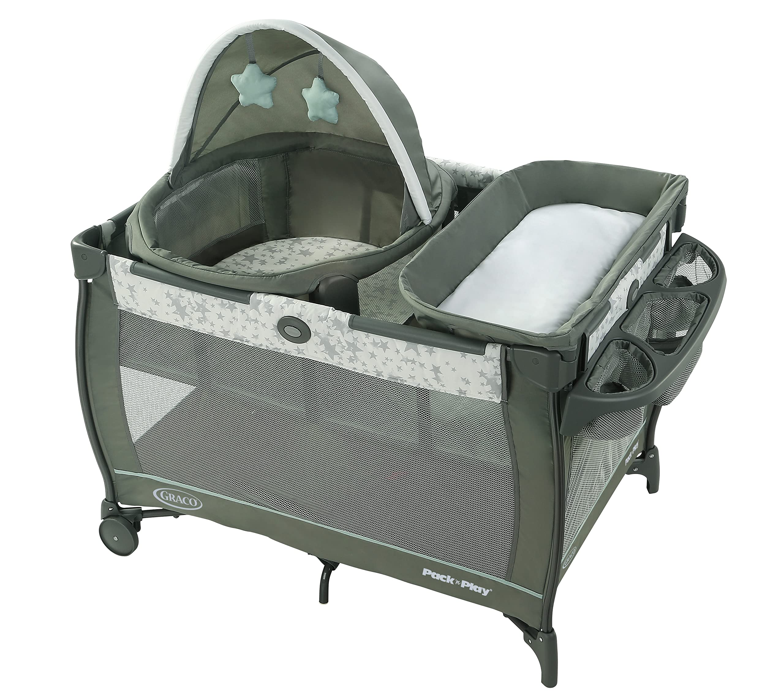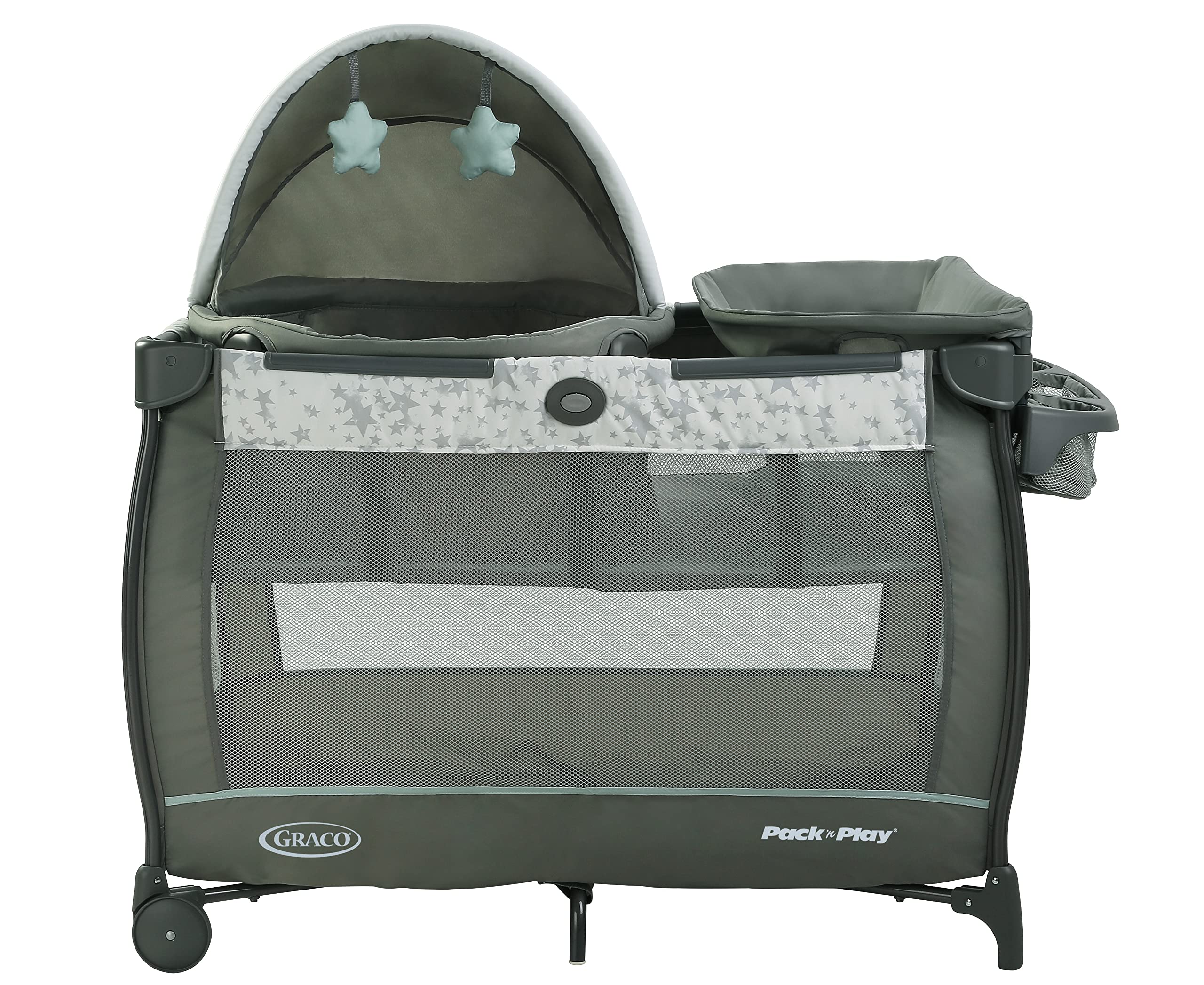 Graco's Pack 'n Play Travel Dome Playard features a travel bassinet that can be used in or out of the playard so you can keep baby by your side in any room. This playard includes a removable diaper changer with wipe-clean fabrics and an integrated storage area for baby's essentials. The Graco playpen transitions with baby and can convert into a full-size bassinet and a toddler playard with wheels for easy mobility around the home. Graco's signature push-button fold makes it easy to fold up for storage. With Graco's Travel Dome playard, baby can have sweet dreams right by your side.