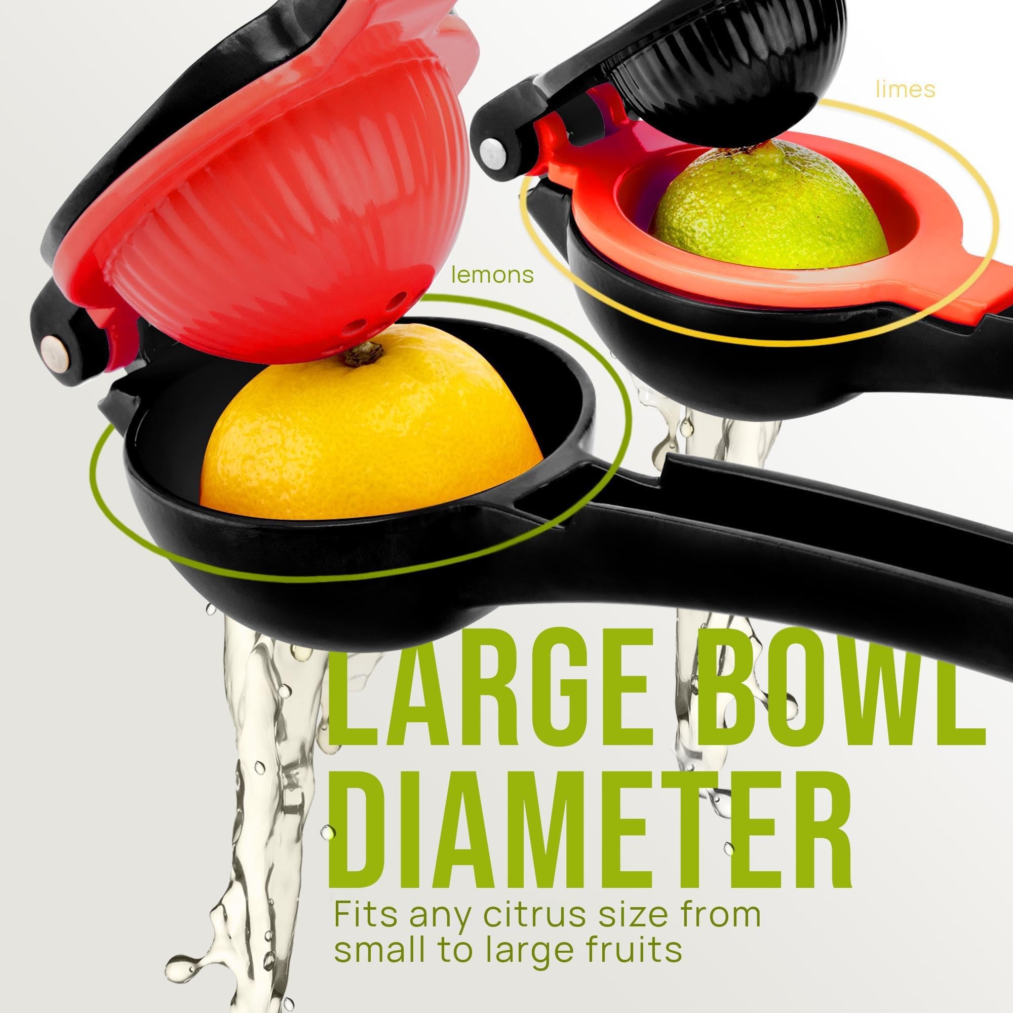 SQUEEZE OUT EVERY DROP OF JUICE: Our 2-in-1 lemon squeezer won’t waste a single drop from your favorite fruit! We have designed this lime juicer to be easy on hands. Watch limes, lemons, and small oranges beg for mercy, even with a soft squeeze. The holes at the bottom of the citrus juicer serve as a seed filter to prevent the pulp and seeds from getting in your way.