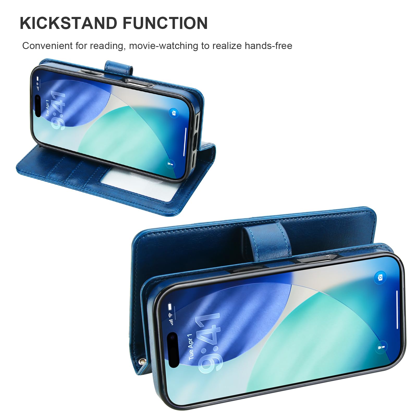 【Convenient Stand】1. The kickstand feature helps free your hands when browsing the web, having video chats, and so on. 2. The removable anti-lost wrist strap allows you to hang your phone on your wrist for as long as you need. 3. The leather is smooth in texture and comfortable in grip.