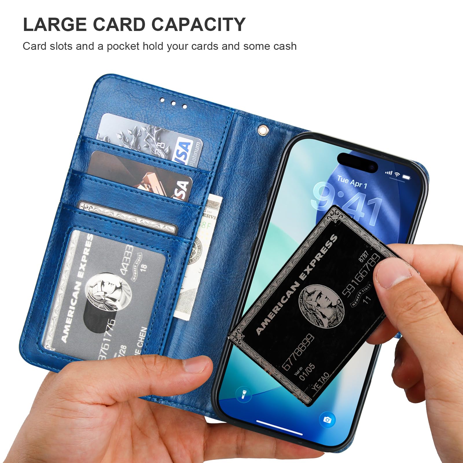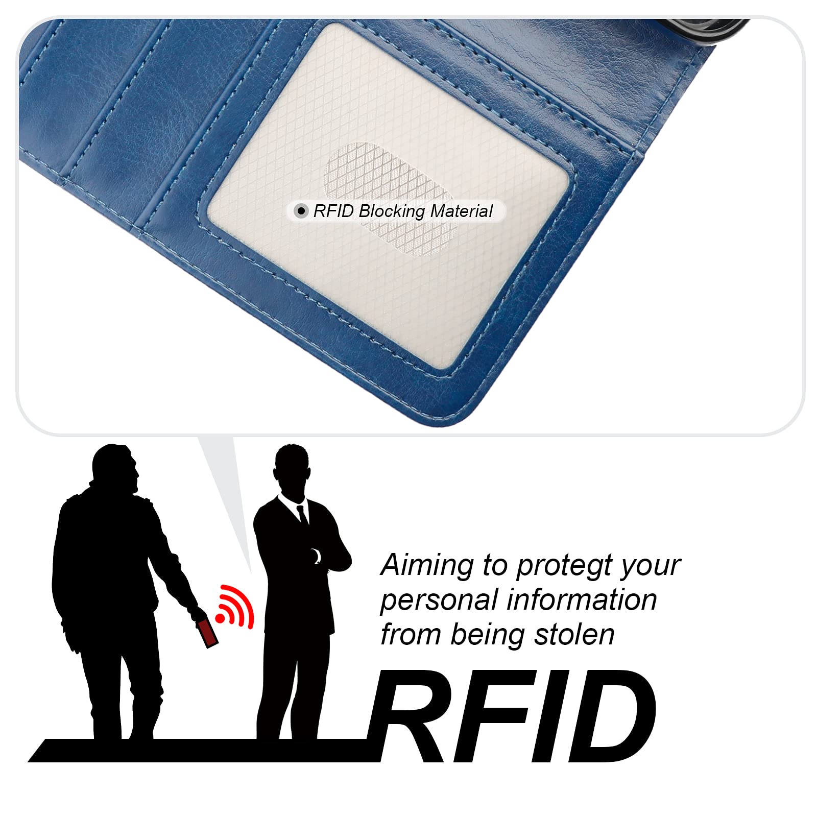 【Card Slots with RFID Protection】This protective flip case with 3 card slots and a cash pocket can store little cash and your cards like ID card, credit card, driver's license, and so on. What's more, the built-in RFID blocking material can protect your cards from being read and copied through radio signals with RFID technology.