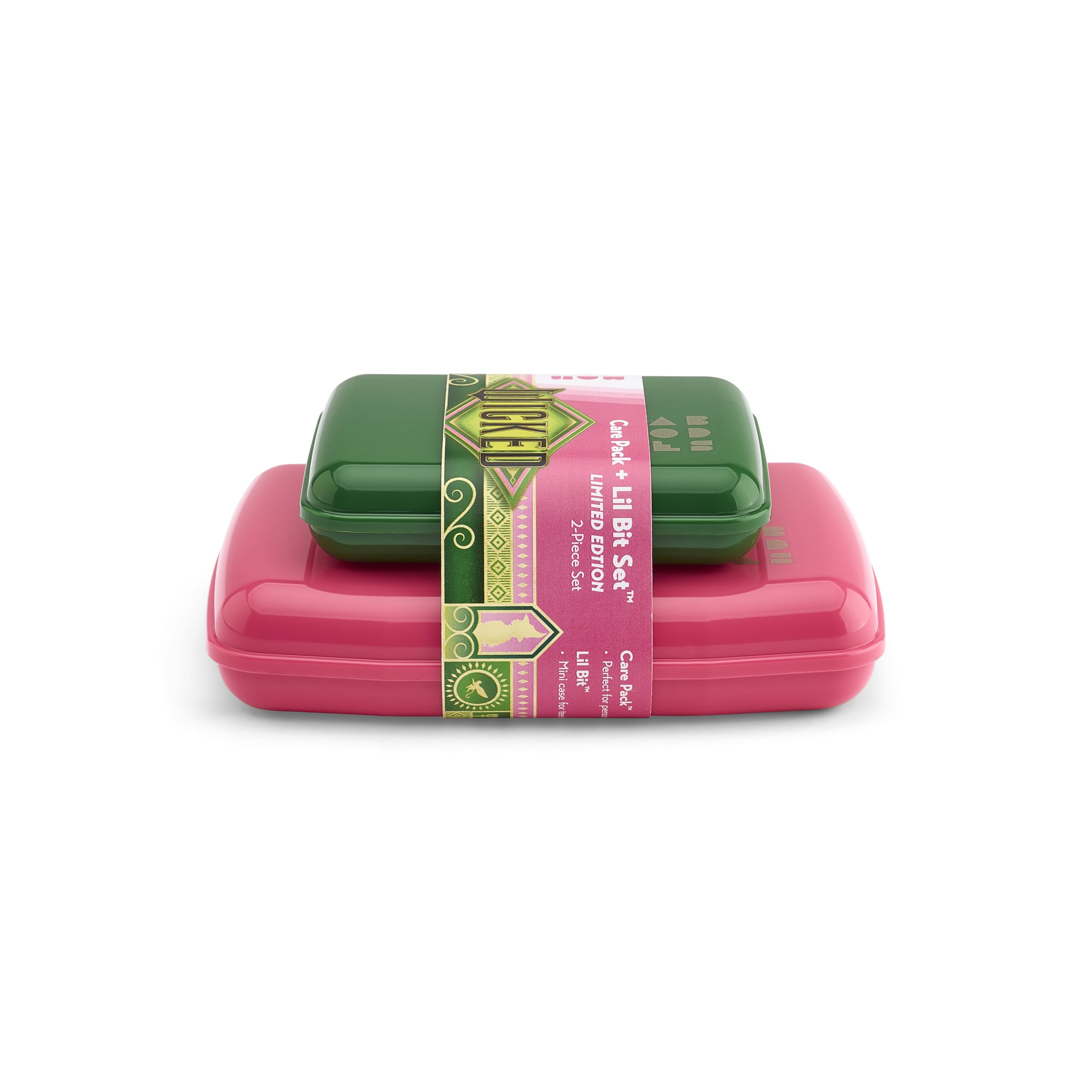 CABOODLES CARE PACK LIL BIT SET: Inspired by the two witches from the Wicked 2024 film, these Caboodles limited edition travel cases are mini, but mighty, portable makeup organizers.
