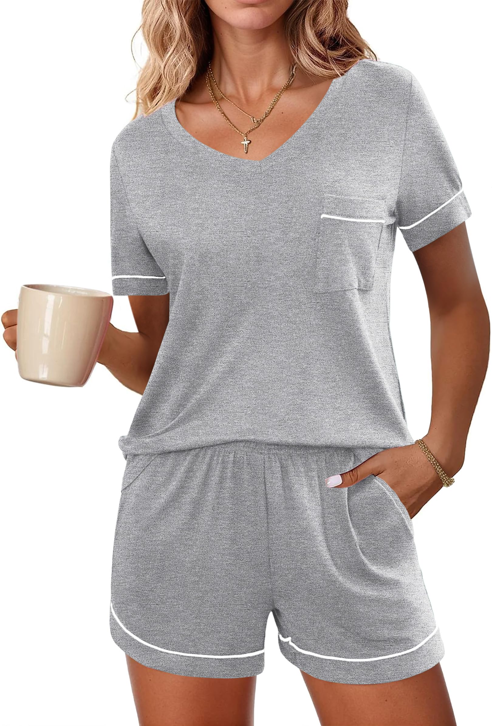 【Classic Design】The 2 piece short sleeve pj set fits well and allows for freedom of movement. Sleepwear features chest pocket, V neck and contrast piping trim Ensuring a restful night’s sleep and a cozy lounging experience