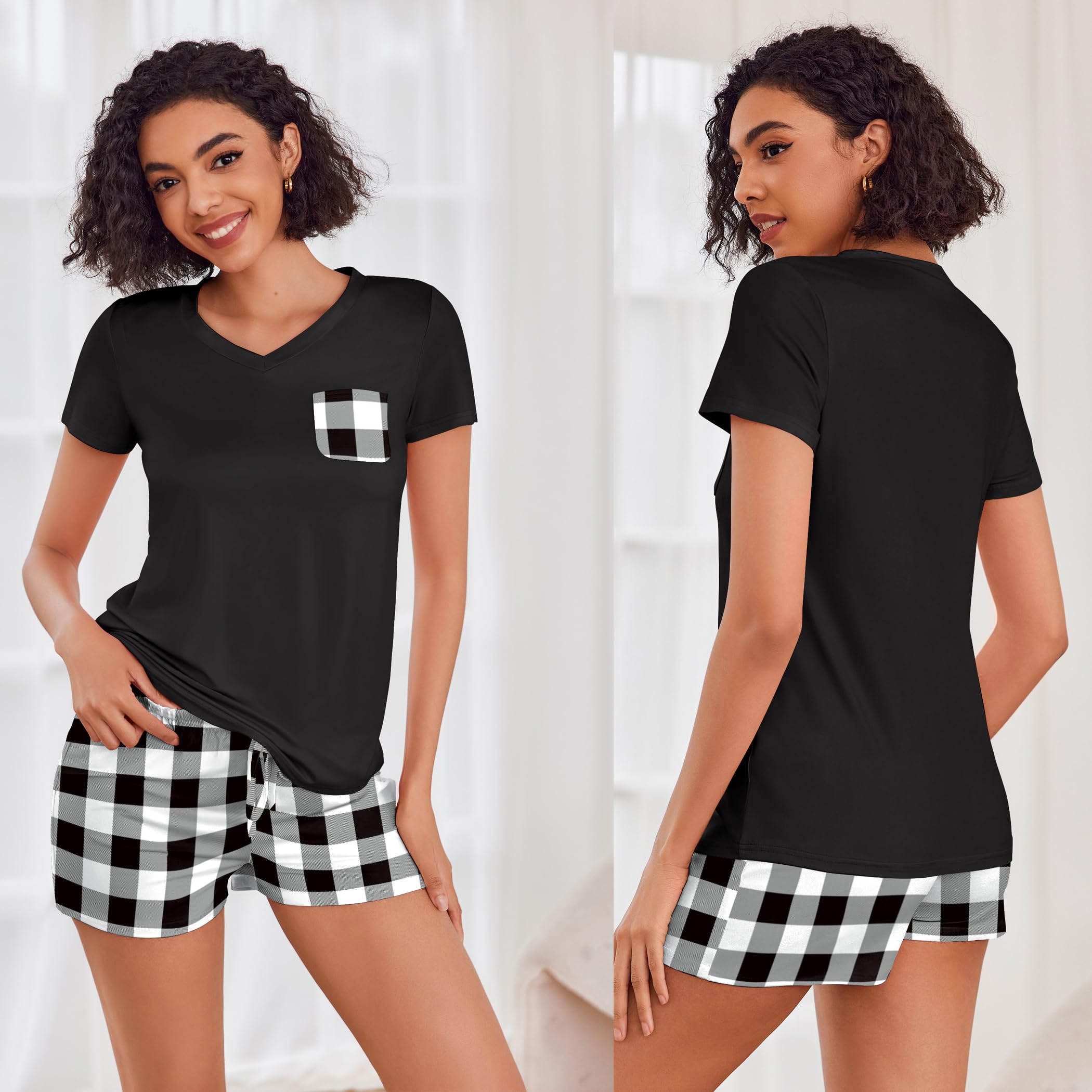 FEATURES: pajama sets for women 2 piece, pj sets for woman, V neck women's pajama sets, short sleeve T-shirt, drawstring elastic waist shorts.