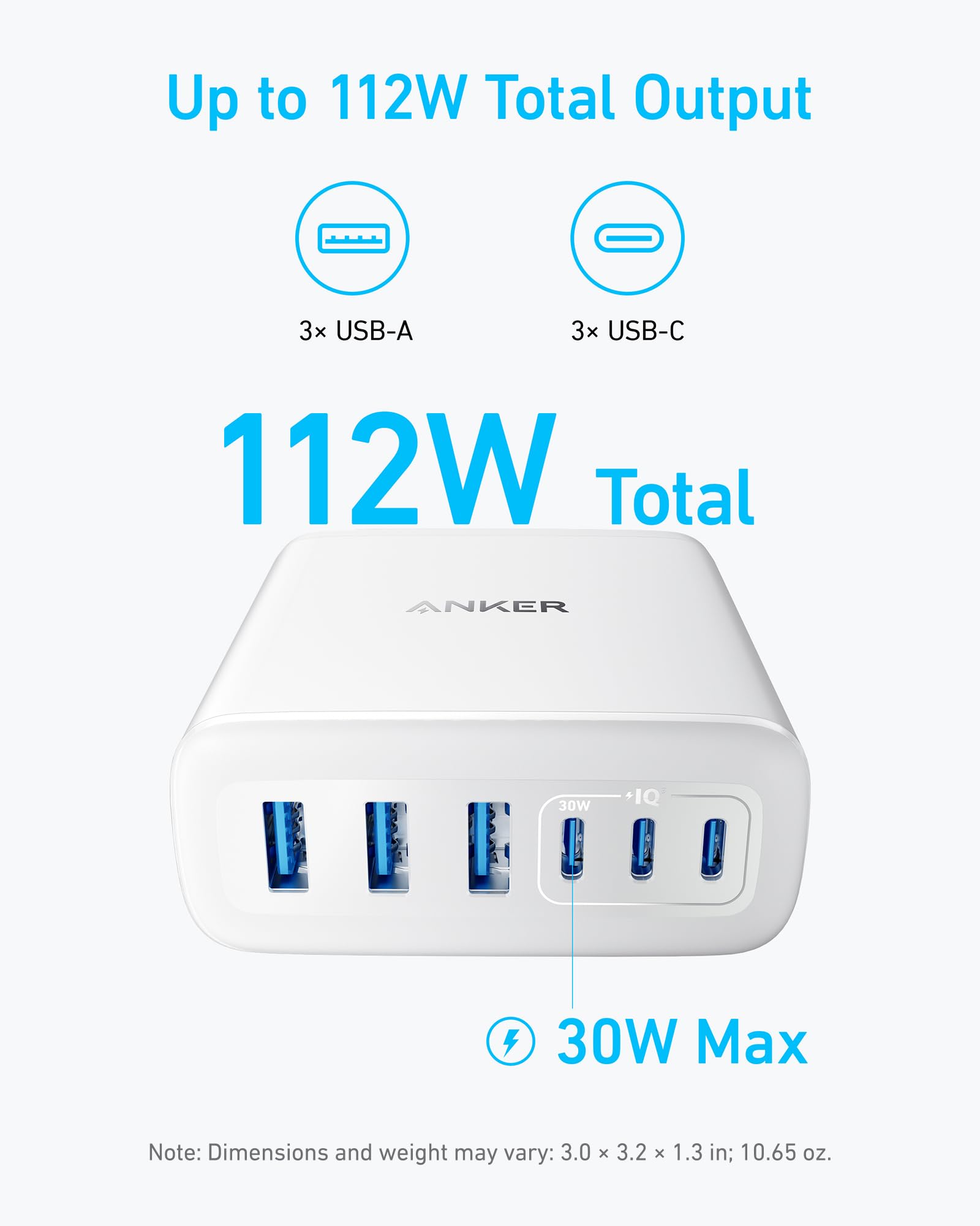 112W Multi-Device Charger: Equipped with 3 USB-C and 3 USB-A ports (112W total across 6 ports). Max output: Up to 30W via a single USB-C port and 18W via a single USB-A port. Powerful enough to charge multiple devices simultaneously.