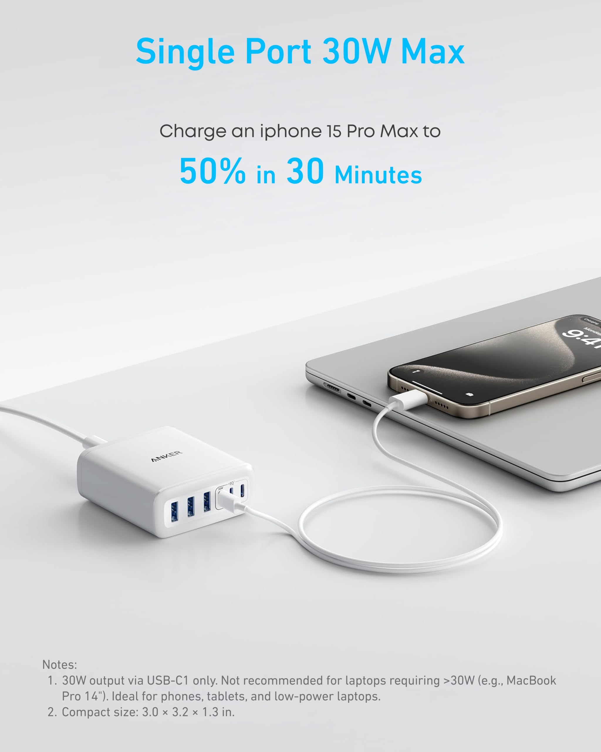 Maximum Power, Minimum Time: Efficiently power your MacBook Air to 50% in just 1 hour 40 minutes or quickly boost your iPhone 16 Pro Max from 0 - 50% in 30 minutes with a single 30W max charging port.