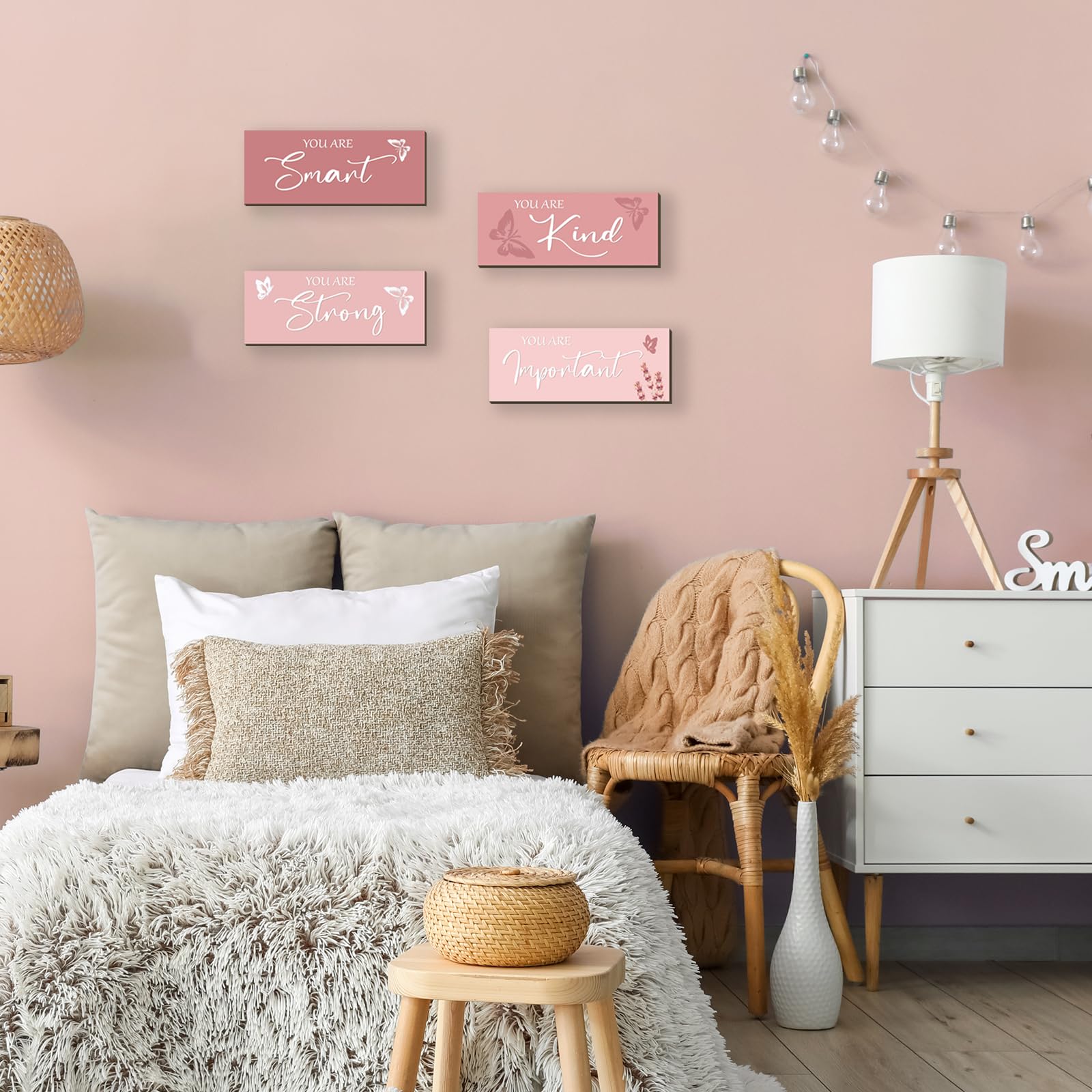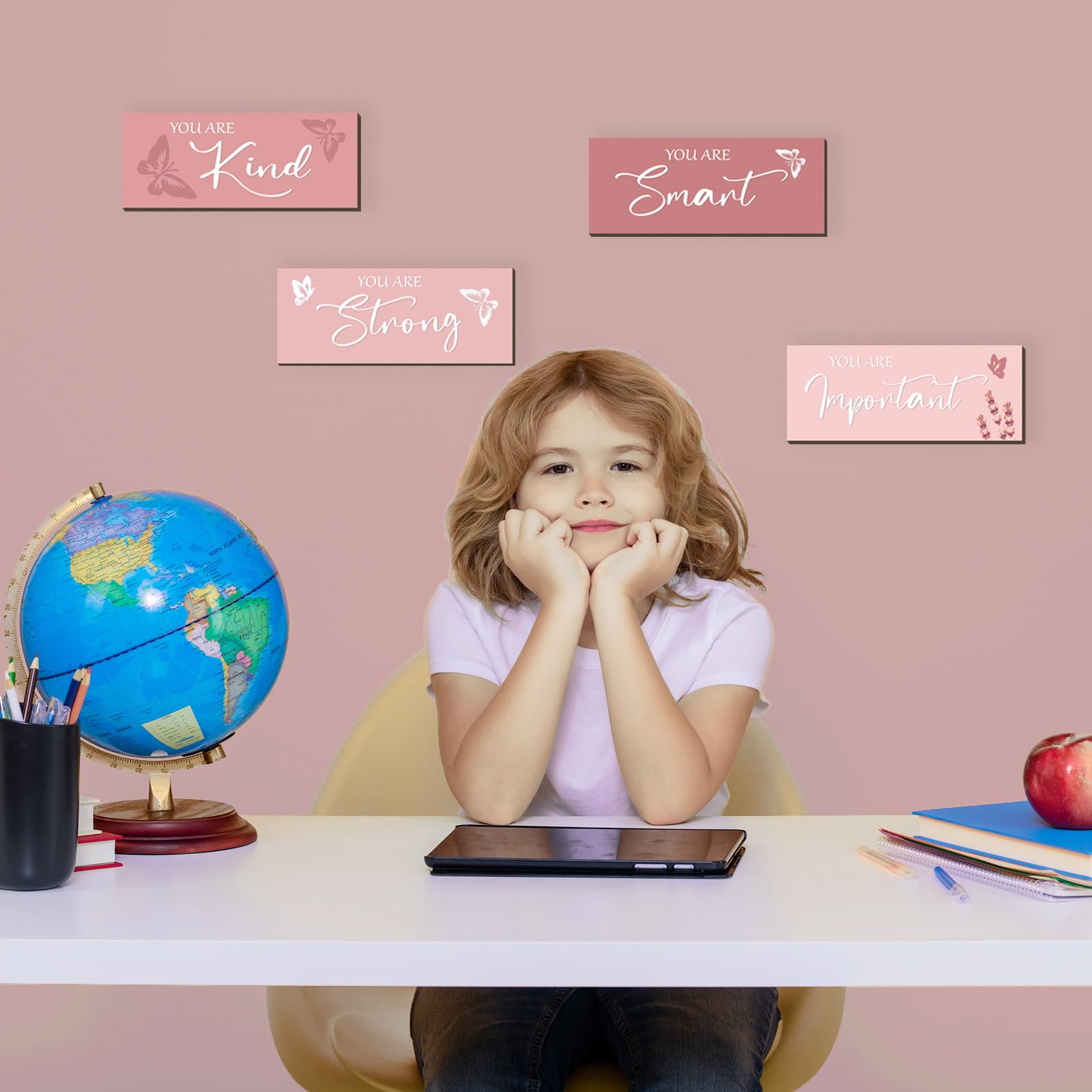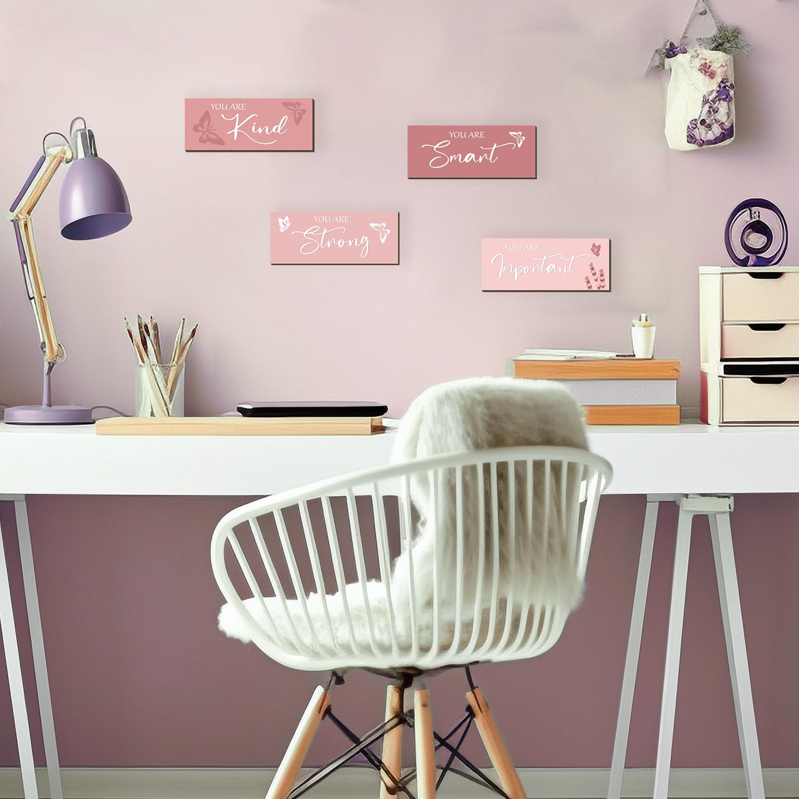 Pink Decor and Positive Sentence Design: the pink butterfly room decor for girls is decorated with inspirational words, such as [you are smart], [you are kind], [you are strong], and [ you are important]; When you are sad, warm and inspiring motivational words and color filling your room with positive touches