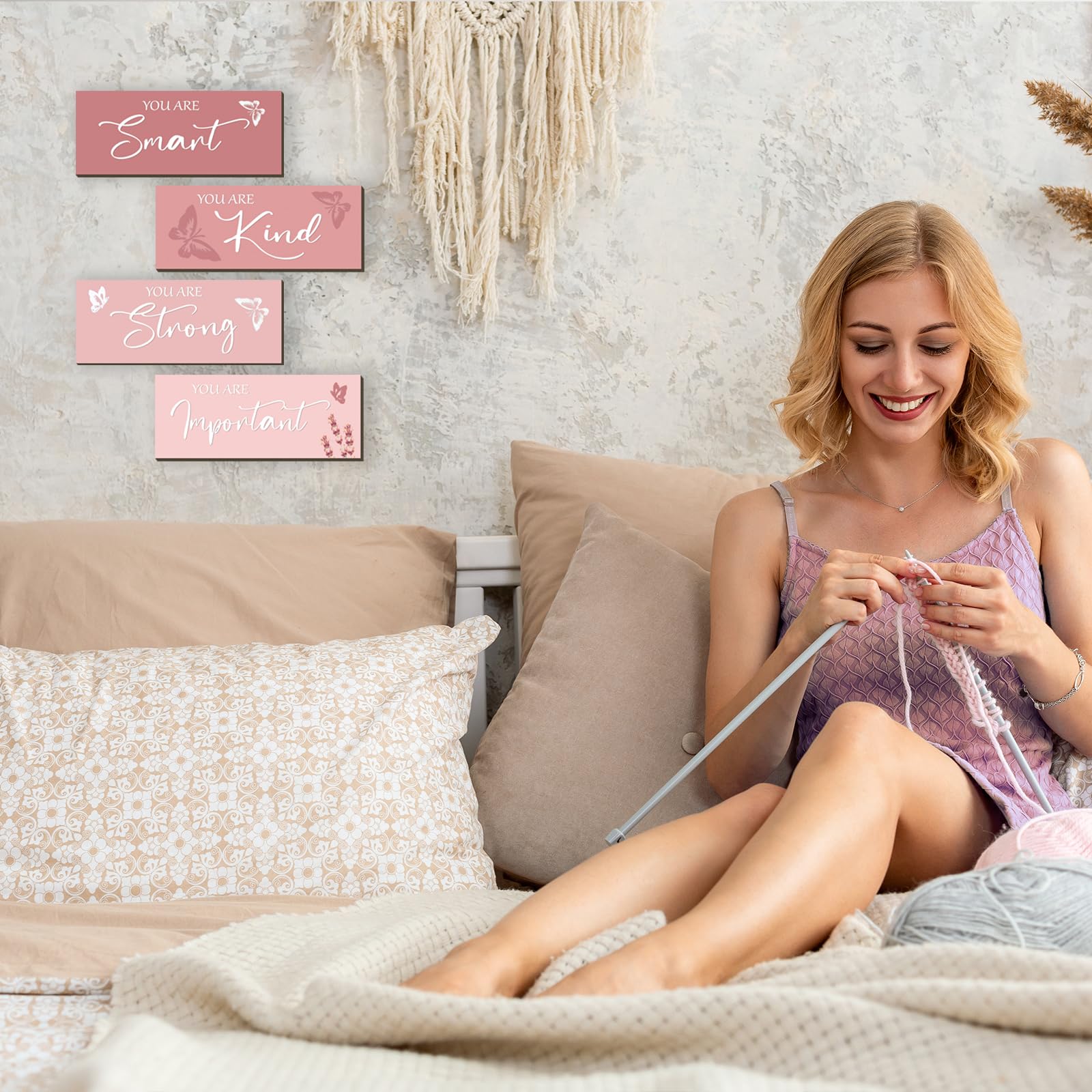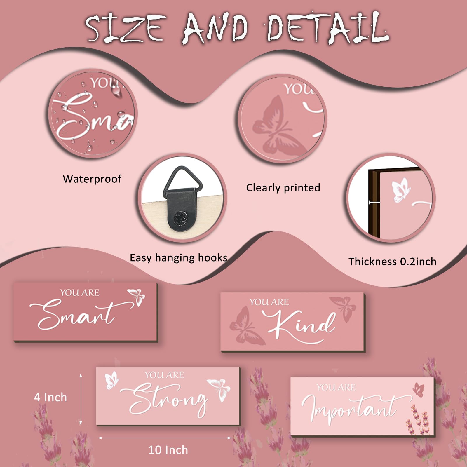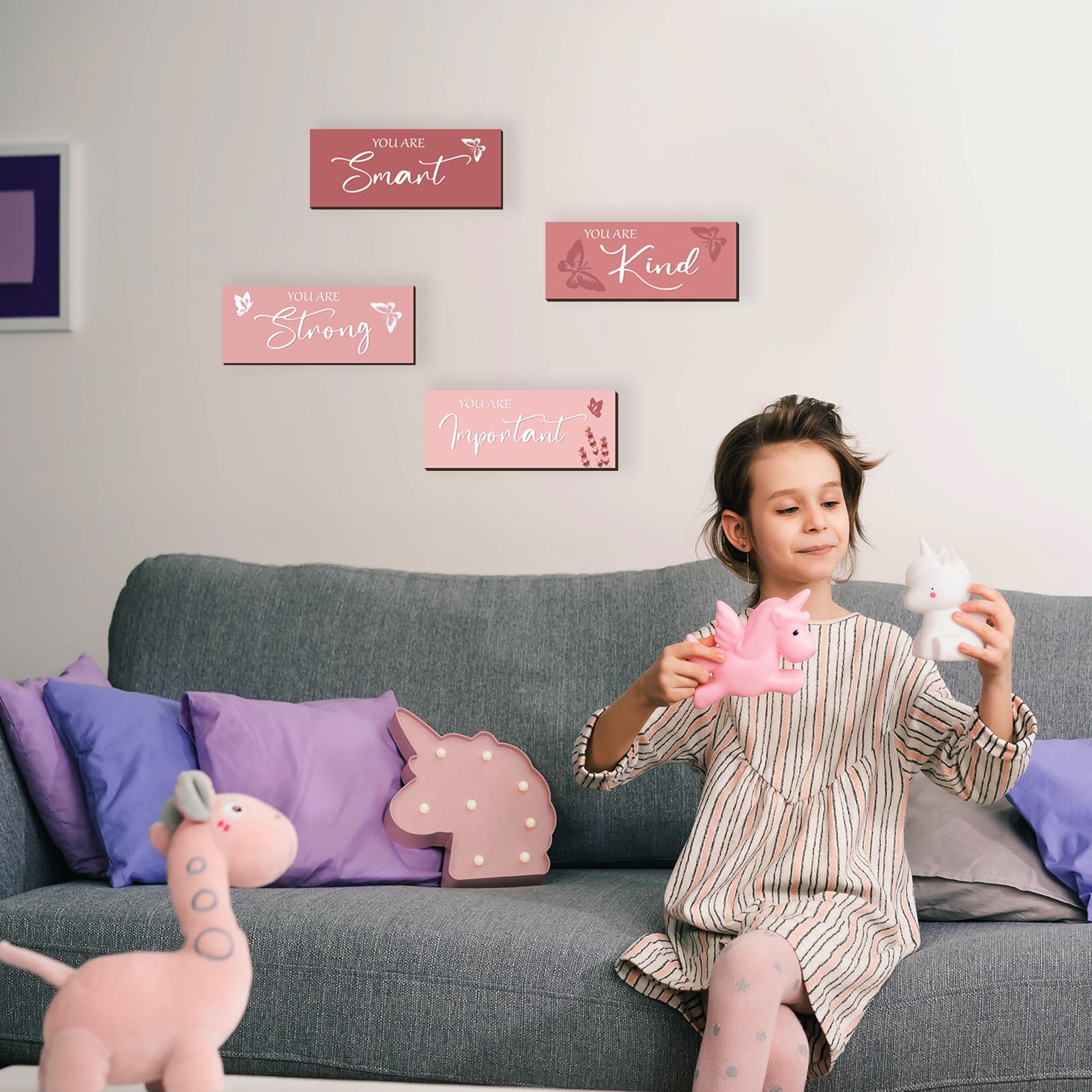 Pink Decor and Positive Sentence Design: the pink butterfly room decor for girls is decorated with inspirational words, such as [you are smart], [you are kind], [you are strong], and [ you are important]; When you are sad, warm and inspiring motivational words and color filling your room with positive touches