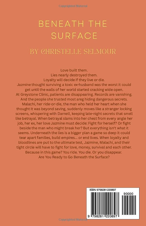 Beneath the Surface By Christelle Selmour Love. Loyalty. Lies. And the secrets no one saw coming. Jazmine is a strong, beautiful nurse just trying to hold it all together her career, her heart, and the people she loves. But when she falls for Malachi, the quiet tech guy with a magnetic smile and secrets behind his eyes, her world starts to shift in ways she never expected. Her cousin India is out here building her brand and standing by her man, Darnell a talented chef with dreams too big for a grill. But when Darnell and Malachi team up on a risky crypto project, they unlock more than digital currency… they uncover a dark secret buried deep inside the clinic Jazmine calls home. Now the lies are stacking, the tension is rising, and trust is running thin. Co-workers are moving funny, and behind every friendly smile might be someone hiding the truth. Beneath the Surface is a gripping story of love tested by ambition, friendships twisted by betrayal, and a dangerous discovery that could change everything. Some secrets can set you free but others can burn everything to the ground.