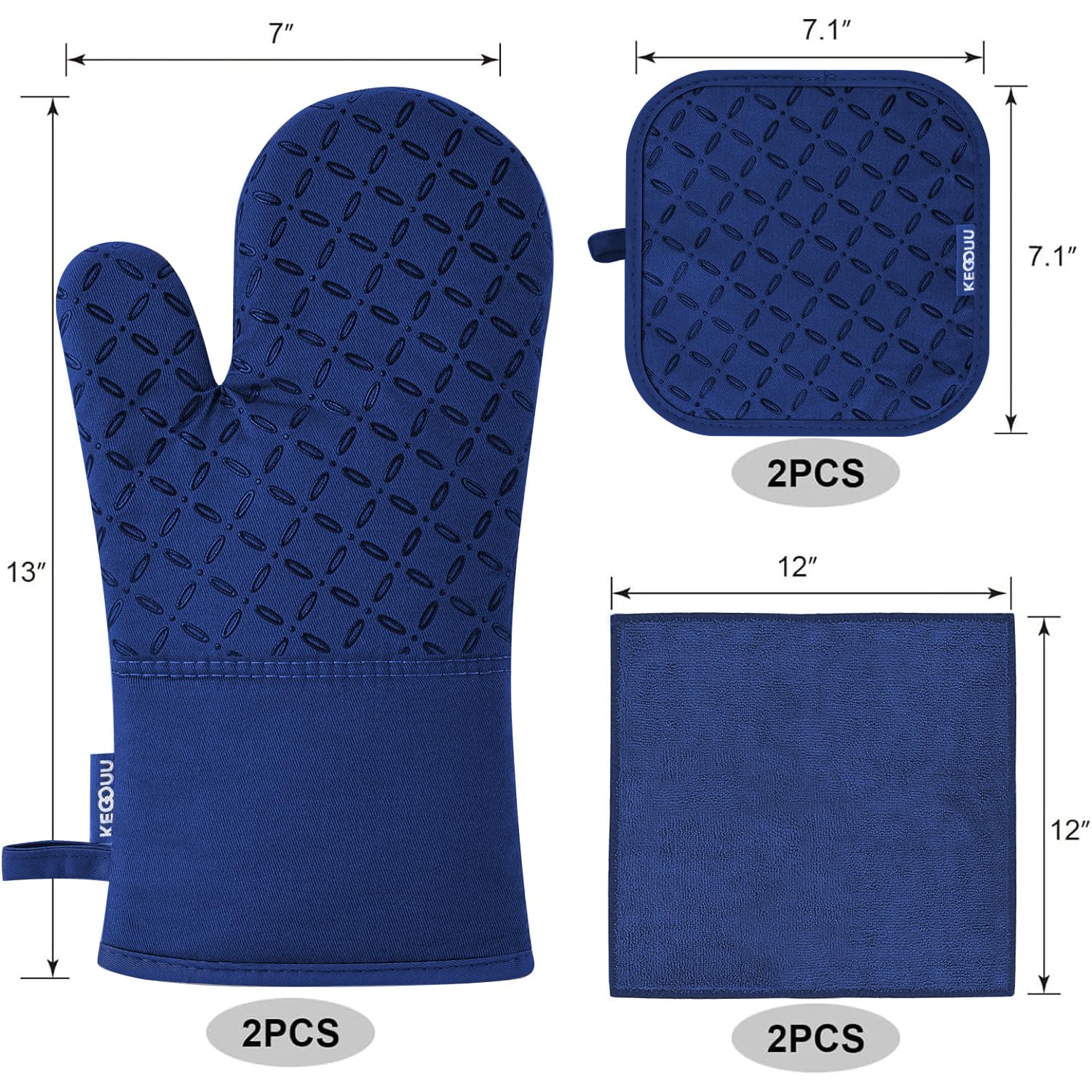 6 PIECE KITCHEN ACCESSORY SETS: -Our oven mitts and pot holders set including 2pcs non-slip surface silicone kitchen oven gloves (7X13in), 2pcs pot holders (7X7in) and 2 kitchen towels (12x12in), fit for indoor cooking, baking,BBQ or outdoor grilling. Also the oven mitt set is a perfect ideal kitchen gift for women, men, baker, cooker