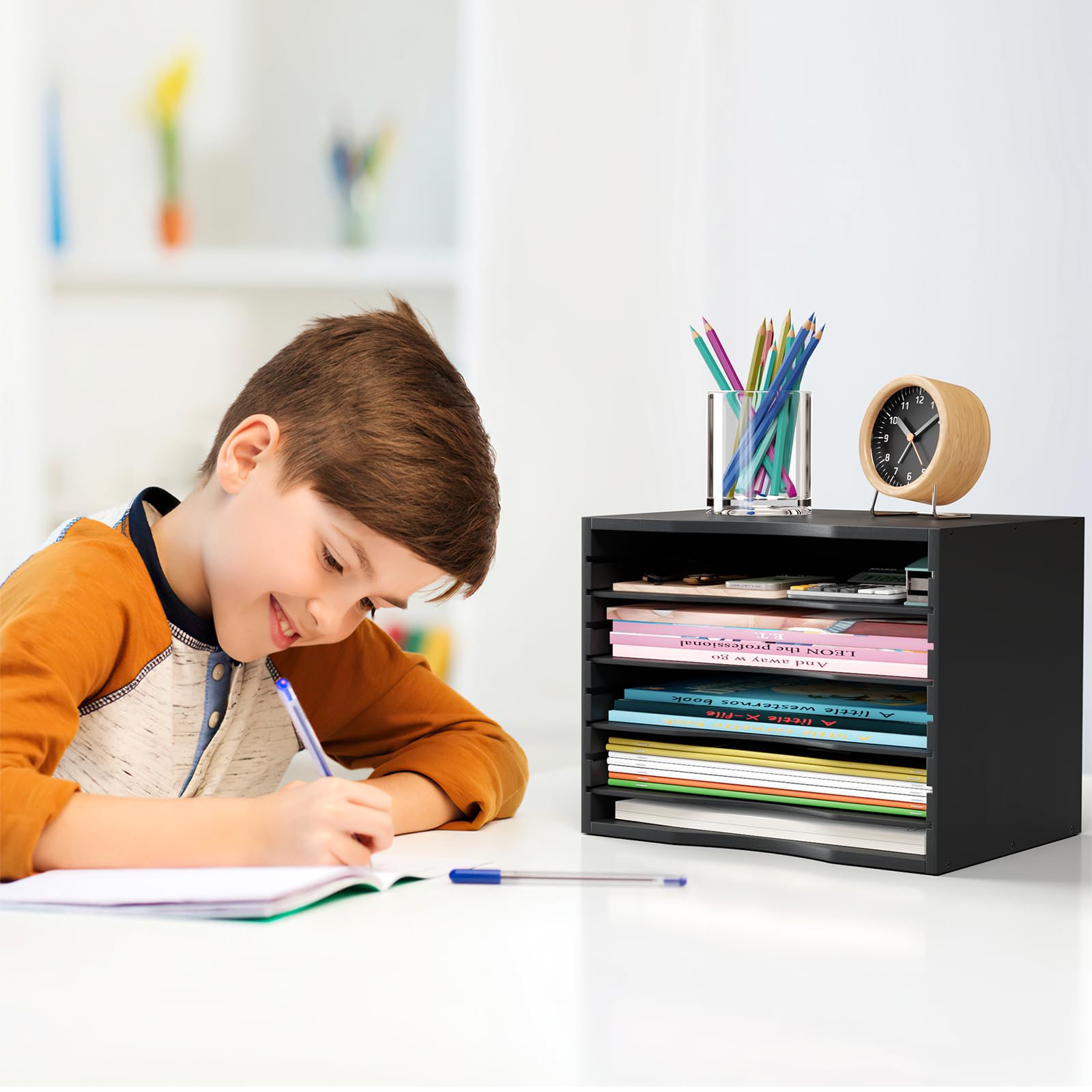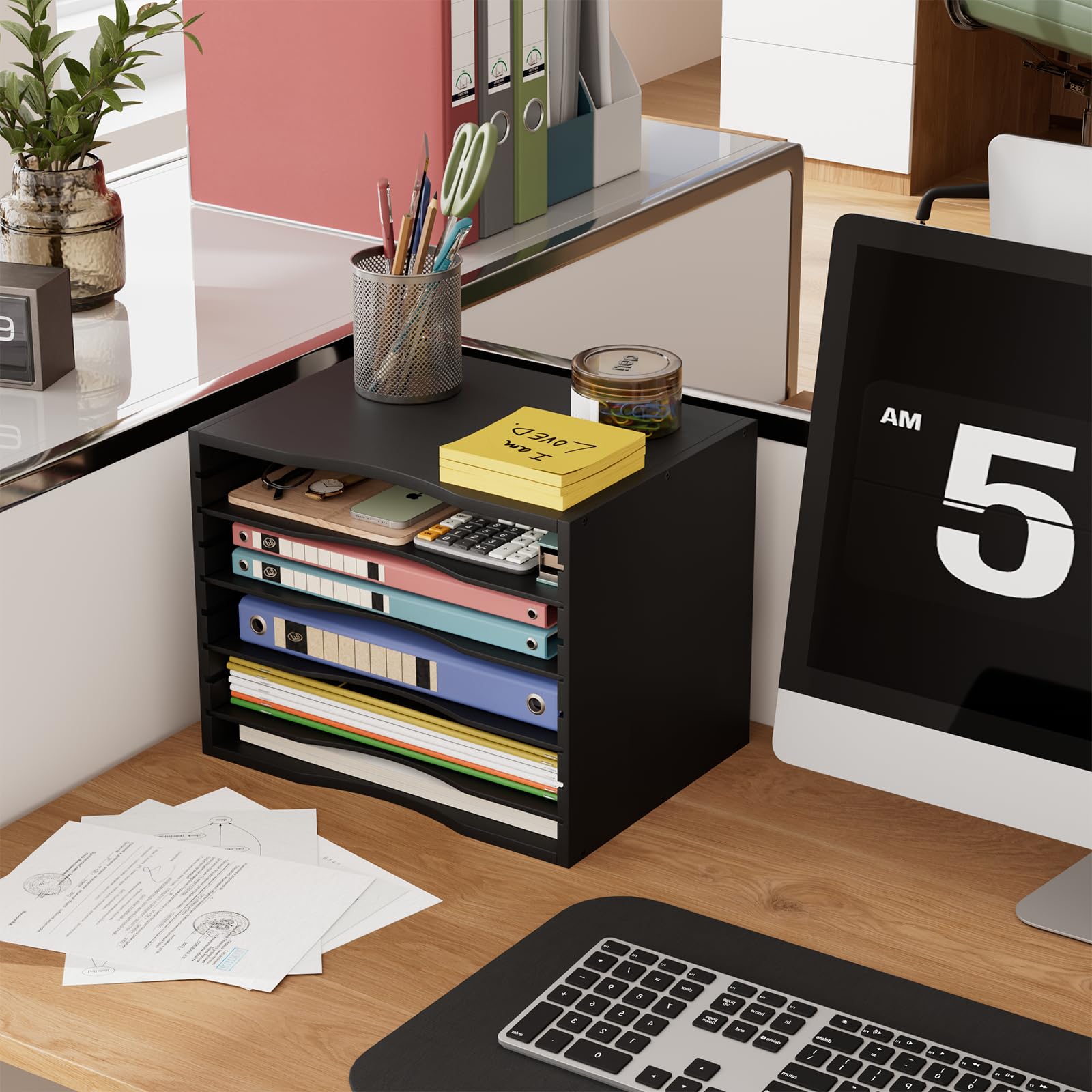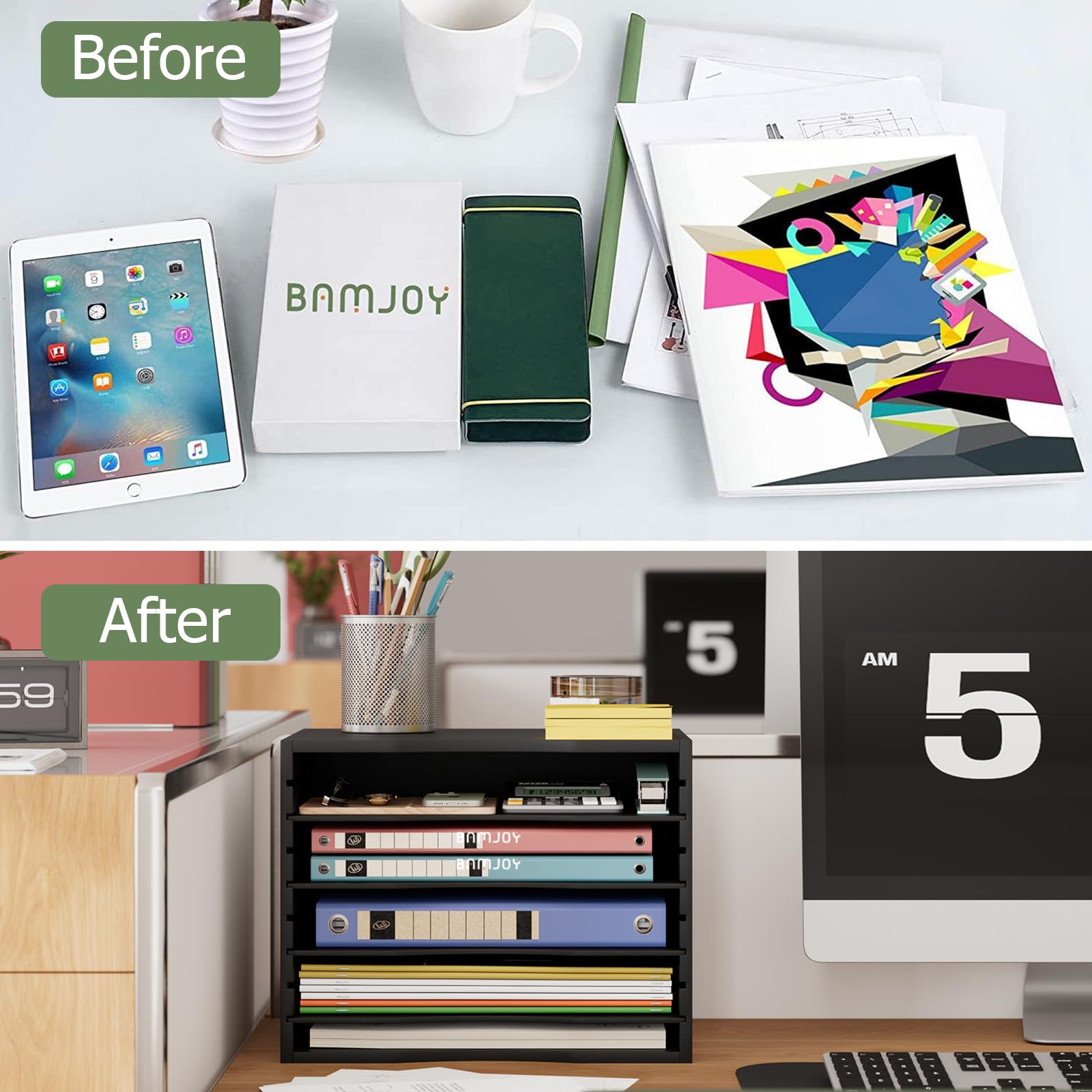 【NEAT YOUR DESKTOP】Help you to classify and store your various sizes of paper, file folder, magazines, staples, calculators, notebooks or any other documents, came with 4 MDF dividers can be adjusted freely according to your needs. Bamjoy file sorter organizer will make your home office, classroom, kids room much more organized.