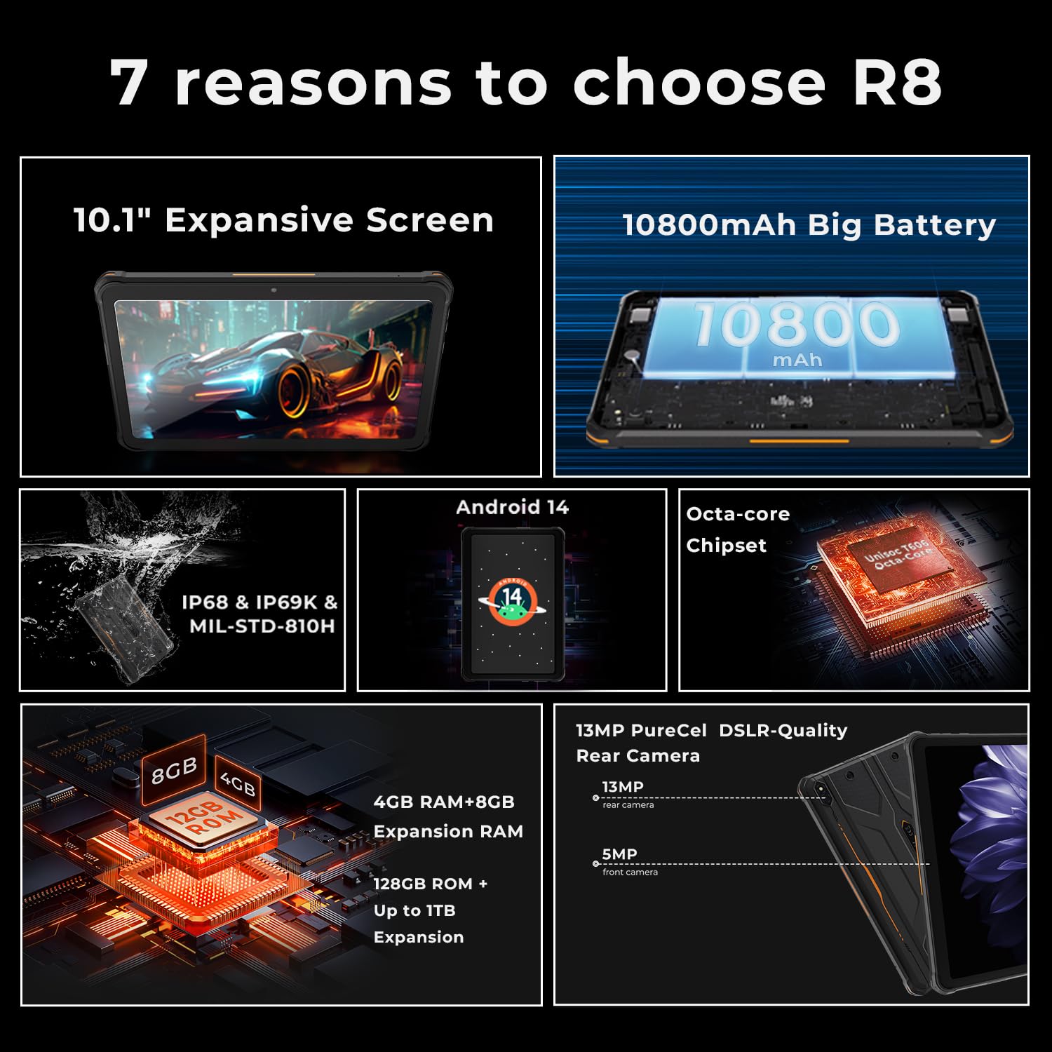 đžă12GB+128GB/TF-1TBăHOTWAV R8 rugged tablet has launched a new 12 (4+8) GB RAM, which can be set to get an additional 8GB virtual memory. The background processing speed is greatly improved. Not only that, the R8 waterproof tablet is also equipped with 128GB of storage memory and supports up to 1TB of TF card expansion, allowing you to store your favorite photos or videos and use them as you wish.