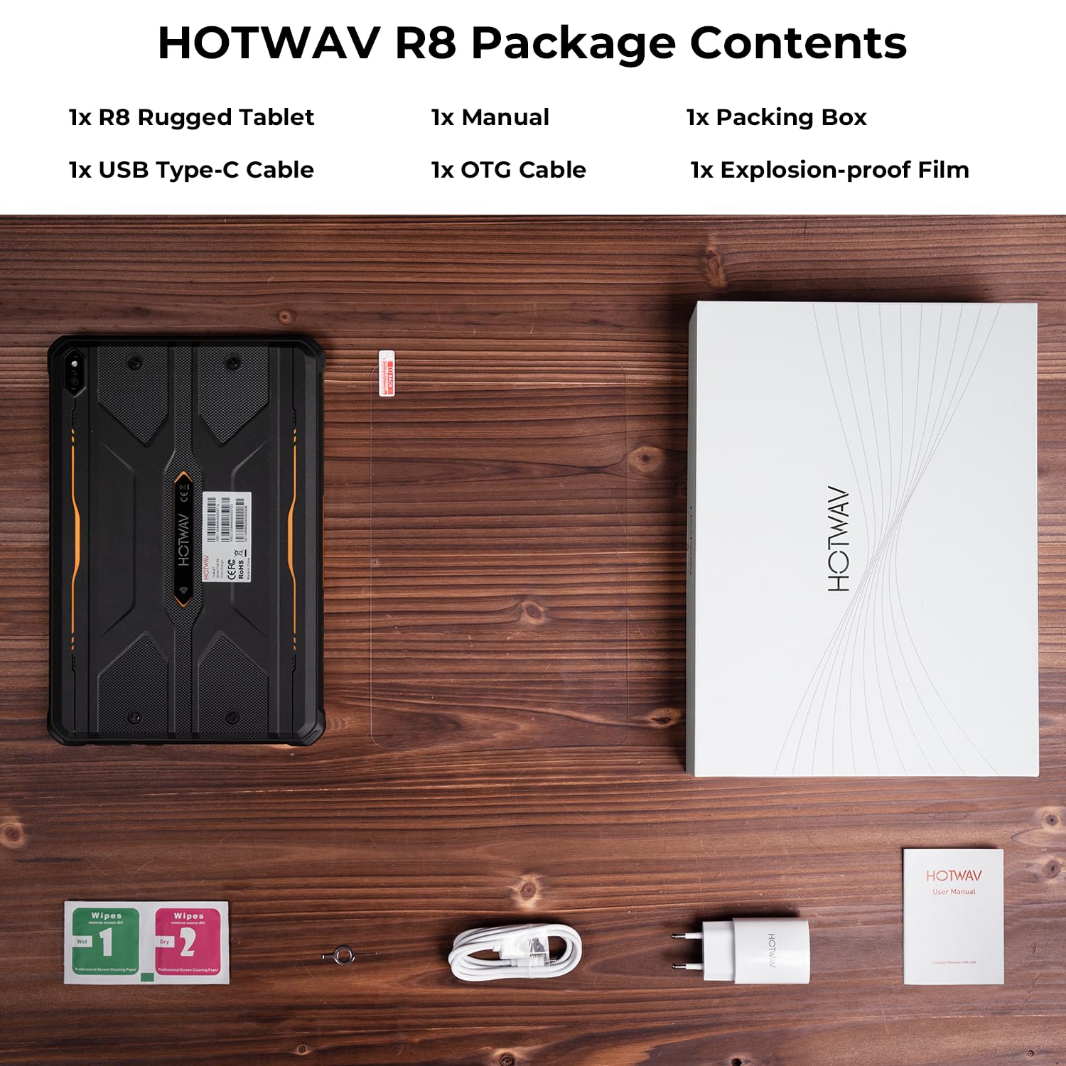 đă10800mAh Large Battery + OTGăHotwav R8 rugged tablet is equipped with a 10800mAh large battery, and also has good battery management to help you better protect and allocate the battery. When fully charged, it can maintain 1000 hours of standby mode, 200 hours of talk time, and 400 hours of music playback. You donât have to worry about running out of power wherever you go. The R8 tablet also supports OTG function, which can provide power to other electronic products.