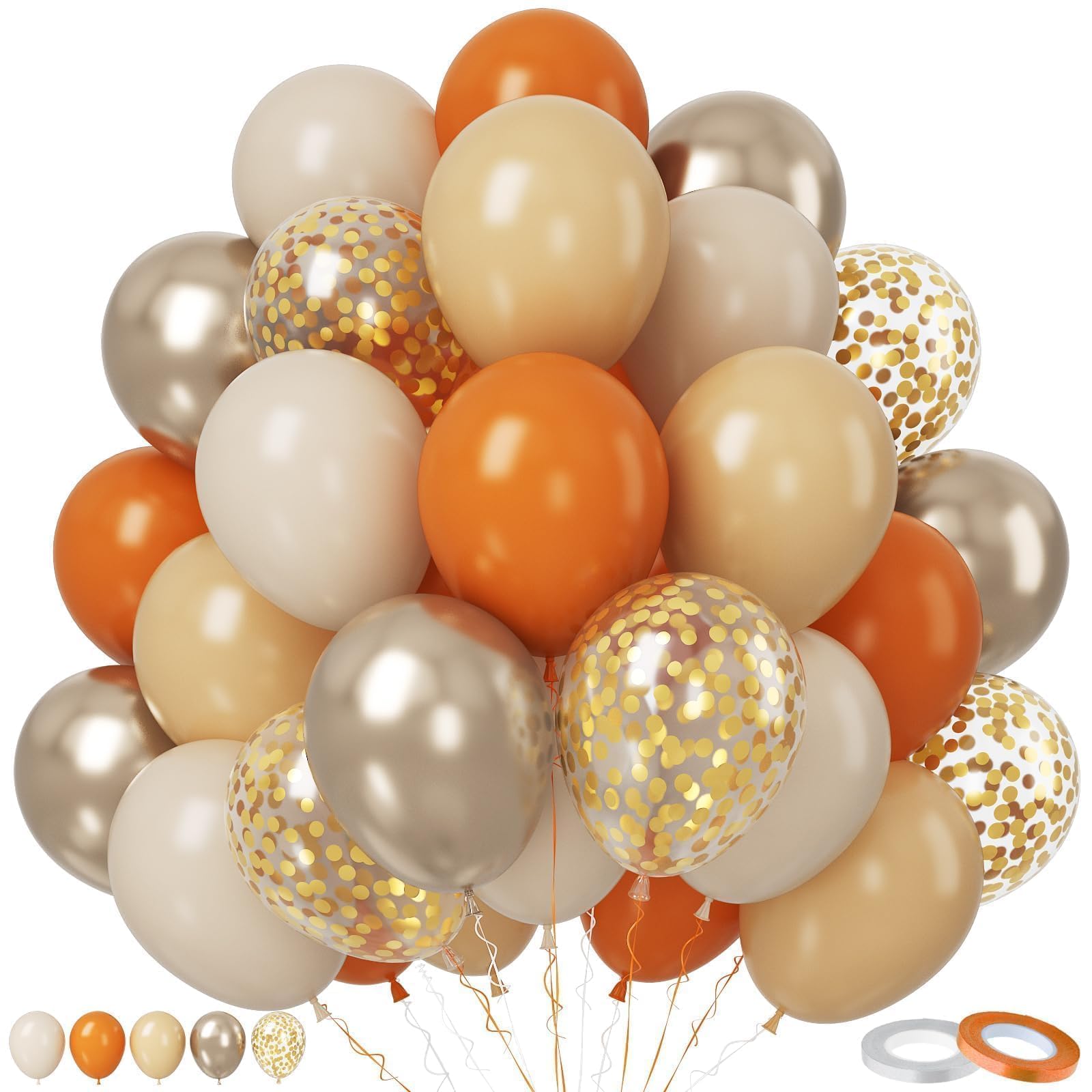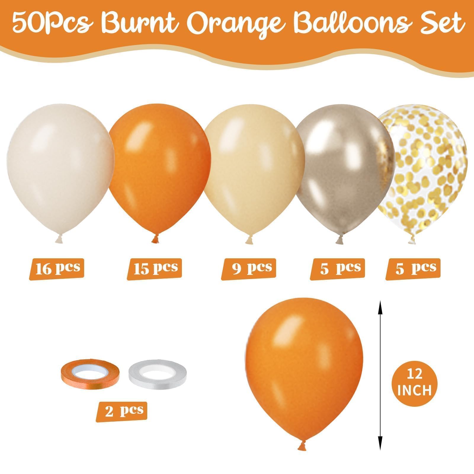 【WHAT YOU WILL GET】Our birthday party balloons include 50pcs retro orange and sand white balloons, designed to help you create stunning decoration: 16 x retro sand white balloons, 5 x metallic champagne gold, 9 x retro apricot balloons, 15 x retro orange balloons, 5 x confetti gold balloons, 1 x orange ribbon, and 1 x white ribbon. The size of the balloon is about 12 inches after inflation. The combination of orange and champagne gold can make party or occasion more classy.