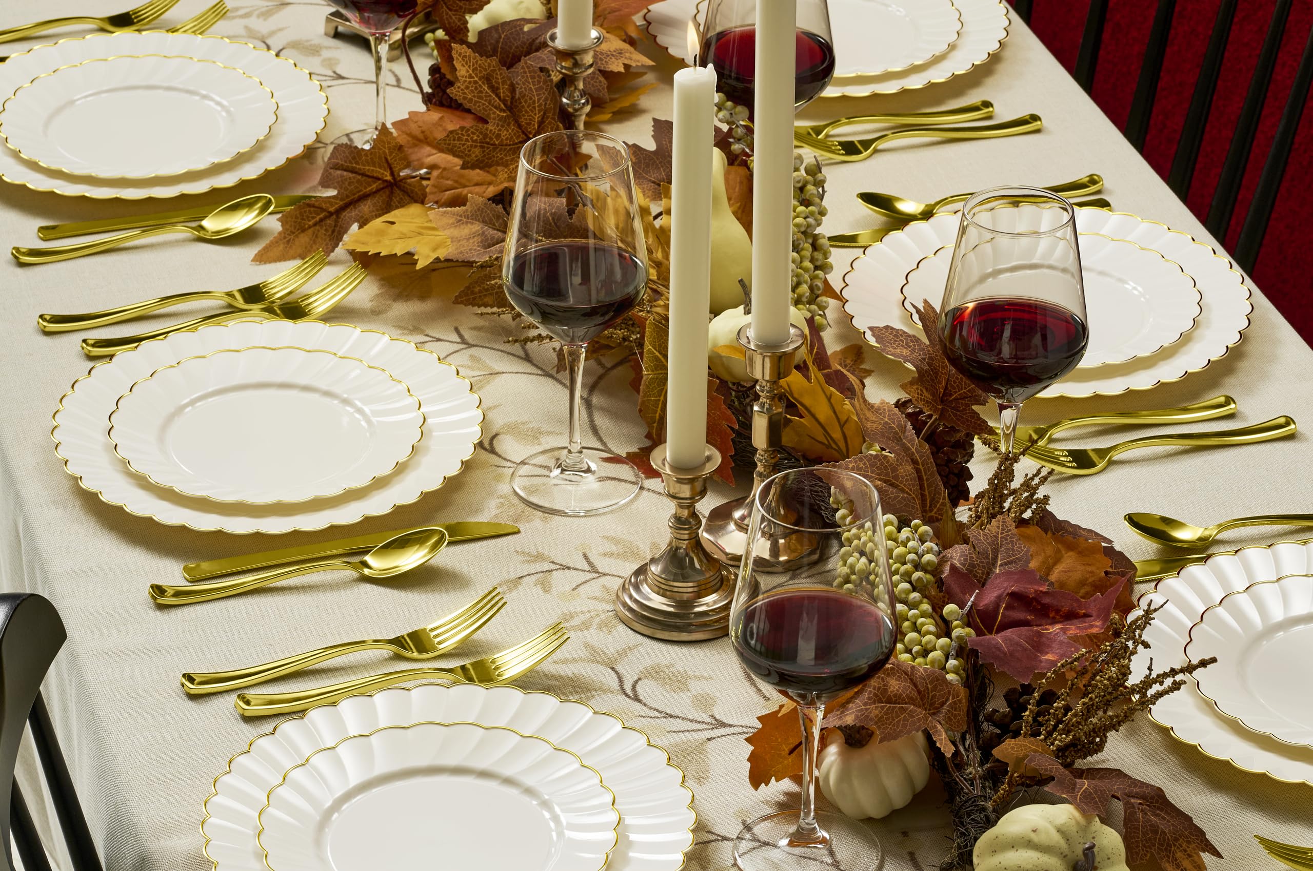 100 PC ELEGANT DISPOSABLE PLATES SET – Includes 50 dinner plates (10.25”) and 50 dessert plates (7.5”). A complete set of party plates for Thanksgiving dinner, Friendsgiving meals, and seasonal celebrations.