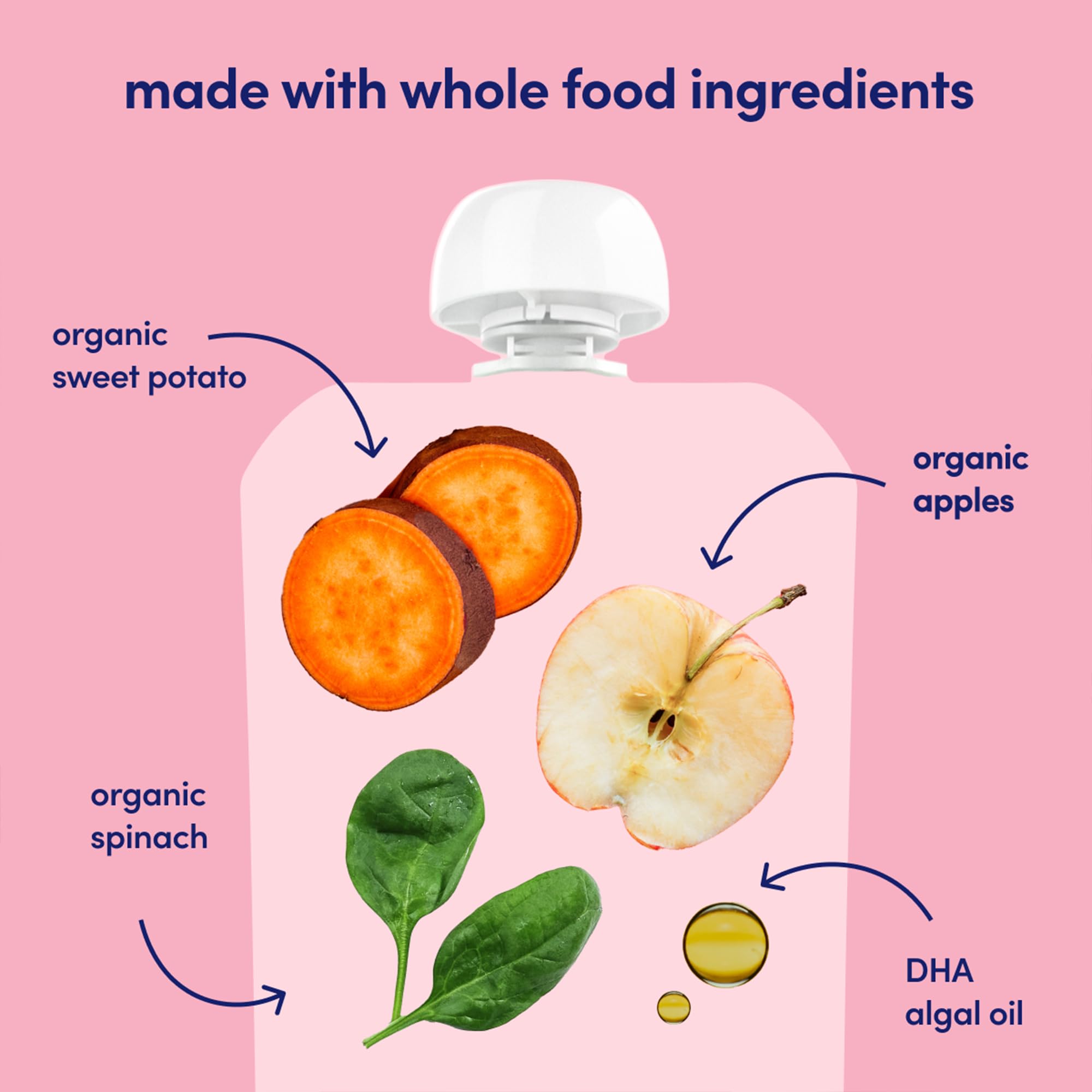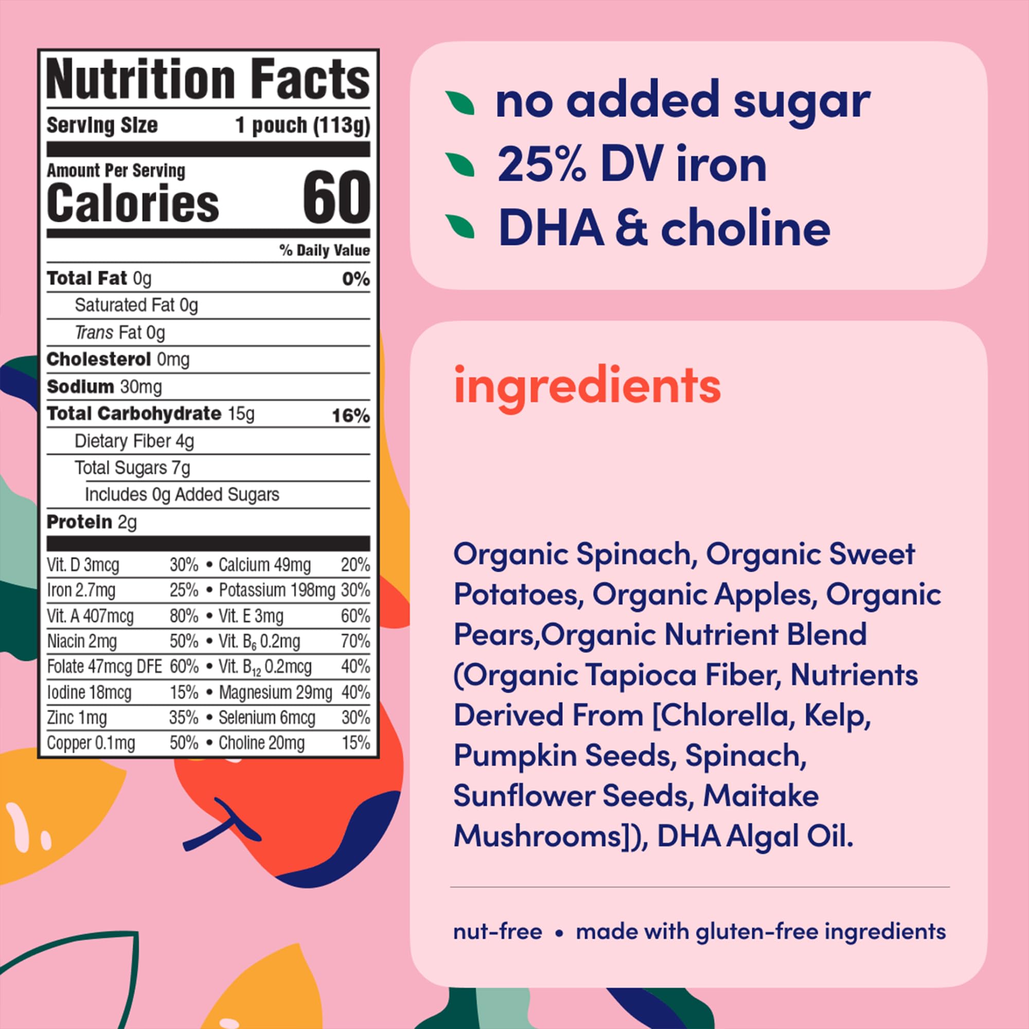 VEGGIE FIRST & NO ADDED SUGAR β Made with spinach, apple & sweet potato, no added sugar, gluten, dairy or nuts