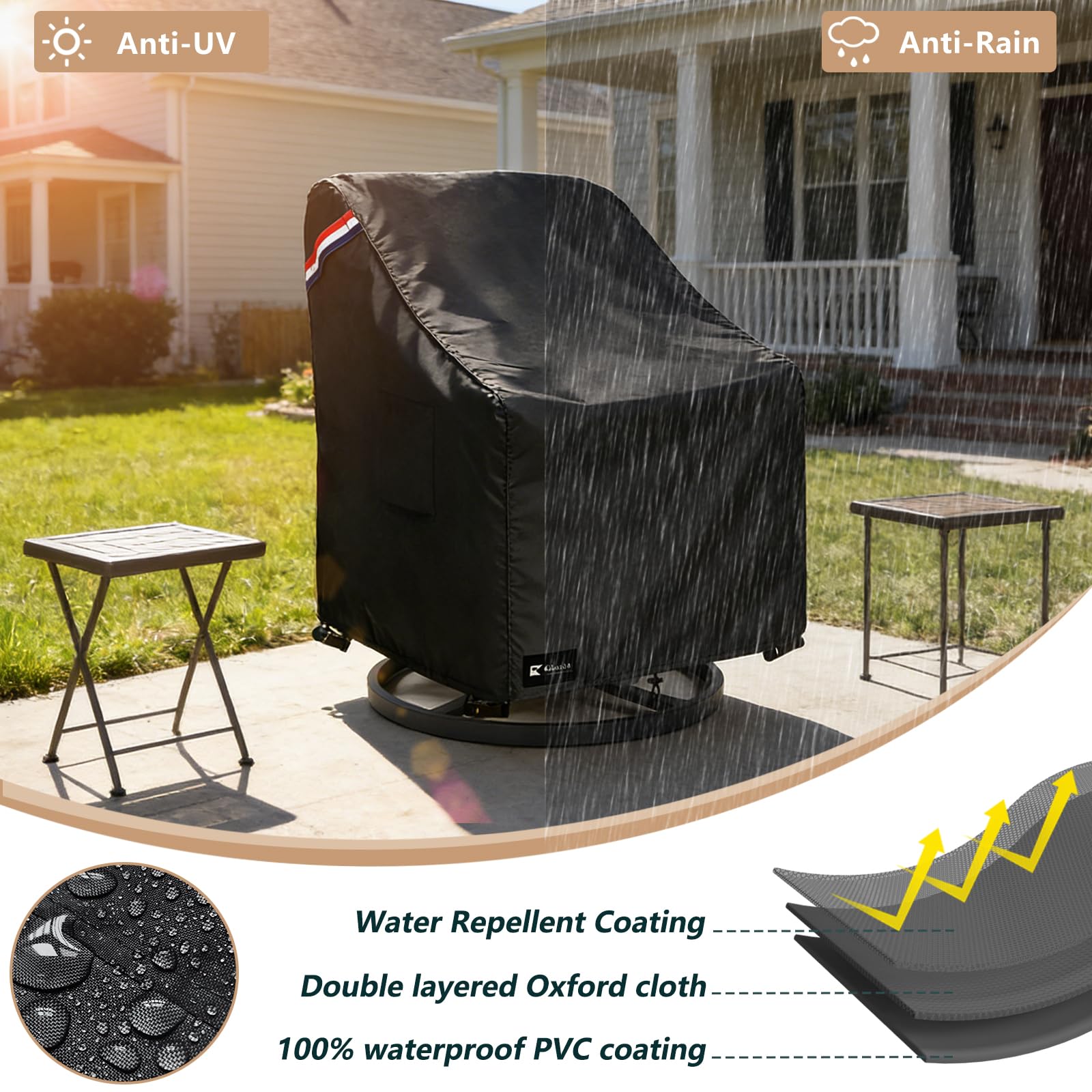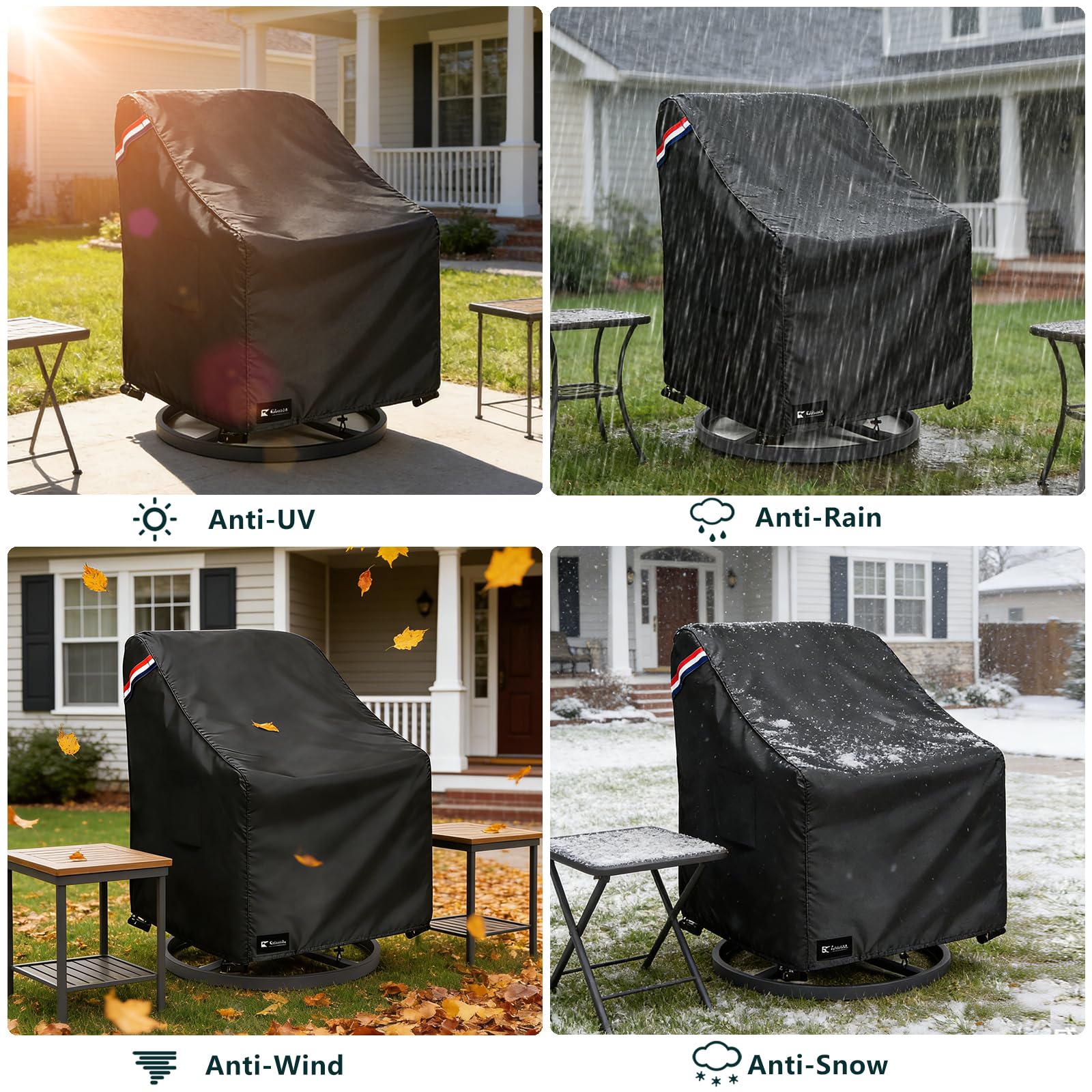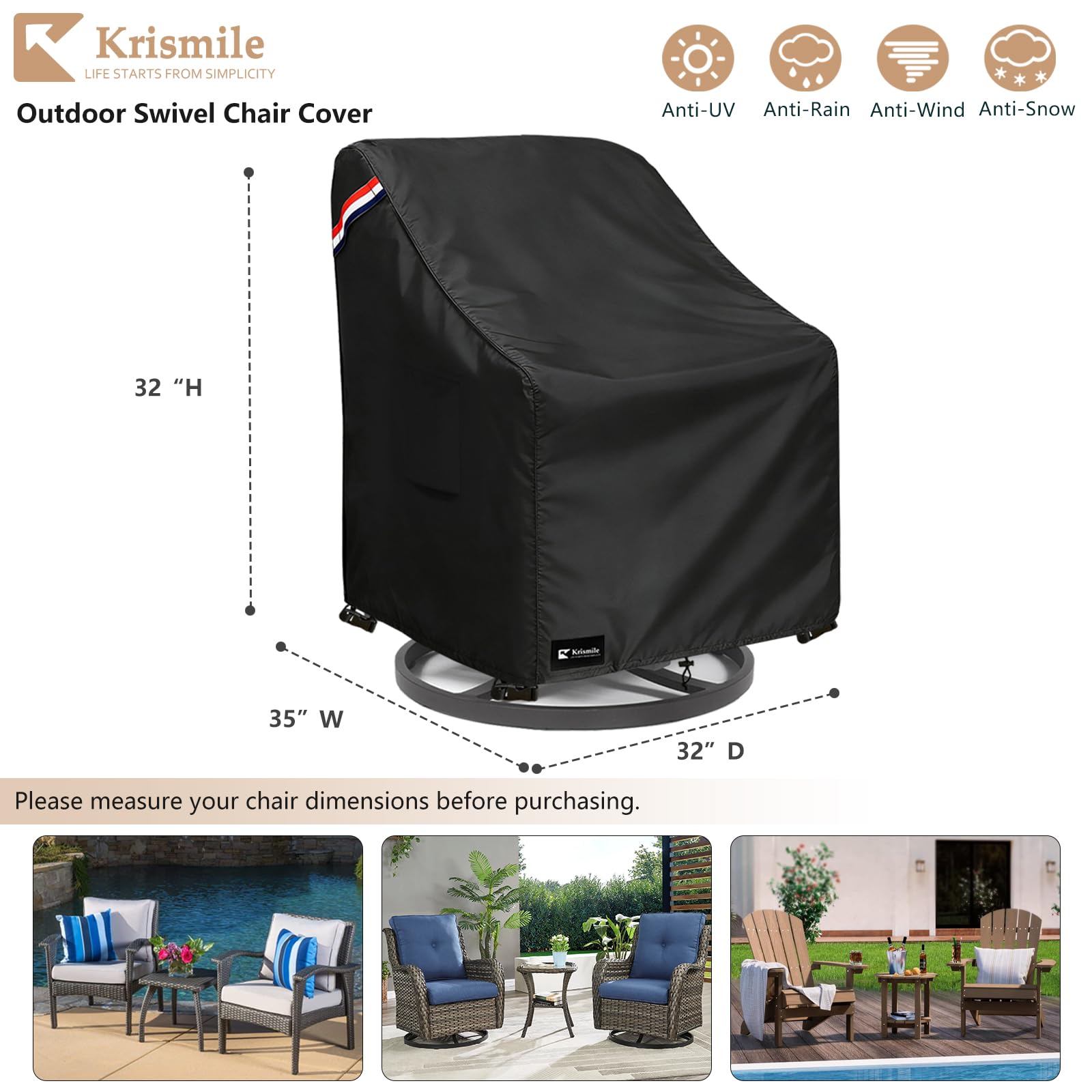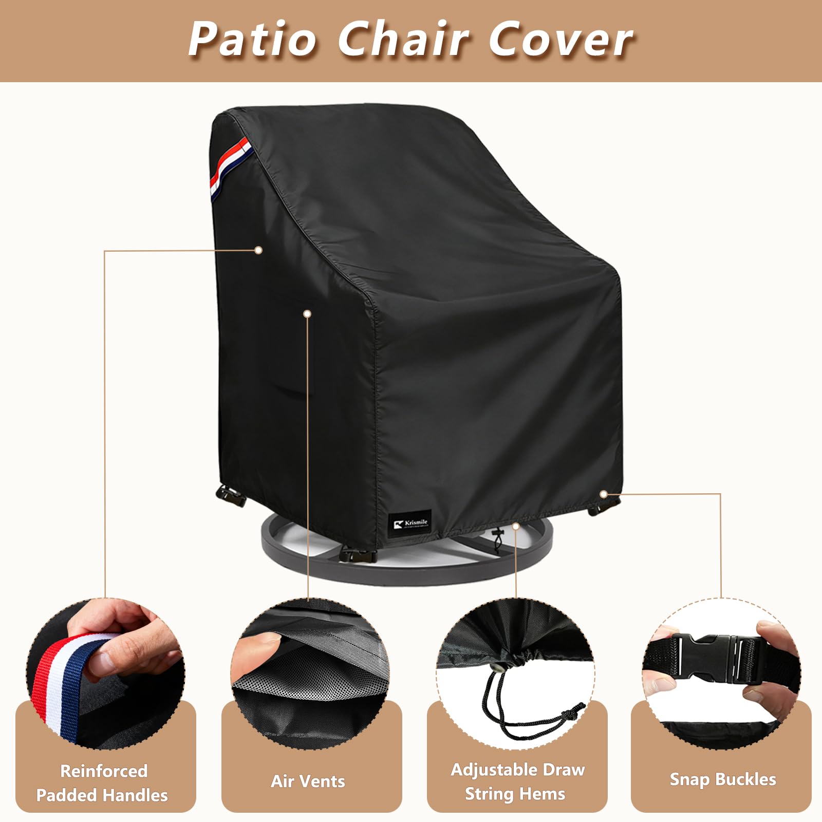 Quality Materials: Krismile patio furniture covers is made of 600D durable oxford fabric with waterproof coating backing,which is durable and tear resistant.It can cope with all kinds of bad weather, can prevent your chair from UV, rain, wind, dust, leaves, debris and garbages, provide full protection for your chair