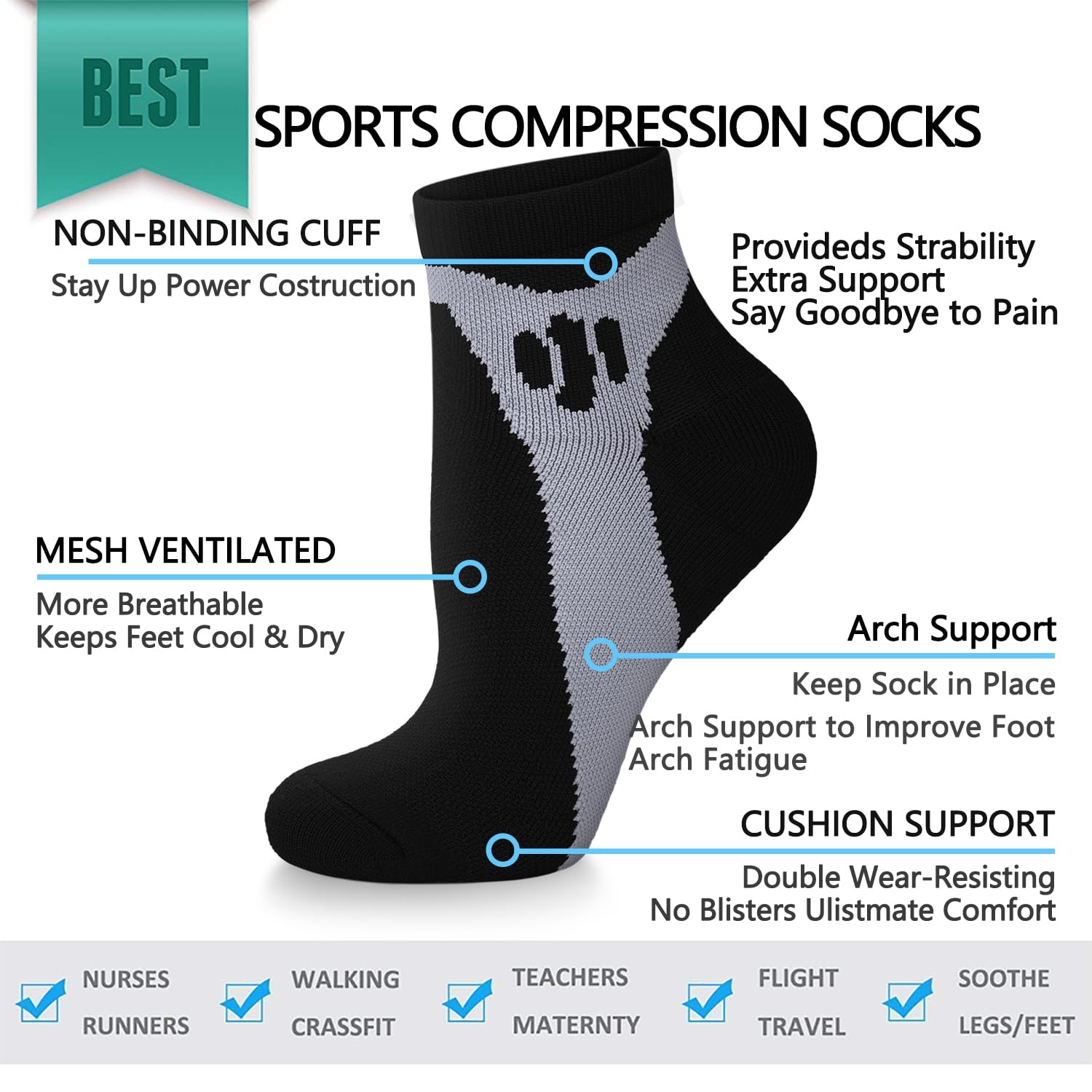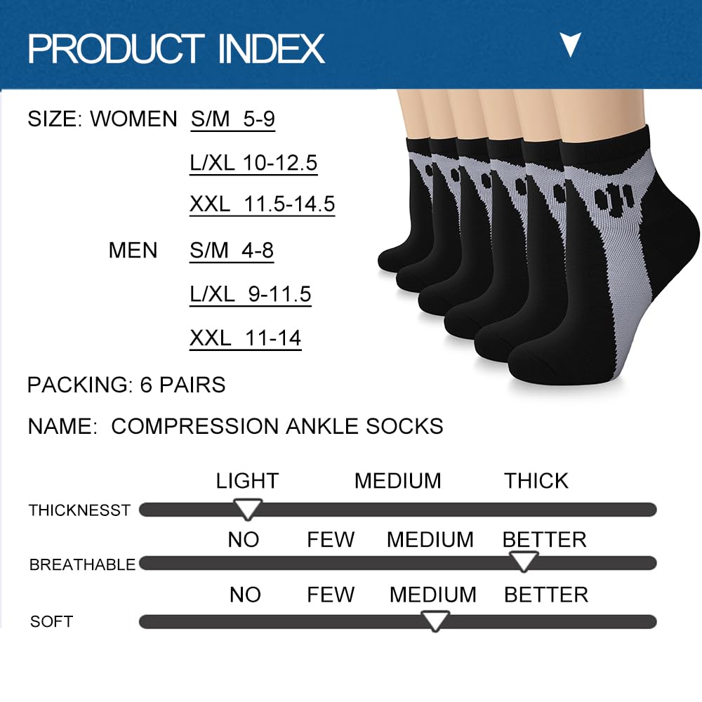 COMFORTABLE METERIAL AND CAREFUL CONSTRUCTION - Stay put Cuffs & Soothing feeling at the bottom and sides of foot, with no pinching seen with lesser quality socks without ankle support. Arch and Ankle Compression to relieve fatigue, Blister Control, Lightweight, Double Welt Top, Heel/Toe Design keeps feet comfortable and dry.