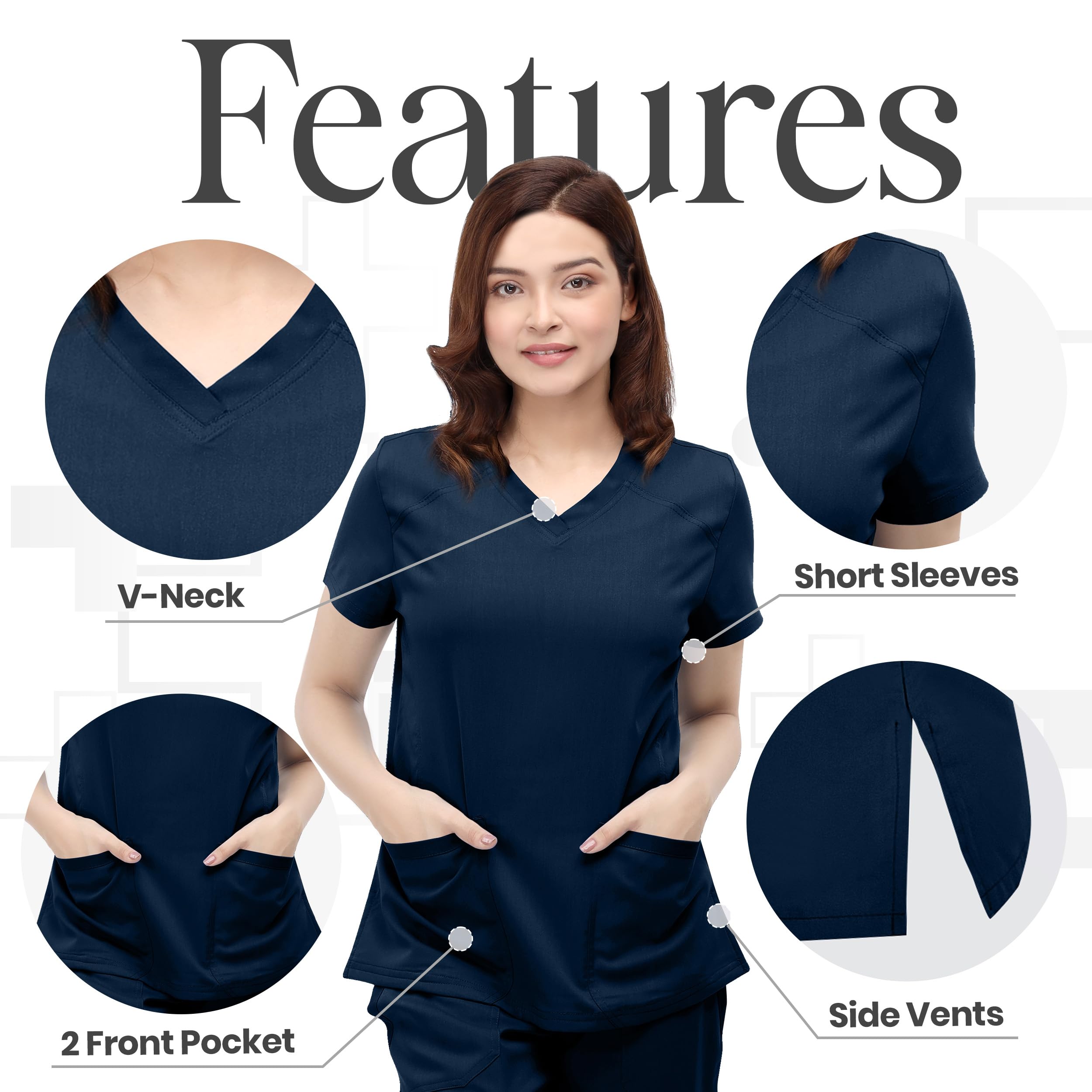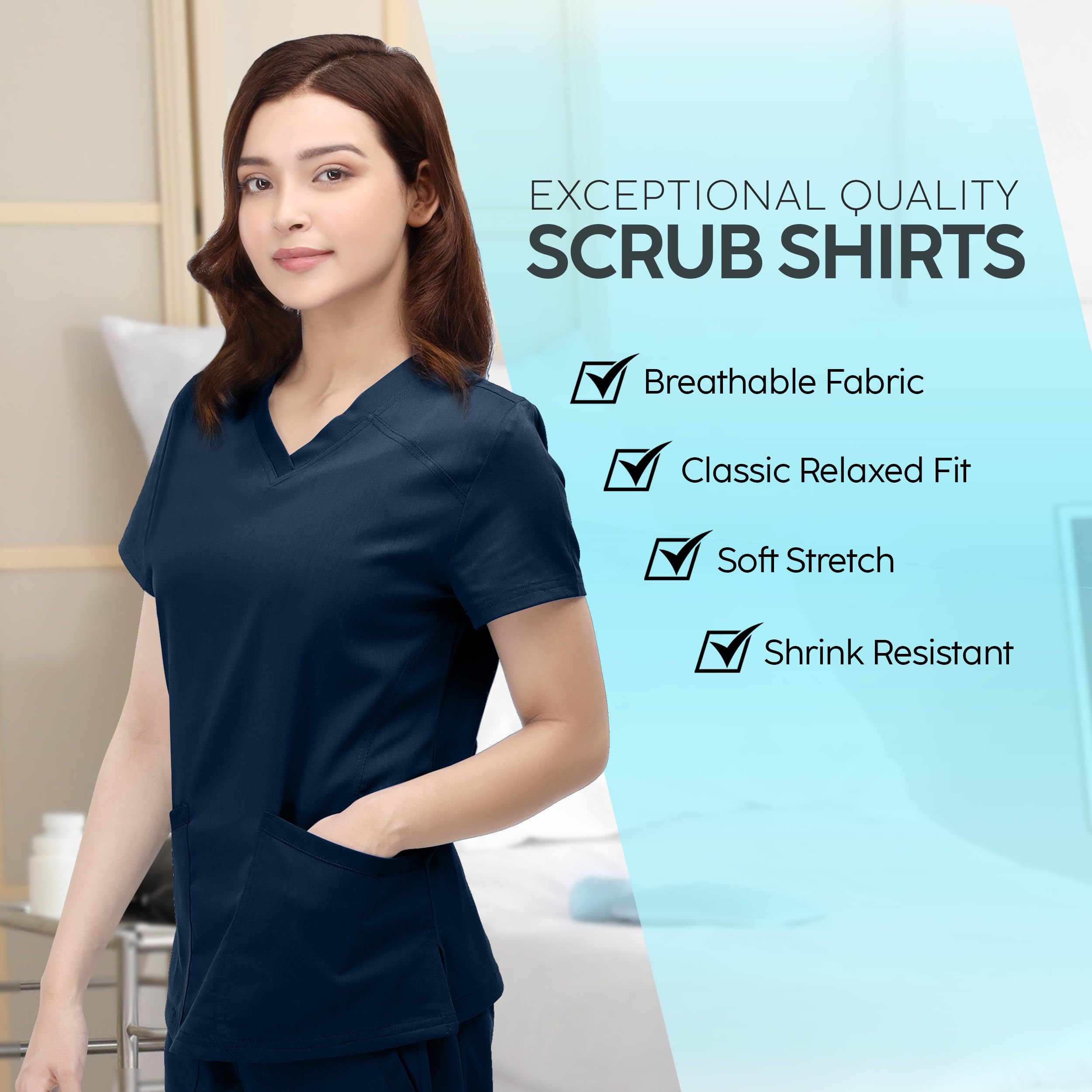 Durable Premium Fabric: Resilient fabric chosen for durability and comfort, providing a soft feel throughout the workday, making our women scrub tops durable and comfortable for long shifts.