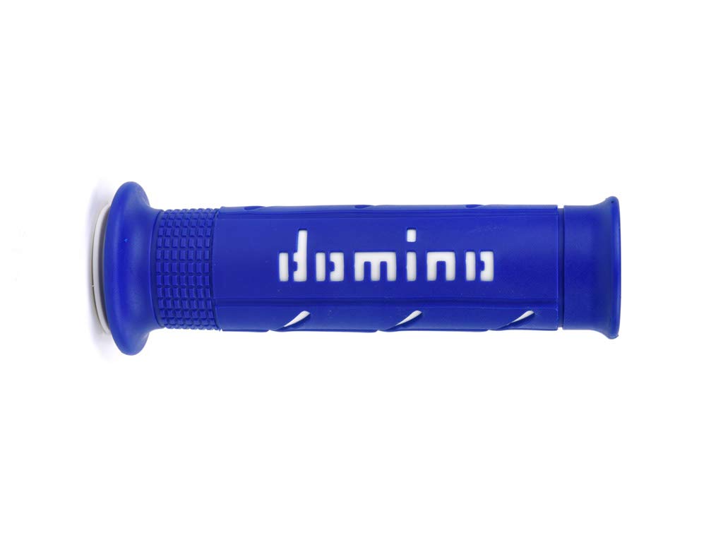 Rubber grip Domino Blue/White A25041 °C4648B7 work Domino rubber grip off-road - Open - Colour: Blue/White Handlebar diameter: 22 mm - Length: 126 mm - Inner diameter: 22 mm left, 24 mm right Rubber grip has an additional hole to safety wire on/off installation. With the help of the safety wire slip grips even in bad weather It doesn't.