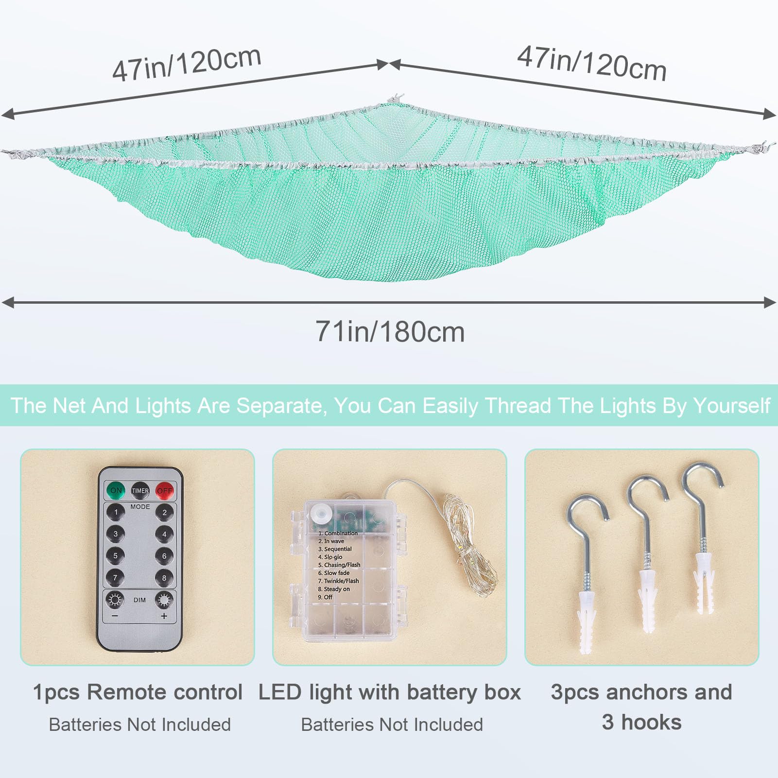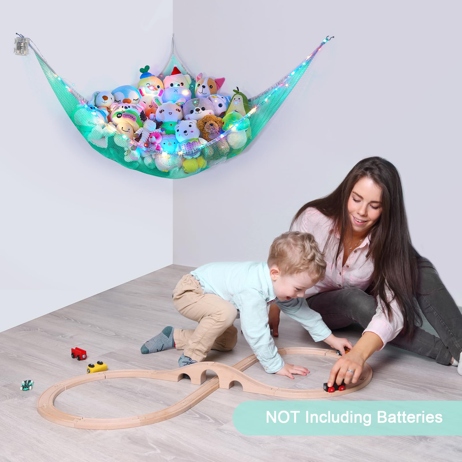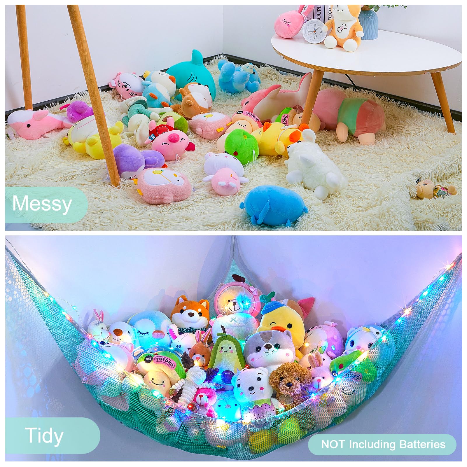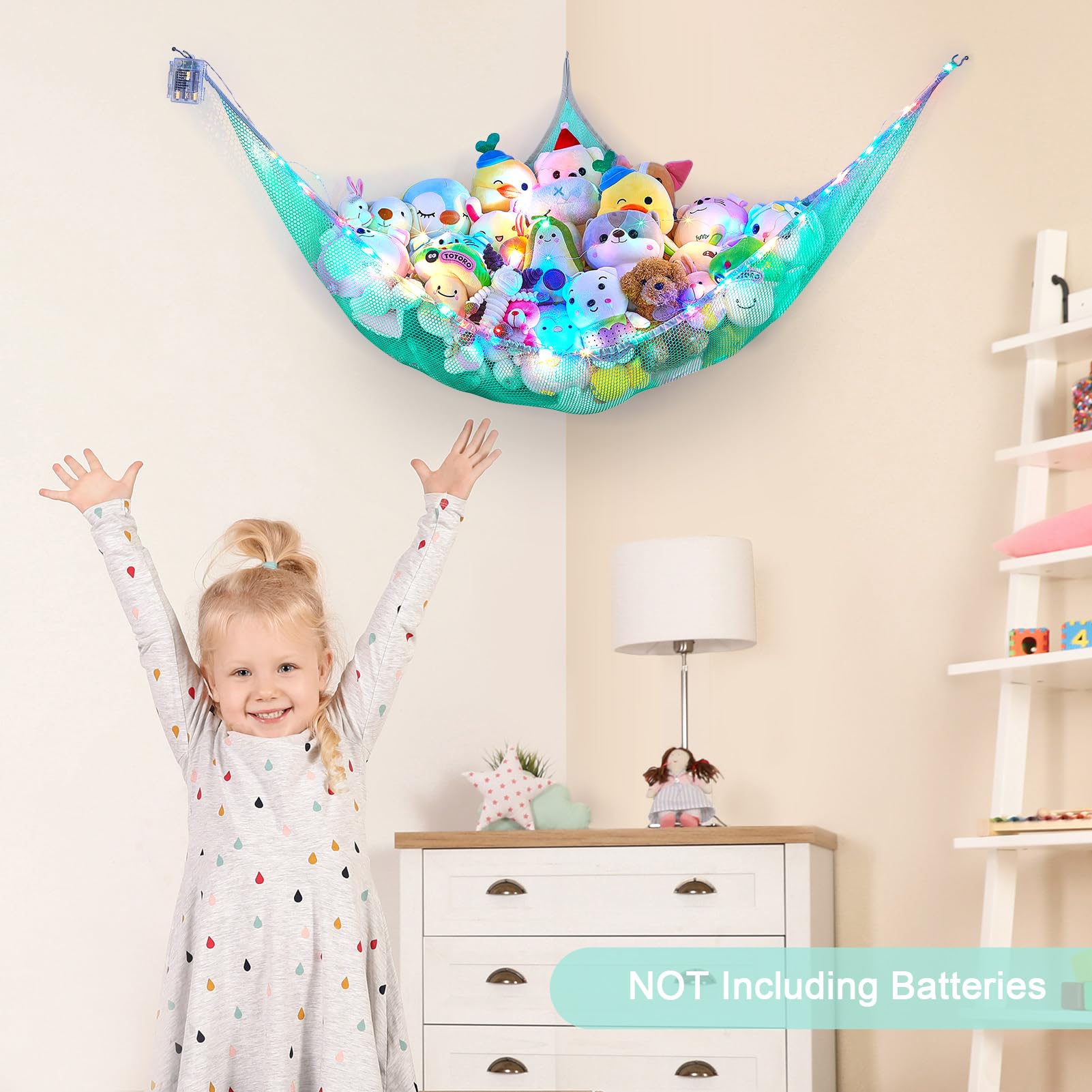 Package Included: 1pcs stuffed animal hammock, 1pcs 118 inches LED string light with battery box; Batteries not included; 3 pcs wall hooks for installation