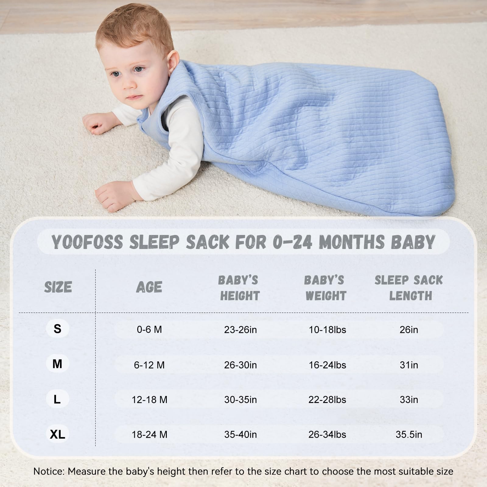 Warm Tip: The winter sleep sack can be inner-layered with warmer sleepwear for chiller temperatures and suitable for room temperatures 61°F- 68°F . There are 4 sizes available for your choices: S(0-6Months/10-18lbs), M (6-12 Months/16-24lbs), L(12-18 Months/22-28lbs), XL(18-24 Months/26-34lbs).Please refer to our size chart carefully before you order our wearable blanket baby.
