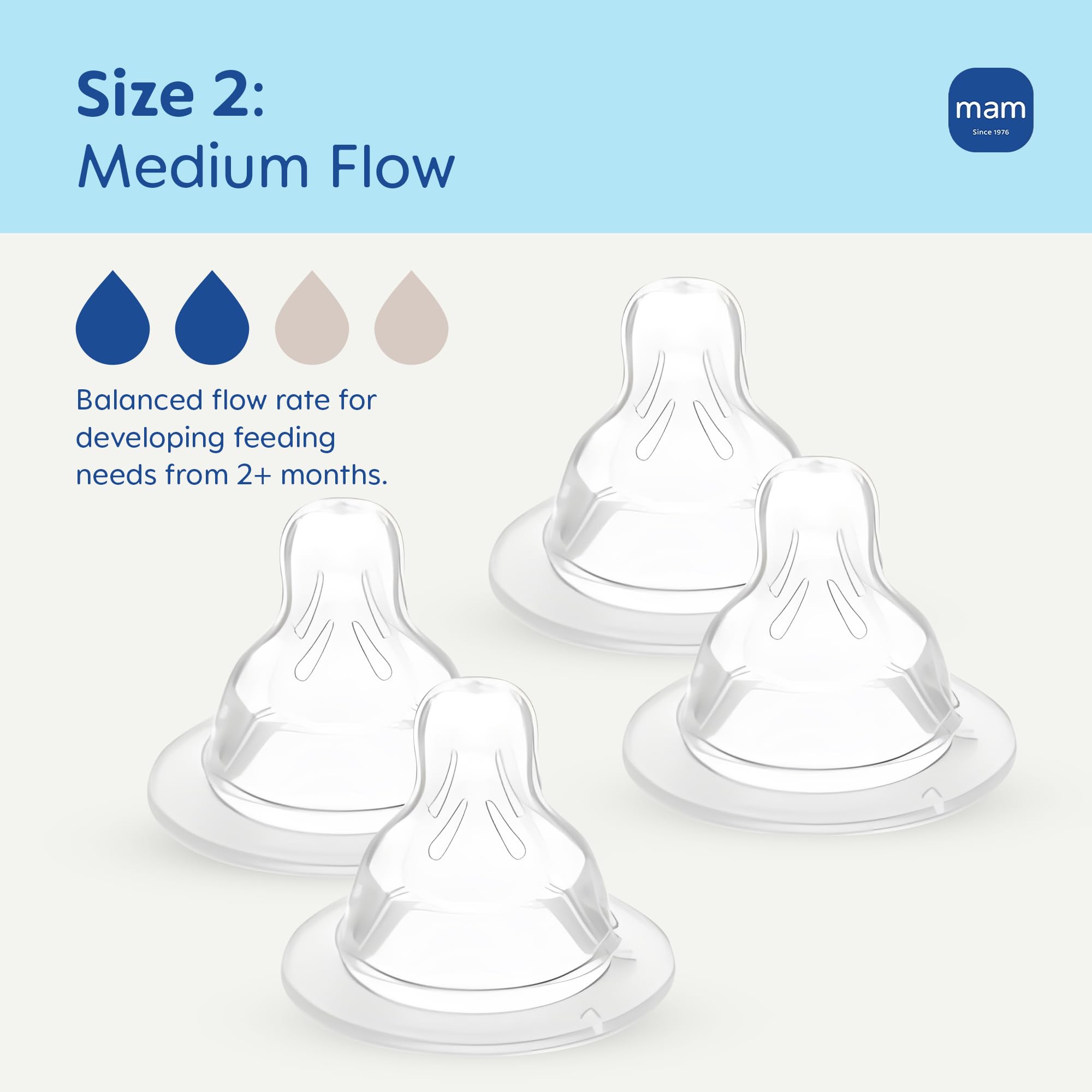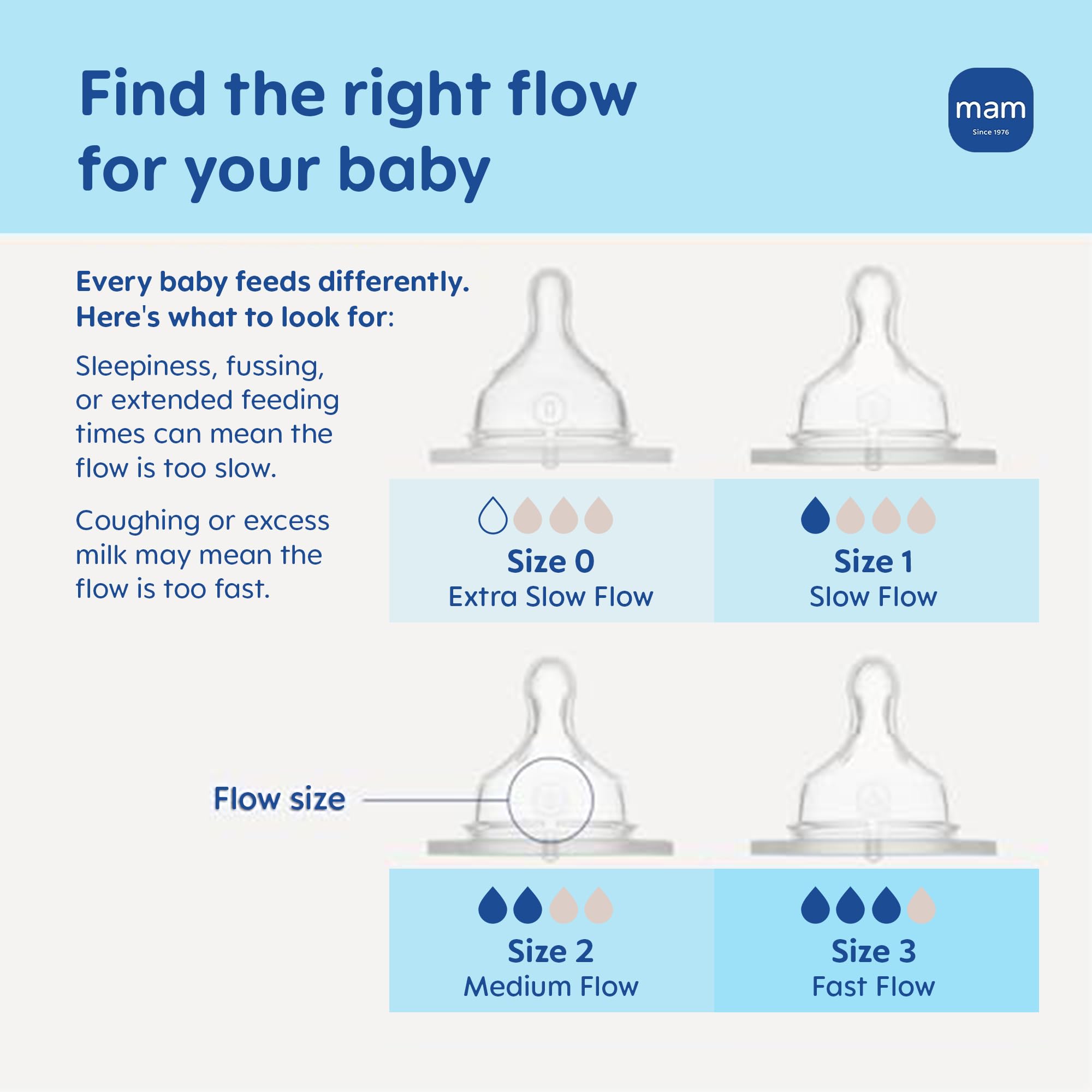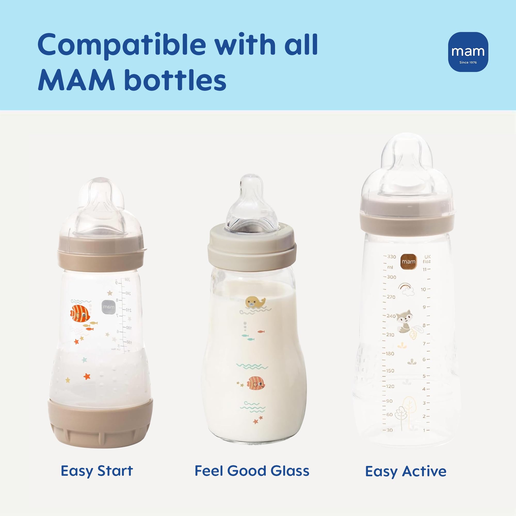NIPPLE COMFORT AND LATCH - Due to their unique flat and symmetrical design, MAM baby bottle nipples fit perfectly into baby's mouth. They also fit all MAM feeding bottles.