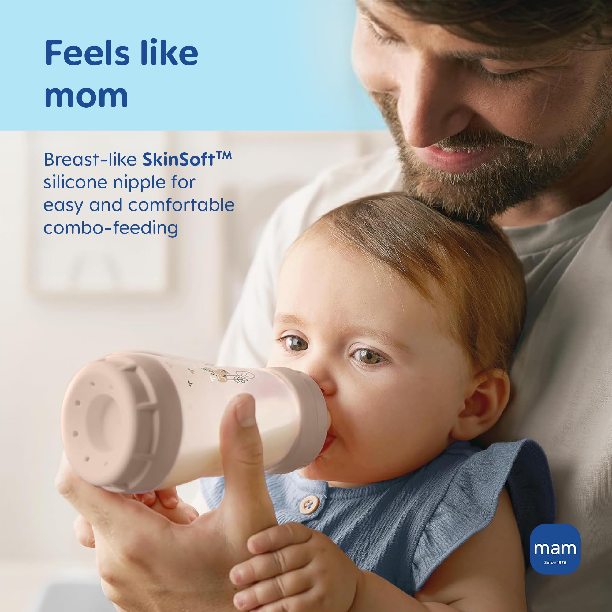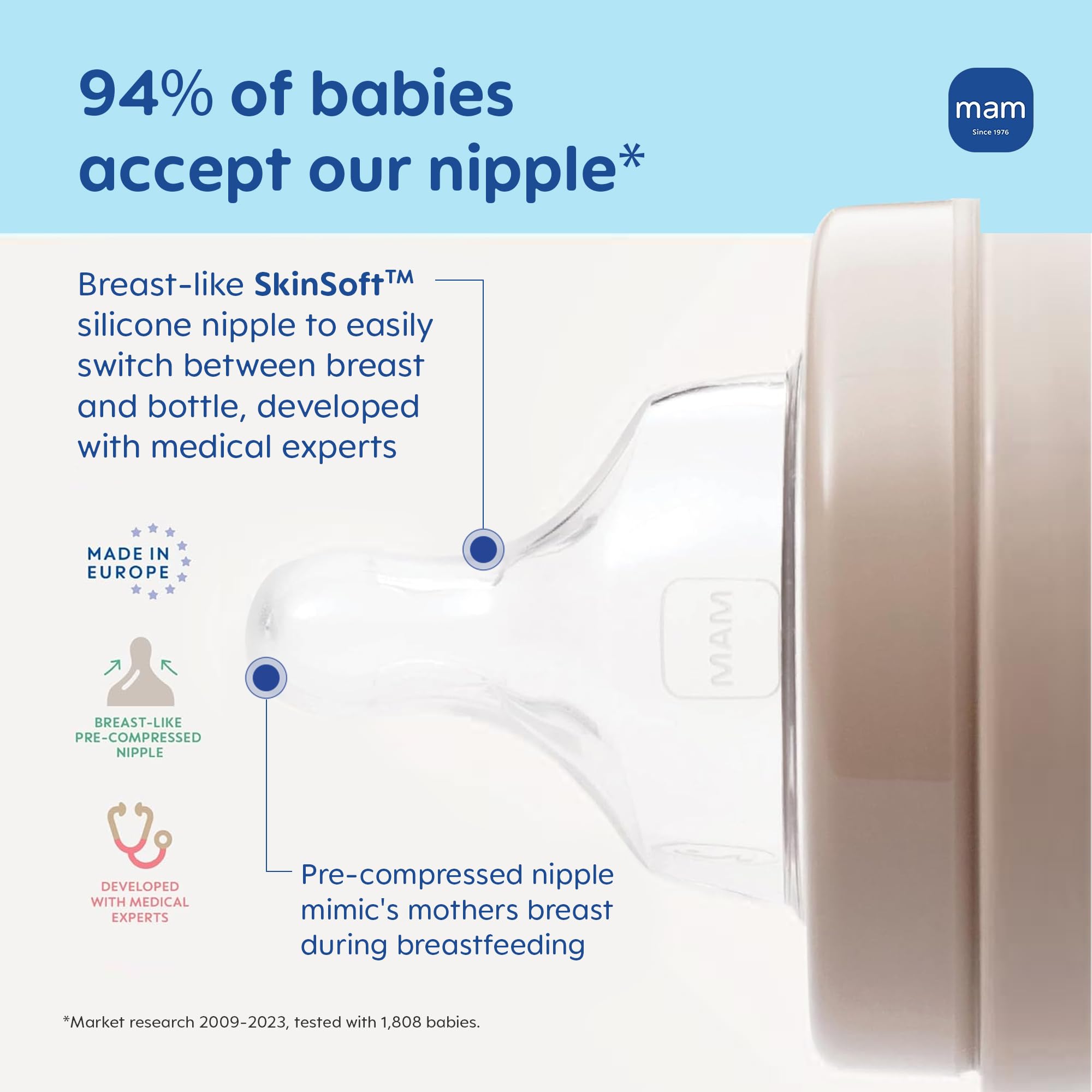 BREAST-LIKE NIPPLES- The SkinSoft BPA-free silicone nipple feels just like mom's skin during breastfeeding, which is why 94% of newborn and older babies accept MAM nipples.