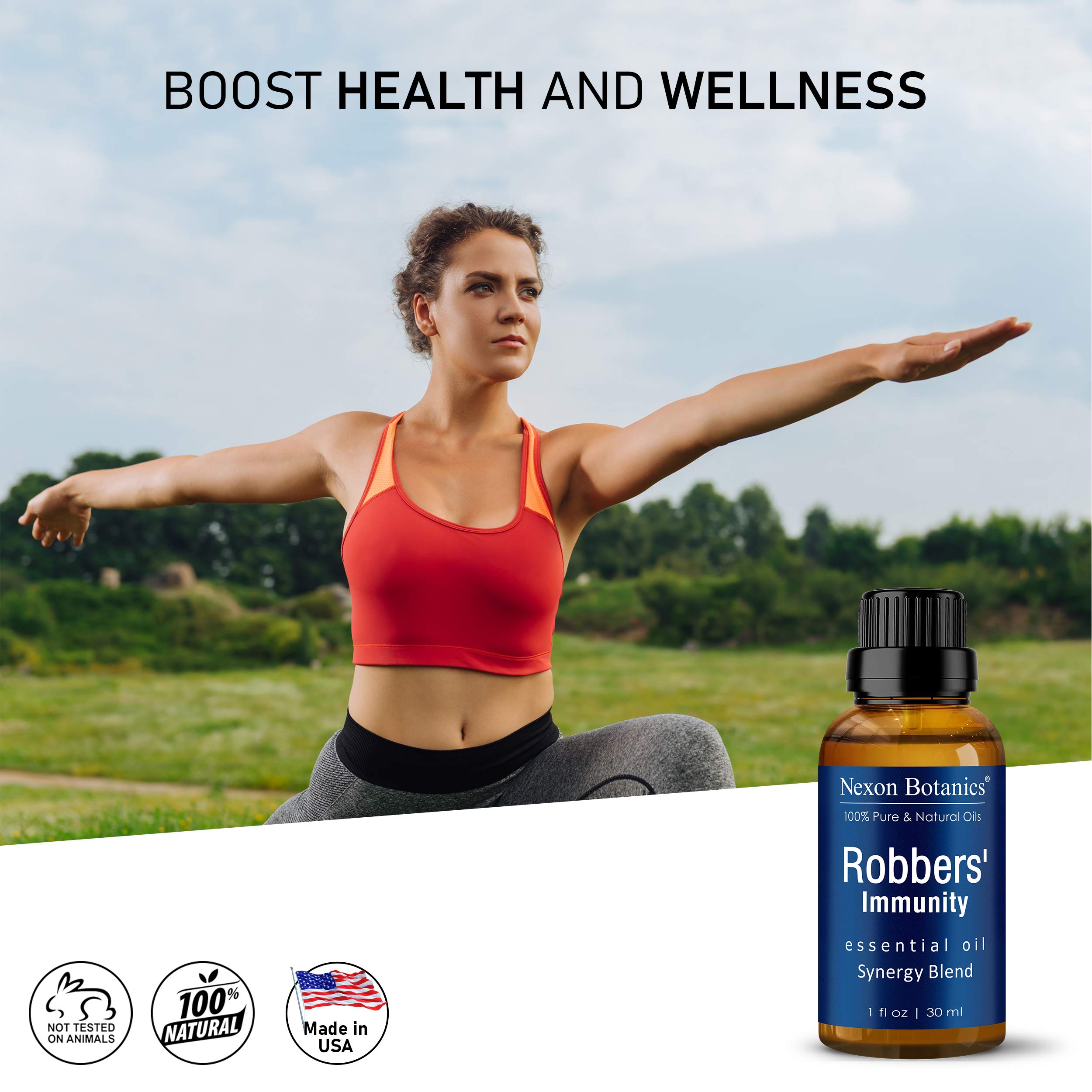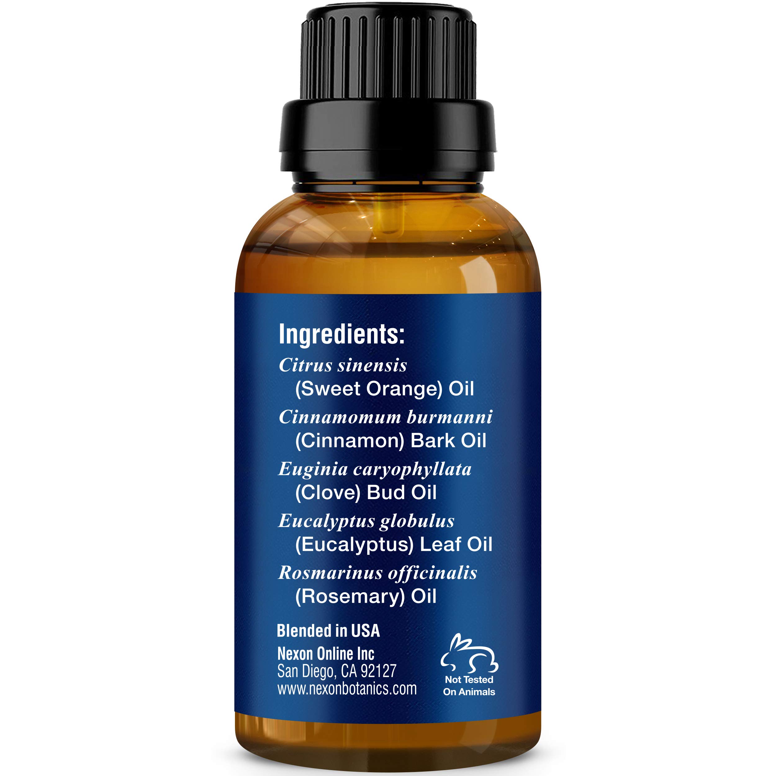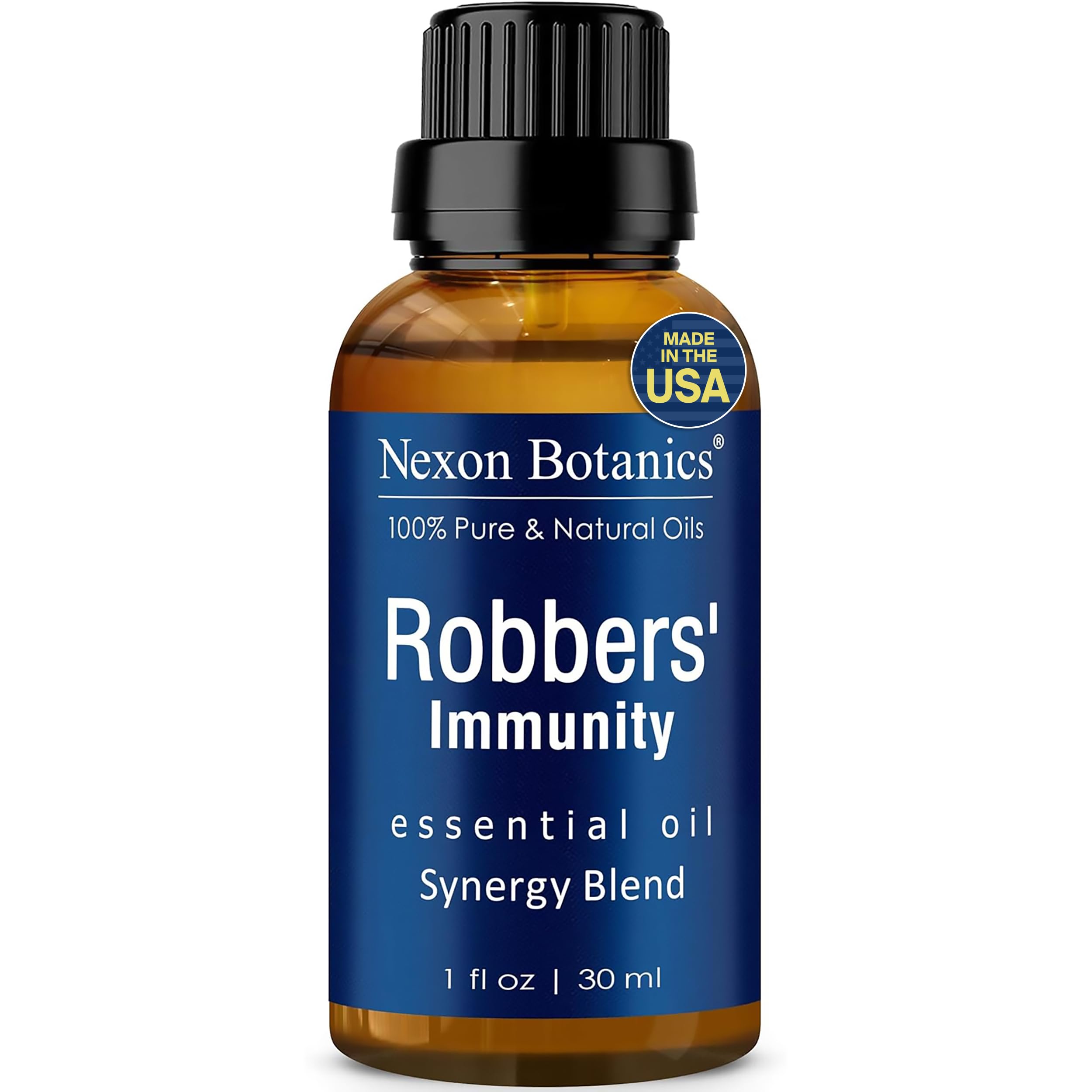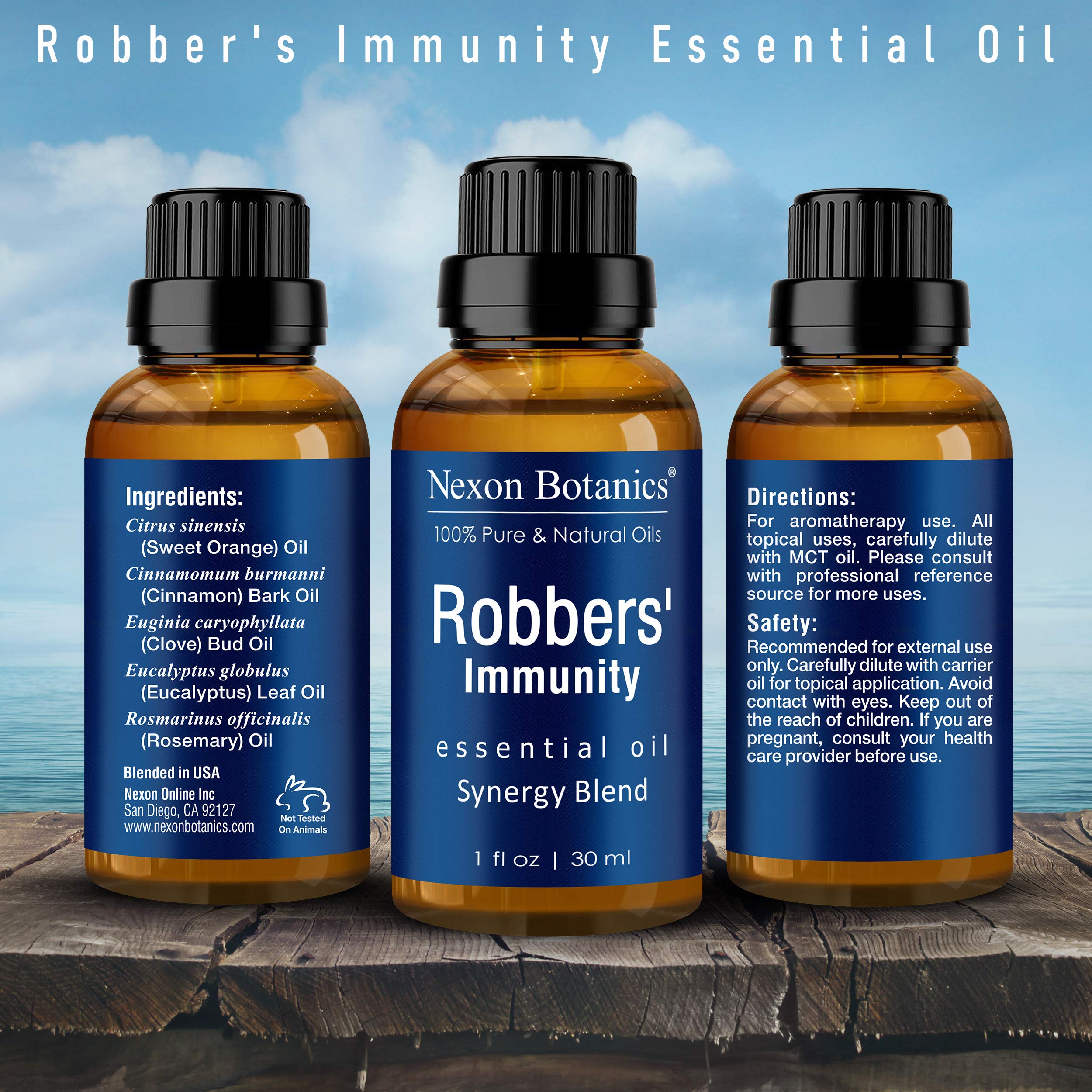 Nexon Botanics Robbers' Immunity Essential Oil Blend consists of a proprietary combination of five pure, natural, therapeutic-grade essential oils. Cinnamon, Clove, Eucalyptus, Rosemary, and Orange oils.