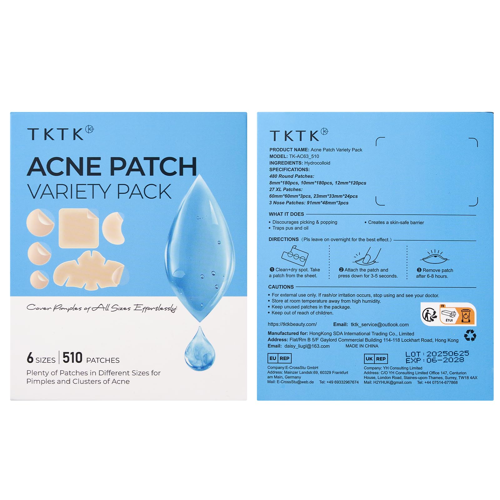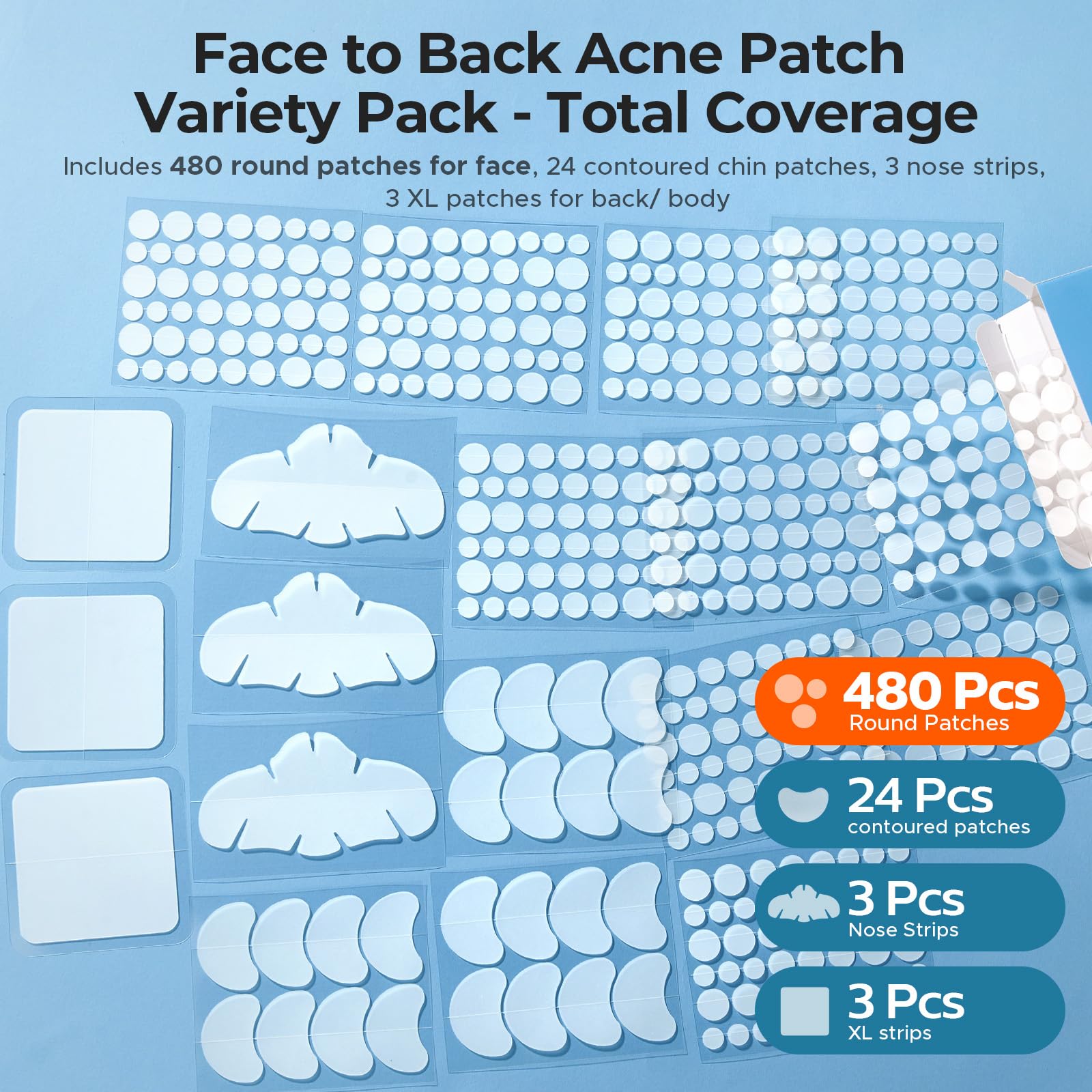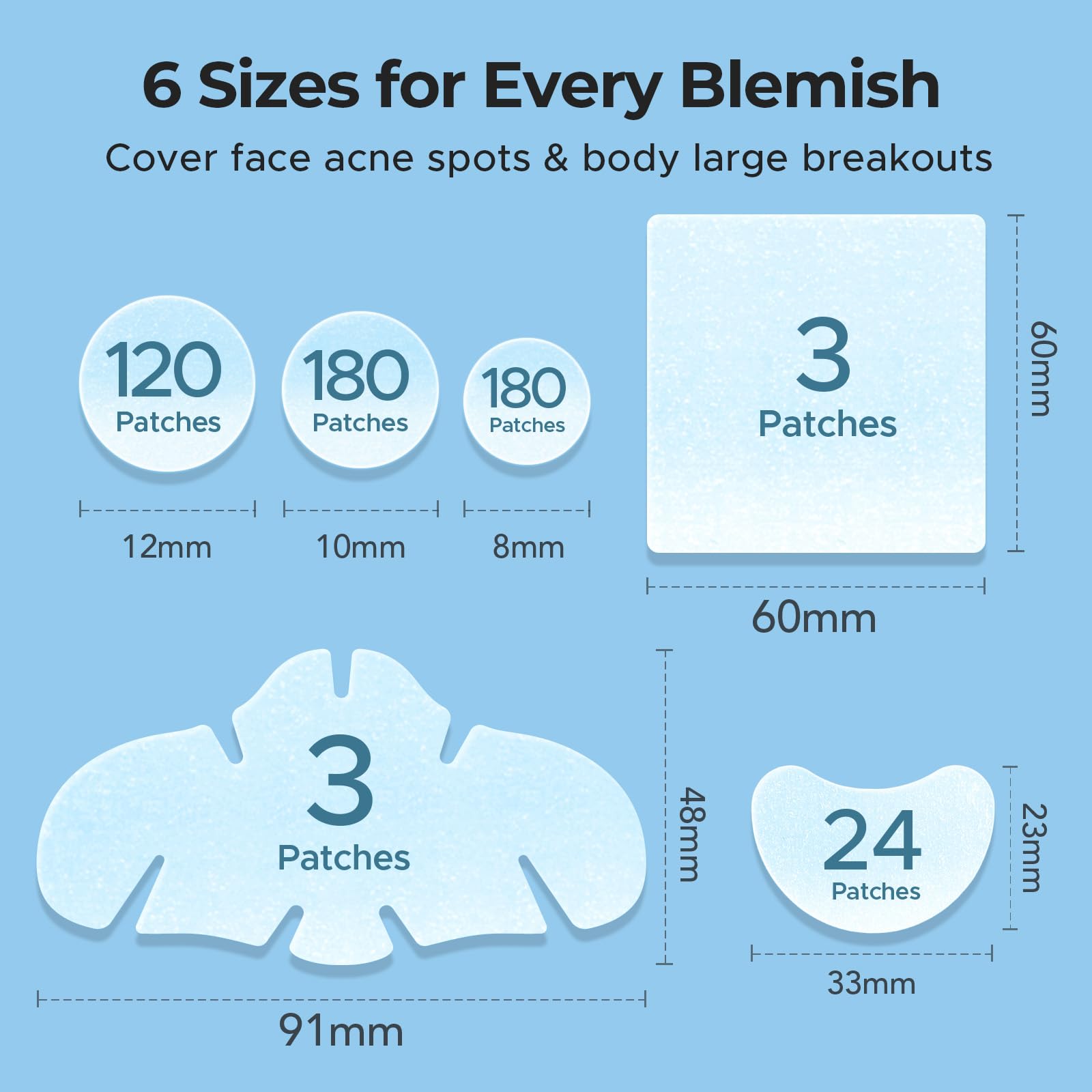 6-Size Versatile Coverage: Tackle breakouts anywhere with TKTK acne patch variety! Includes 8, 10, 12mm acne spot patches for small to medium zits; 60x60mm large pimple patches for back or cheeks breakouts; 91x48mm large nose strips for pores; and 23x33mm contoured patches for curved areas like chin and nose bridge. Perfect for face and body