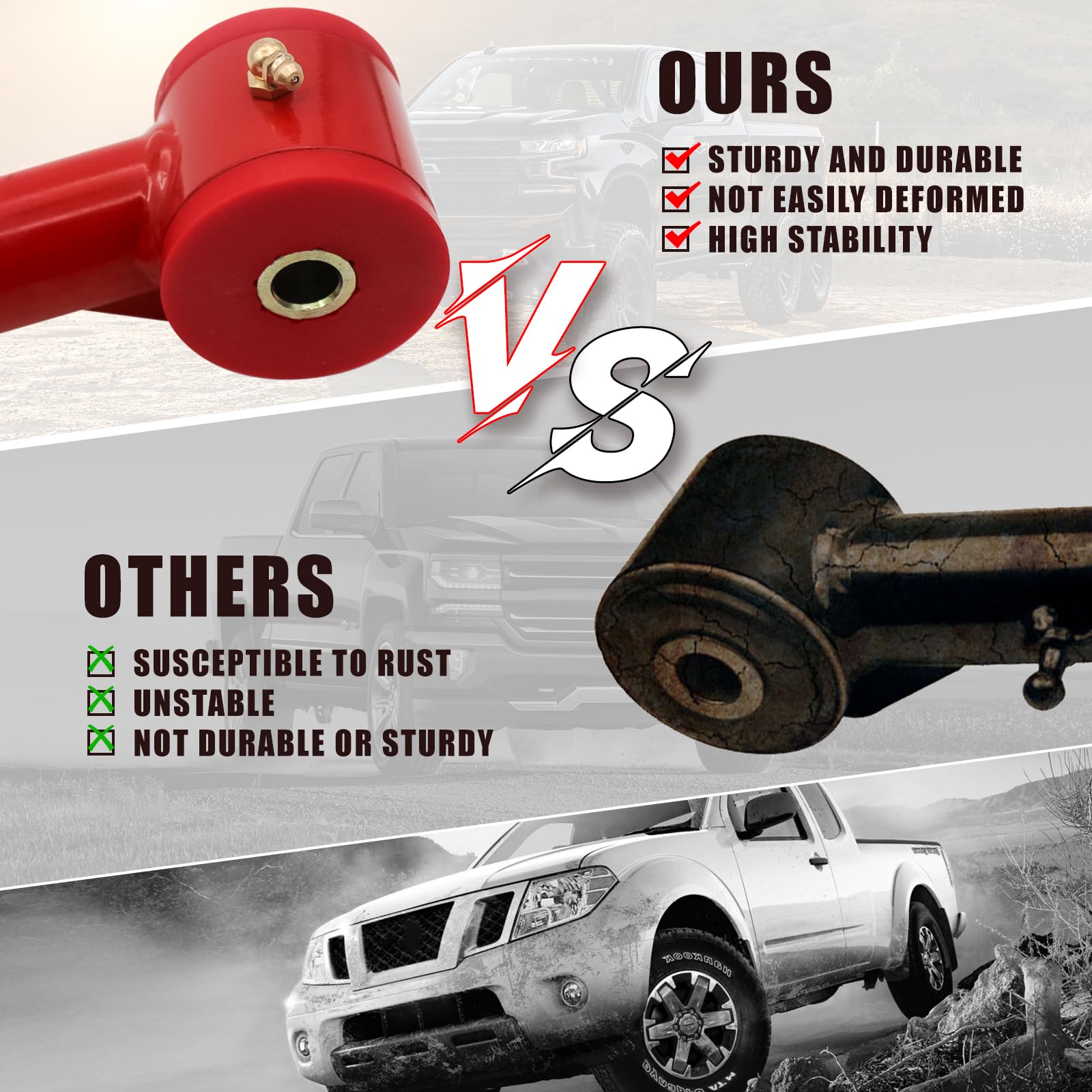 Safety & Stability: Tubular arm bushings offer superior durability, while fully replaceable and greasable copper fittings ensure long-term reliability. Polyurethane bushings, with higher hardness than rubber, provide enhanced stability, particularly in extreme climates.