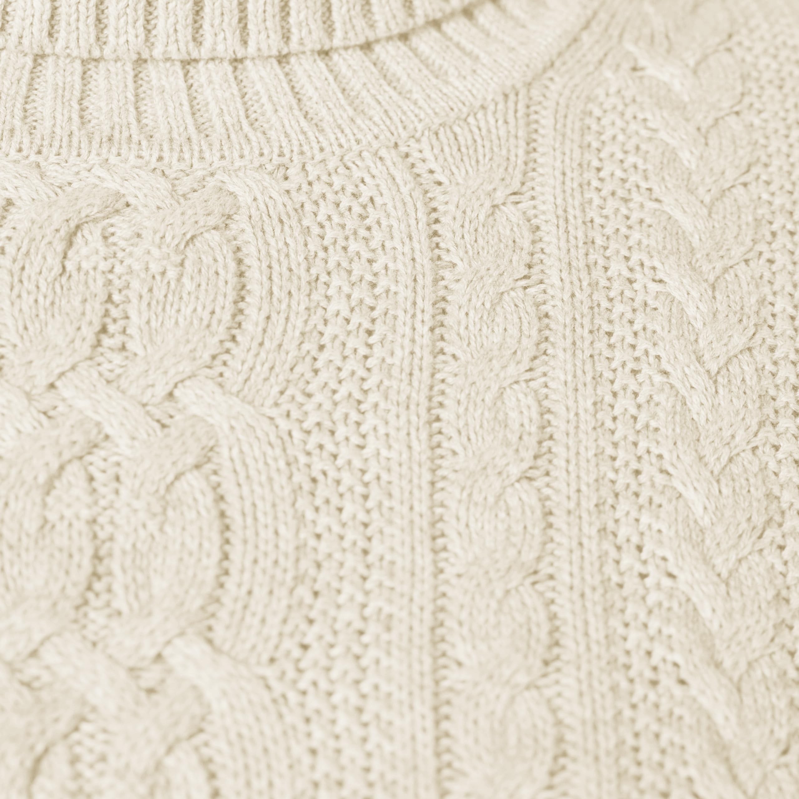 DETAILS: Features classic fisherman cable pattern, a fold-over turtleneck, long sleeves, and rib detail at neck, cuffs, and hem.
