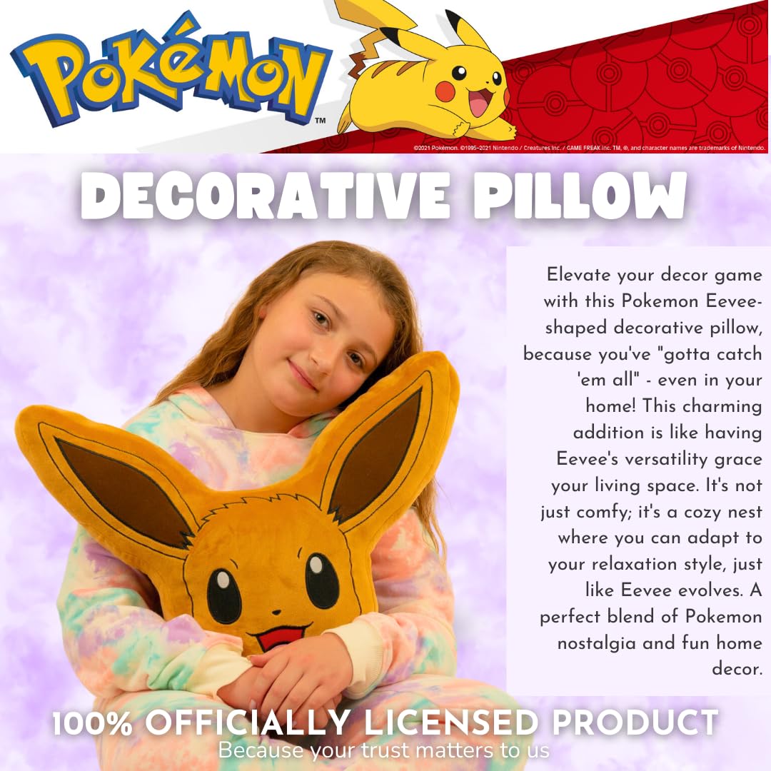 ITEM INCLUDES: This Eevee-shaped Pokémon plush pillow, measuring 20" tall, is an ideal cuddle companion for sleeping or lounging on the couch. Its adorable design adds a decorative touch to any space.
