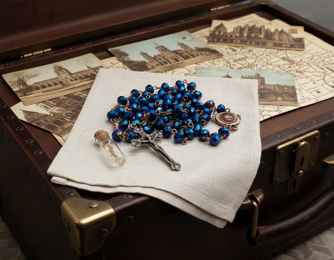 Catholic Deep Blue Crystal Beads Rosary – Features a vintage-style metal crucifix and a Jerusalem Holy Soil medallion at the center, symbolizing sacred connection and spiritual devotion.